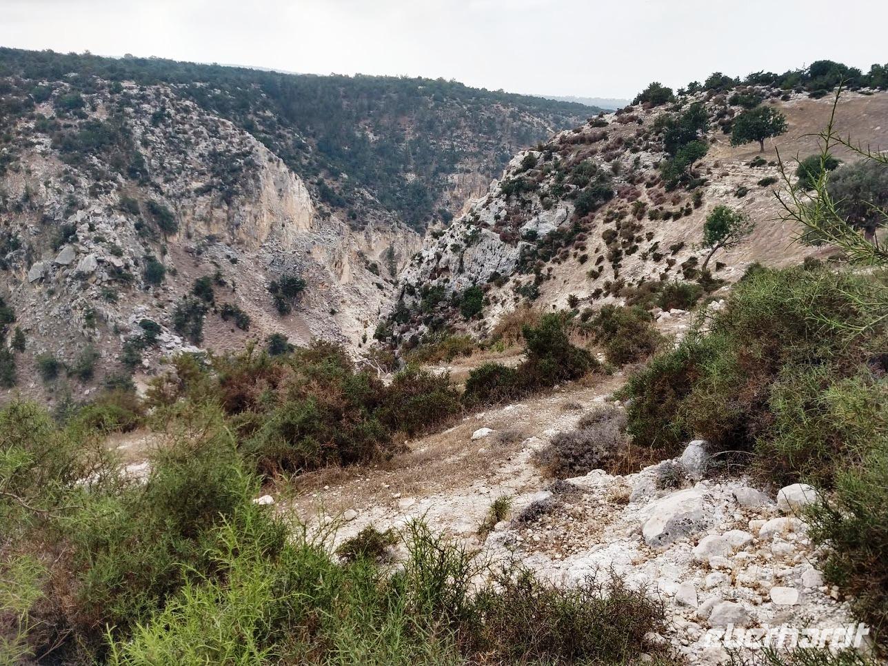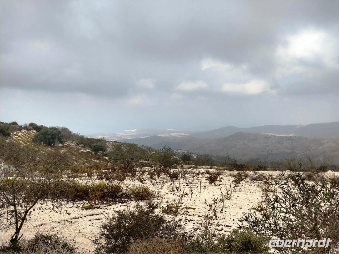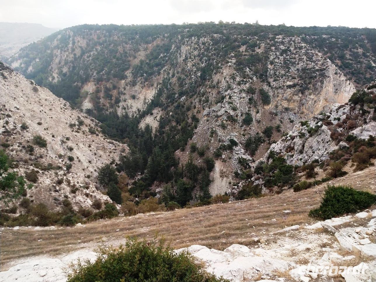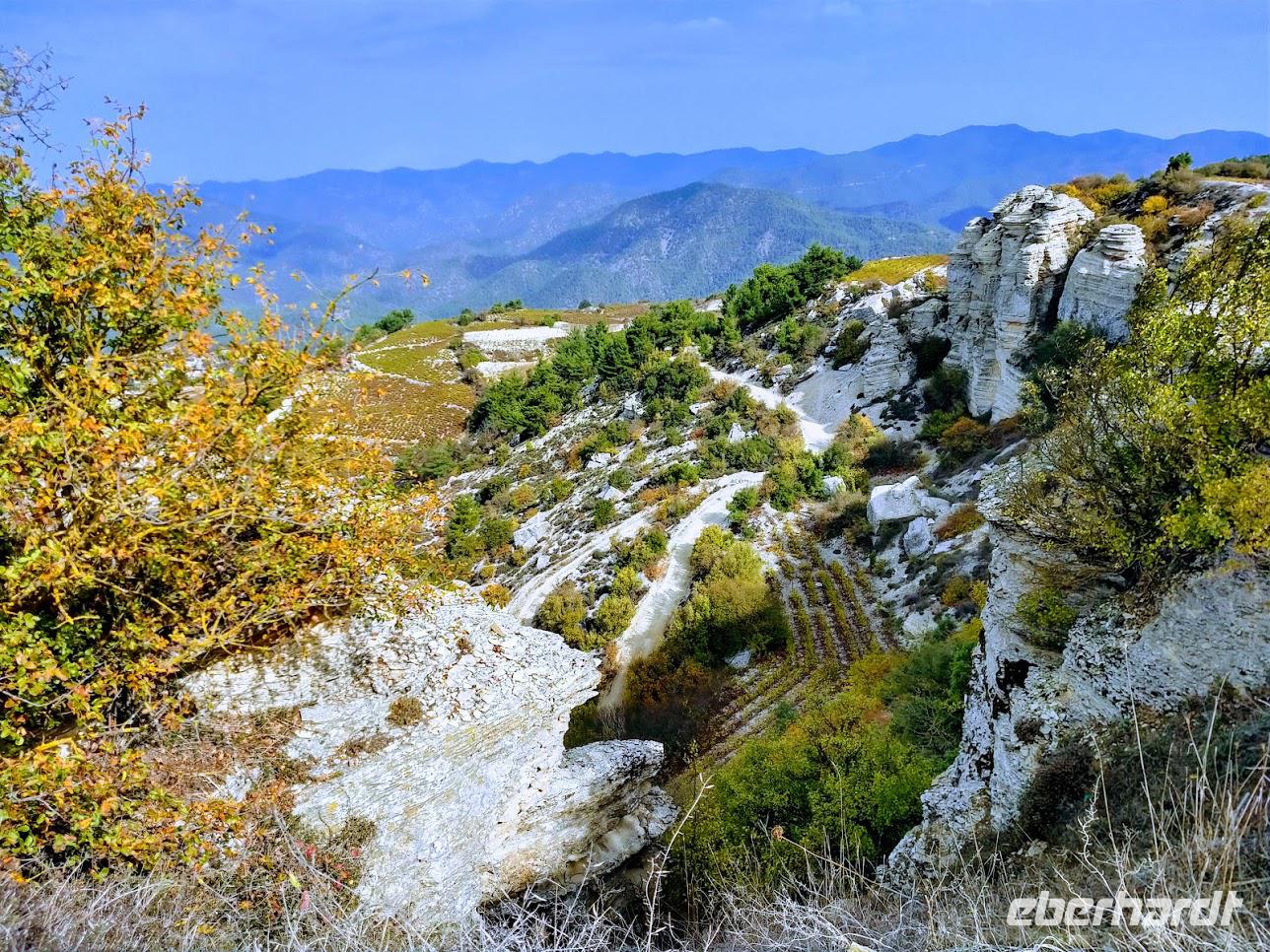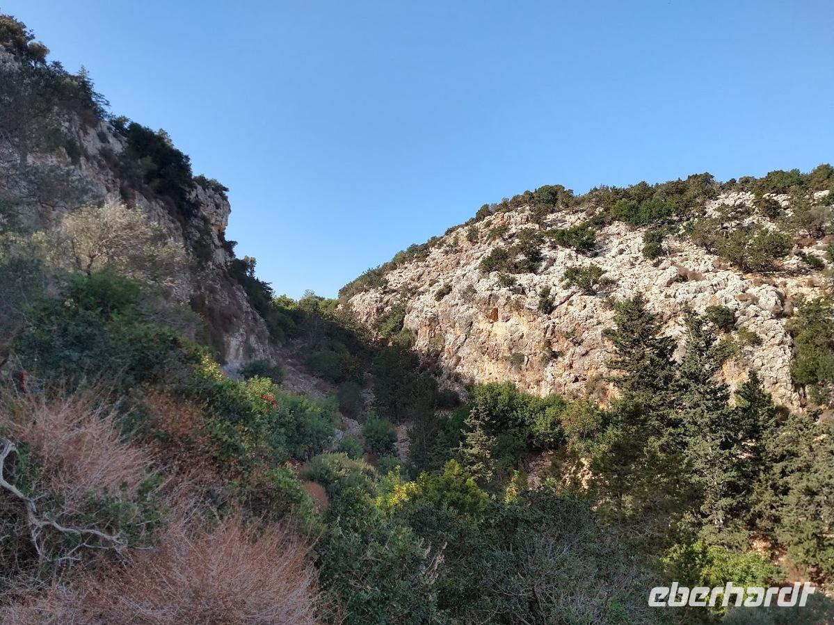 Vom Kalksteinplateau von Laona ist Ausgangspunkt unserer Wanderung. Leider bieten sich im ersten Abschnitt durch das trübe Wetter keine perfekten Aussichten auf die eigentlich nahe Küste. Erst durch Plantagen, dann auf alten Ziegenpfaden nähern wir uns Zyperns bekanntestem Canyon. Der Schluchtbereich ist dann auch sehr interessant. Sowohl die Felsformationen, die Tiefblicke in die Schlucht und als auch die Pflanzenwelt sind sehenswert. Wir identifizieren Herbstblausterne und blühende Meereszwiebeln.