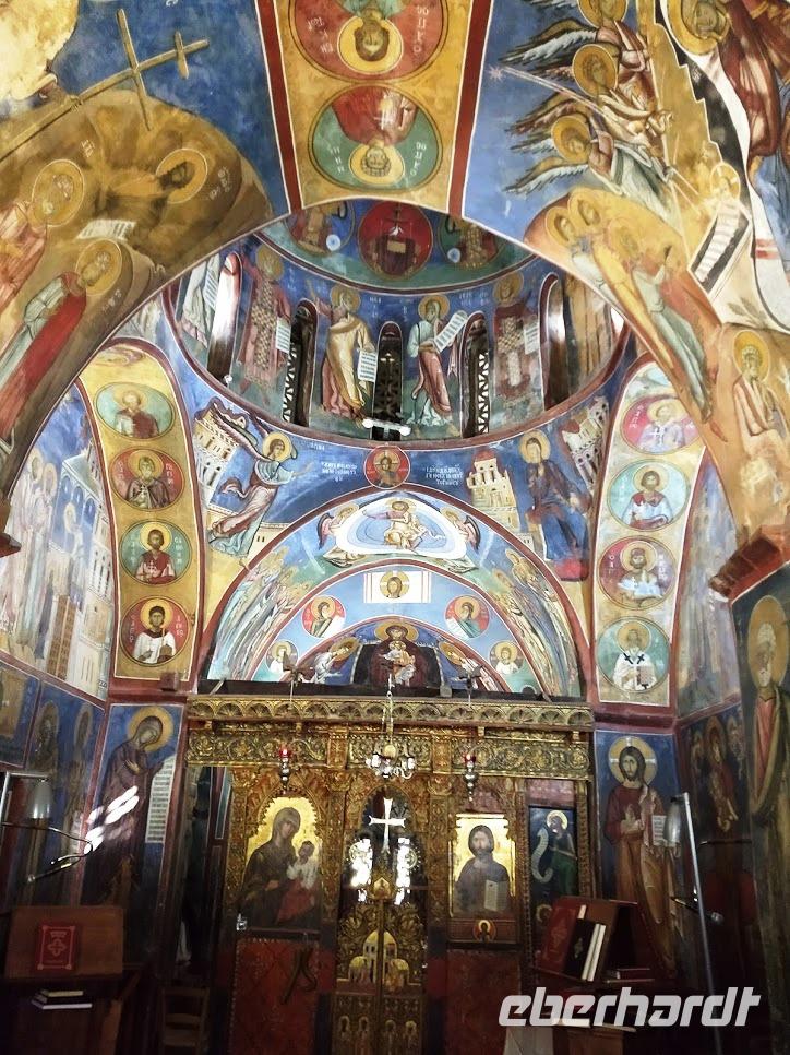 Gut gestärkt ging es nach dem Frühstück mit unserem Kleinbus los. Nach ca. 1 Stunde Fahrtzeit durch die Berge erreichten wir die Scheunendachkirche Stavros tou Agiasmati. Dimitris erläuterte uns die Geschichte dieser Kulturgüter und anschließend besichtigten wir diese Scheunendachkirche. Besonders sehenswert sind die bunten Ikonen und Fresken, die die Innenwände und Putzdecken komplett bedecken.