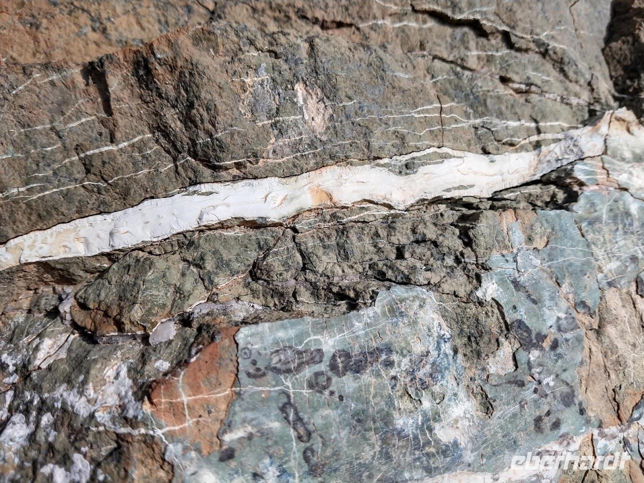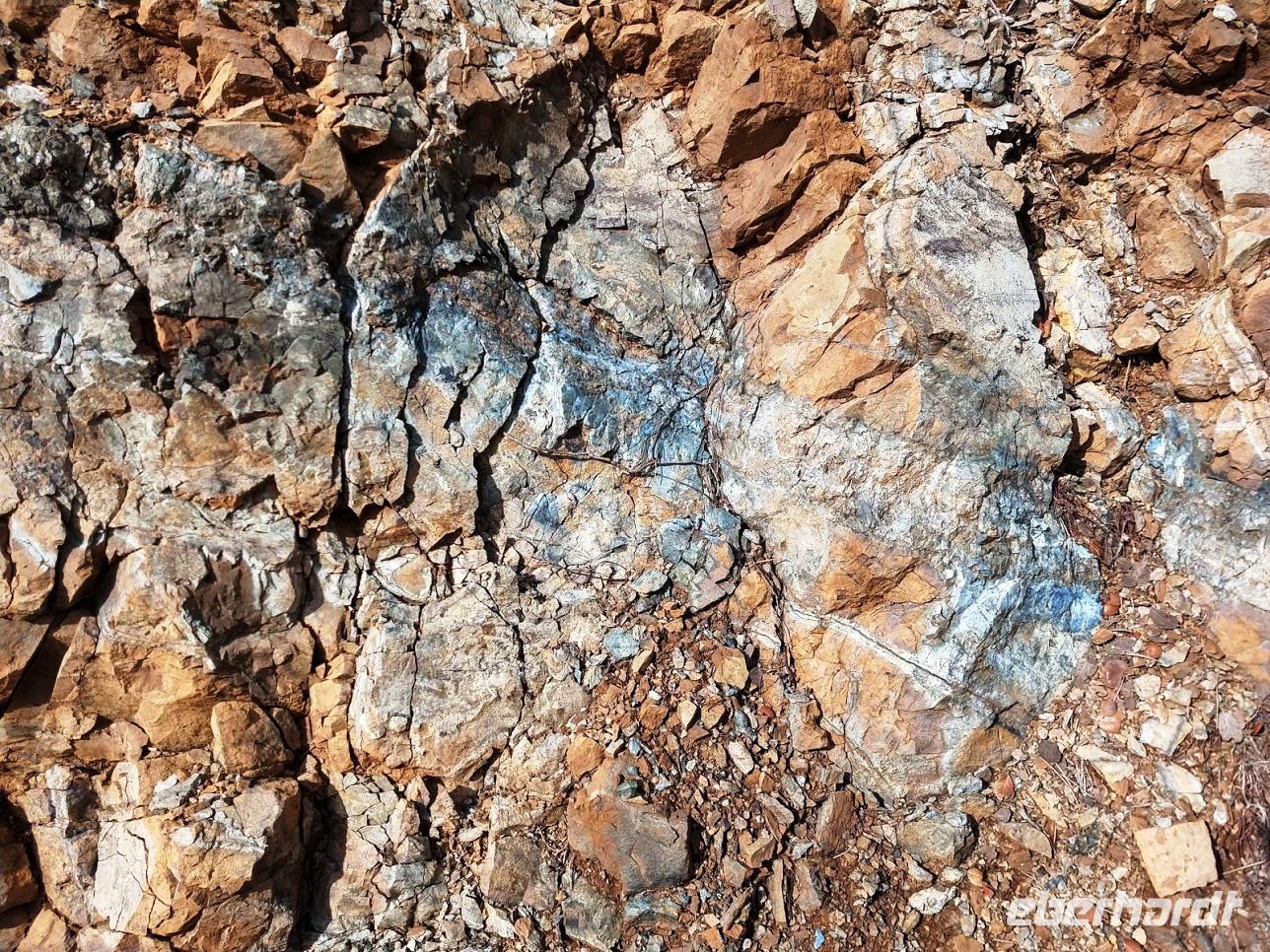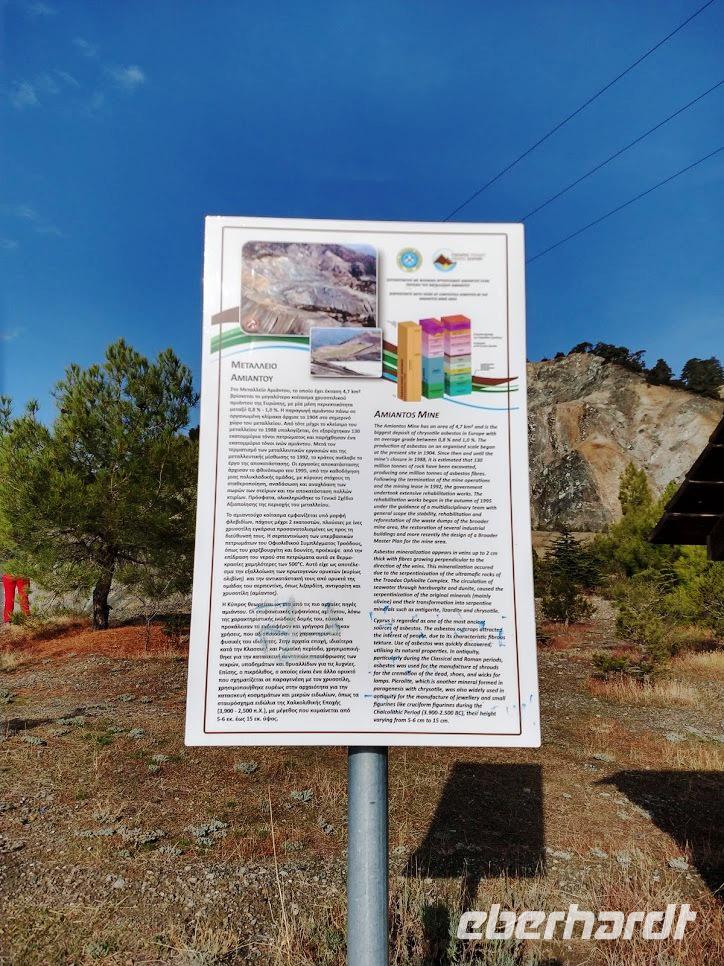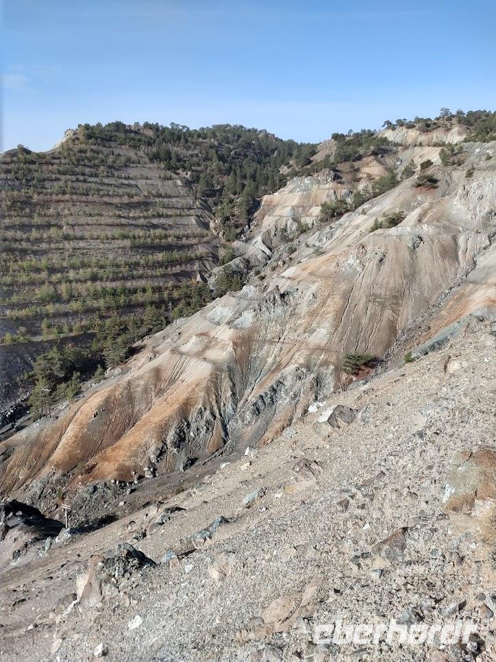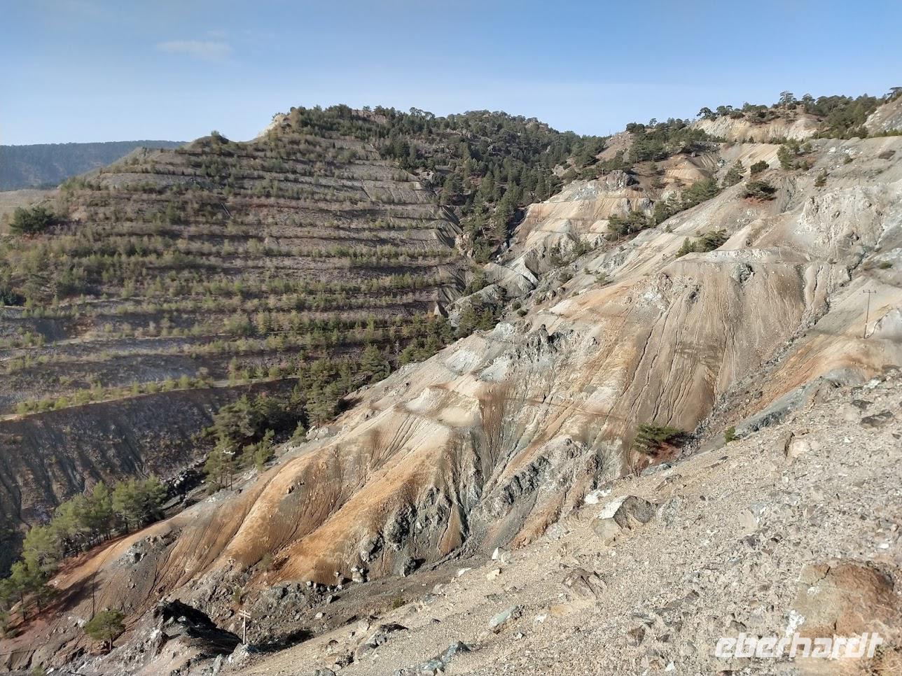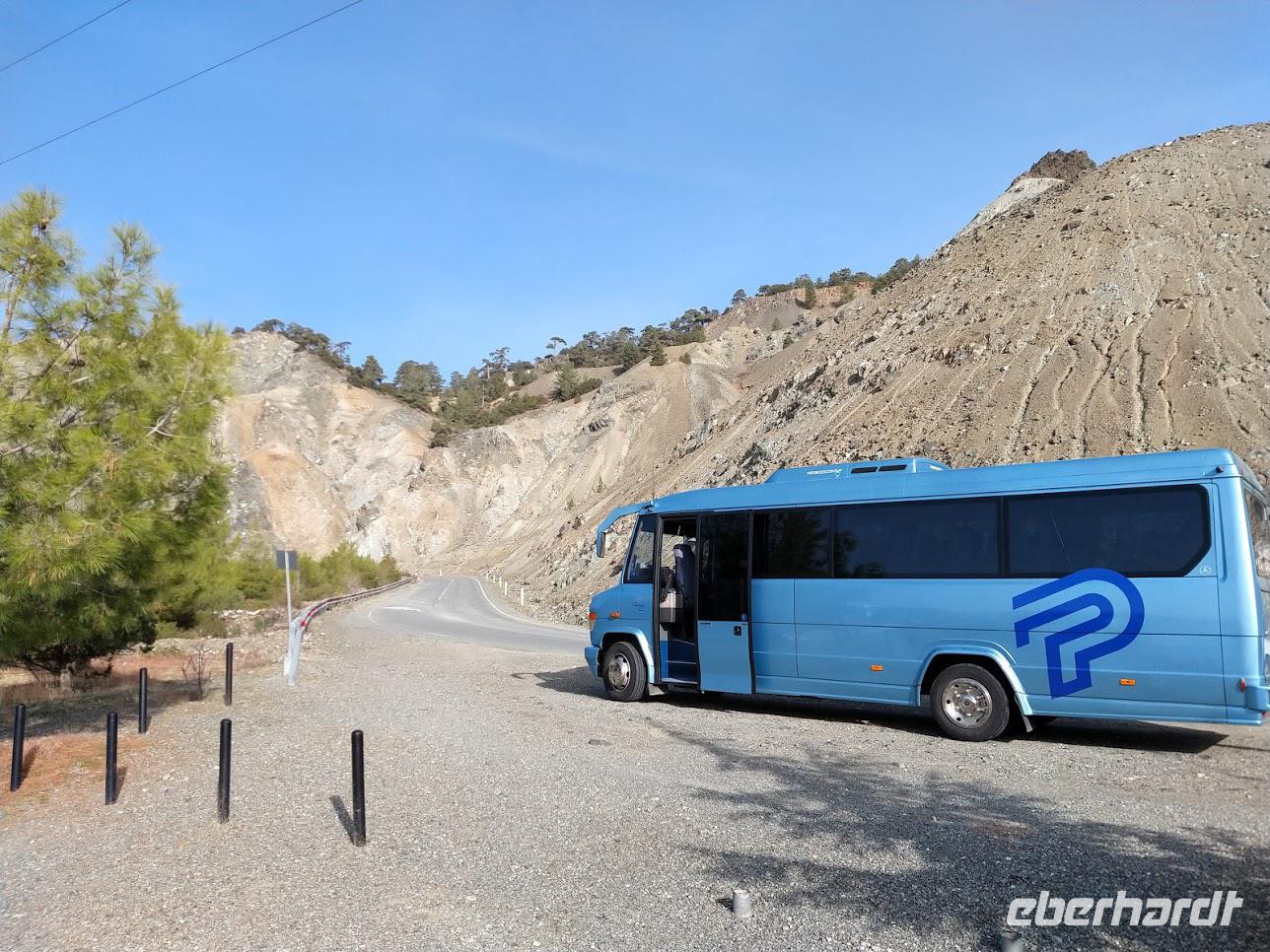 Nach ca. 1 Stunde Busfahrt erreichen wir das Olympus-Massiv und die renaturierte Bergbaulandschaft der ehemaligen Asbestmine. Bei einem Fotostopp erläutert uns Dimitris die Entstehung der Mine und die jetzt noch sichtbaren, sehr interessanten, geologische Formationen.
