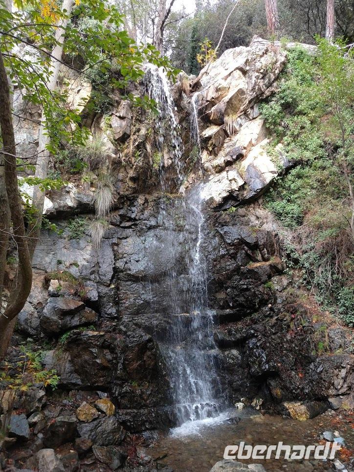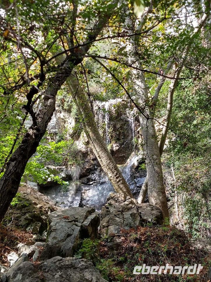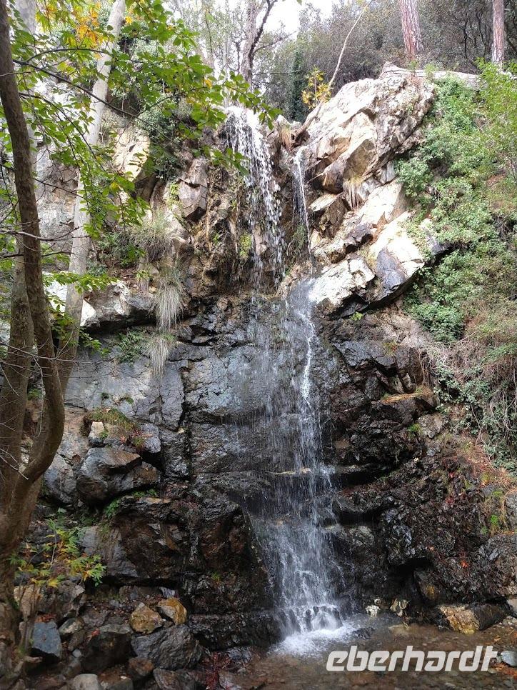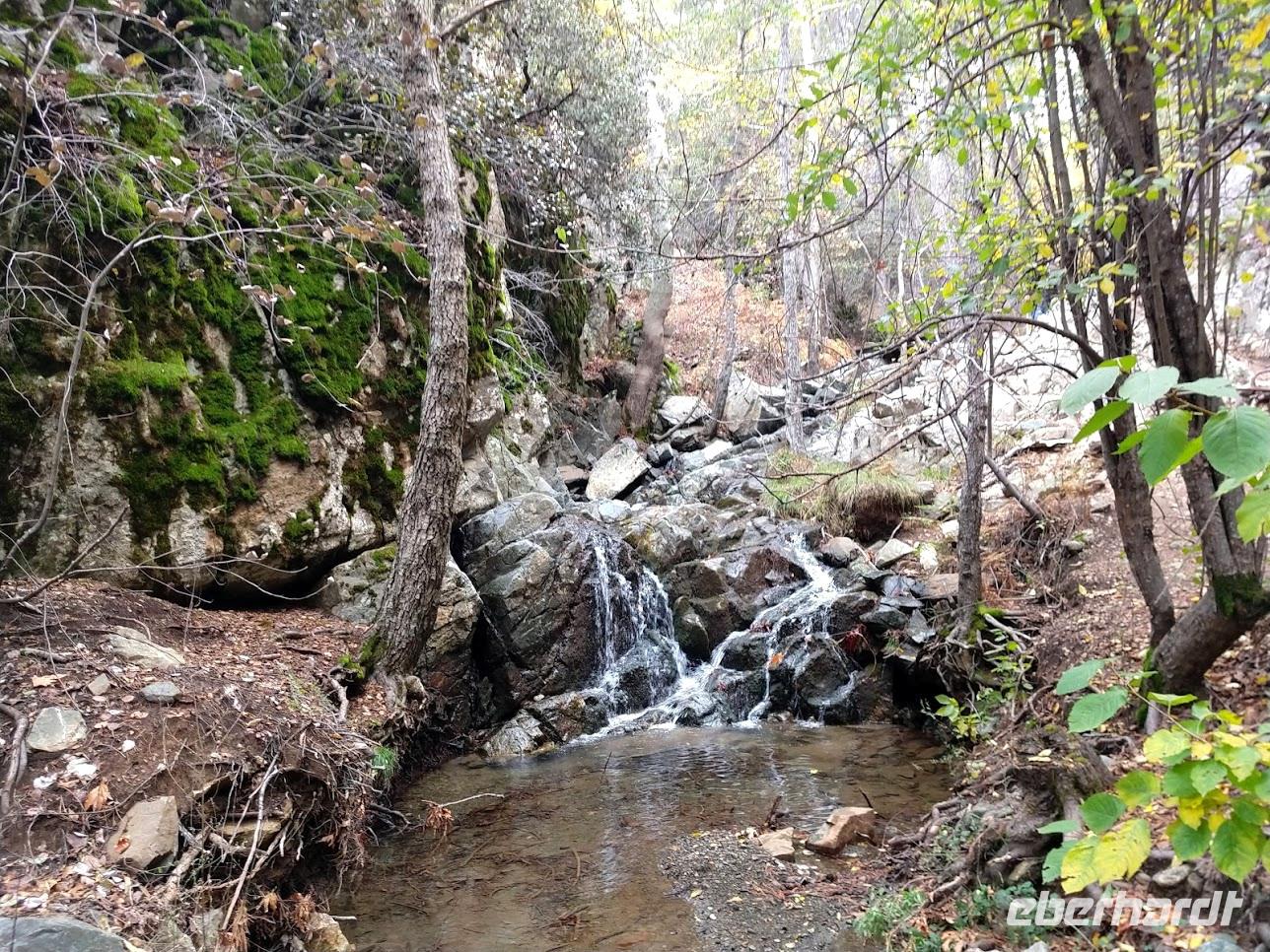 Die Weiterfahrt bringt uns hinauf nach Troodos und ab hier beginnt die Wanderung auf dem Natur-Trail durch den Schwarz-Pinienwald auf der Südseite des Olympus. Danach erreichen wir das Bachtal des Kyos. Auf dem Kaledonia-Naturlehrpfad wandern wir das Bachtal hinunter, über kleine Brücken und bei Steinsetzungen machen wir mehrere Bachüberquerungen. Das Tal wir immer mehr zu einer Schlucht und Steintreppen führen neben den Kaledonia -Wasserfällen steil hinab. Der unterste Wasserfall ist mit 15 m der Höchste. Am Talausgang seht ein hübsches Restaurant, in das wir zum Forelle-Essen einkehren. Auch hier geht nun ein heftiger Gewitter schauer mit Hagel nieder. Wir sitzen nach dem leckeren ‚Essen im Trockenen und genießen noch einen Cappuccino als eberhardt-Wow.