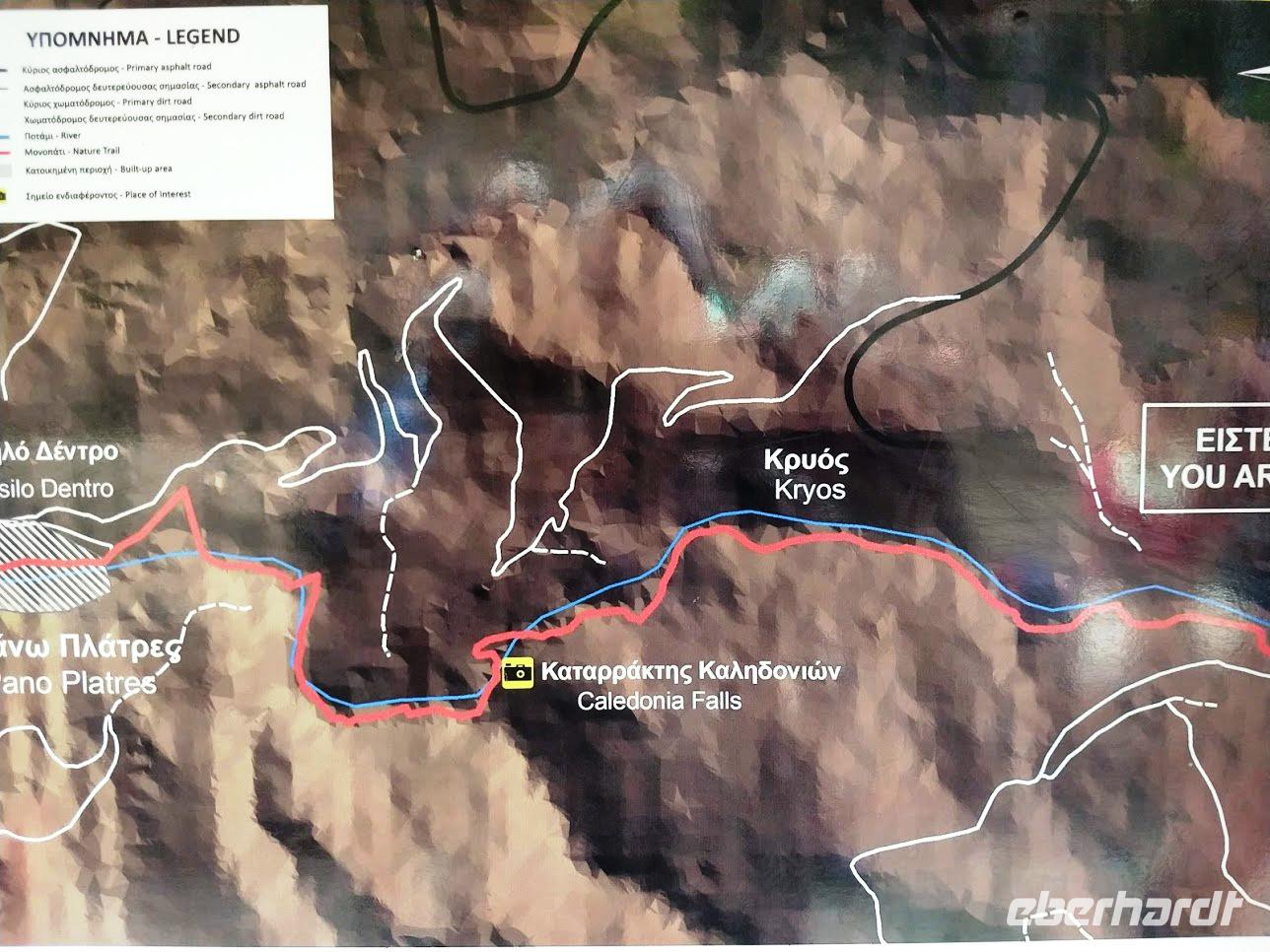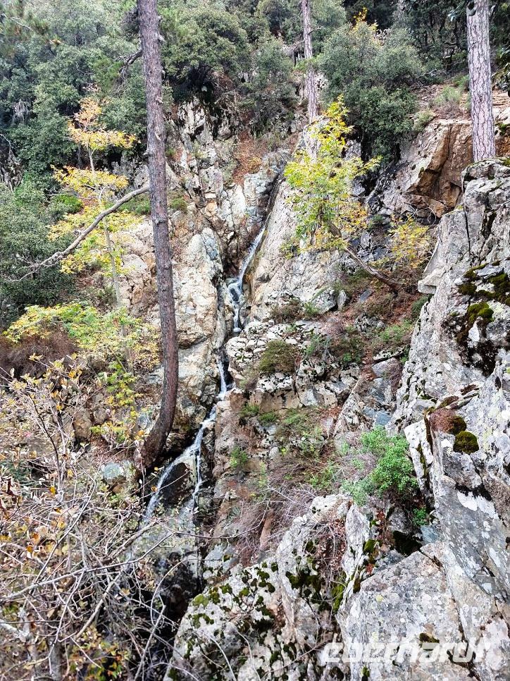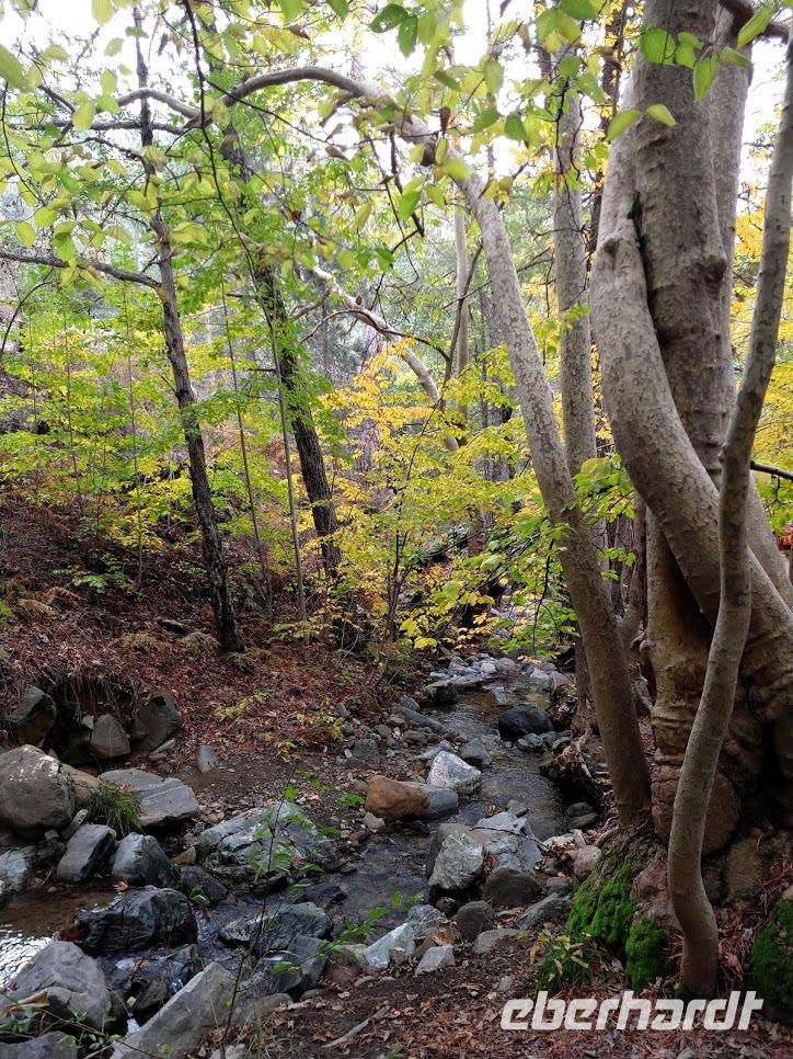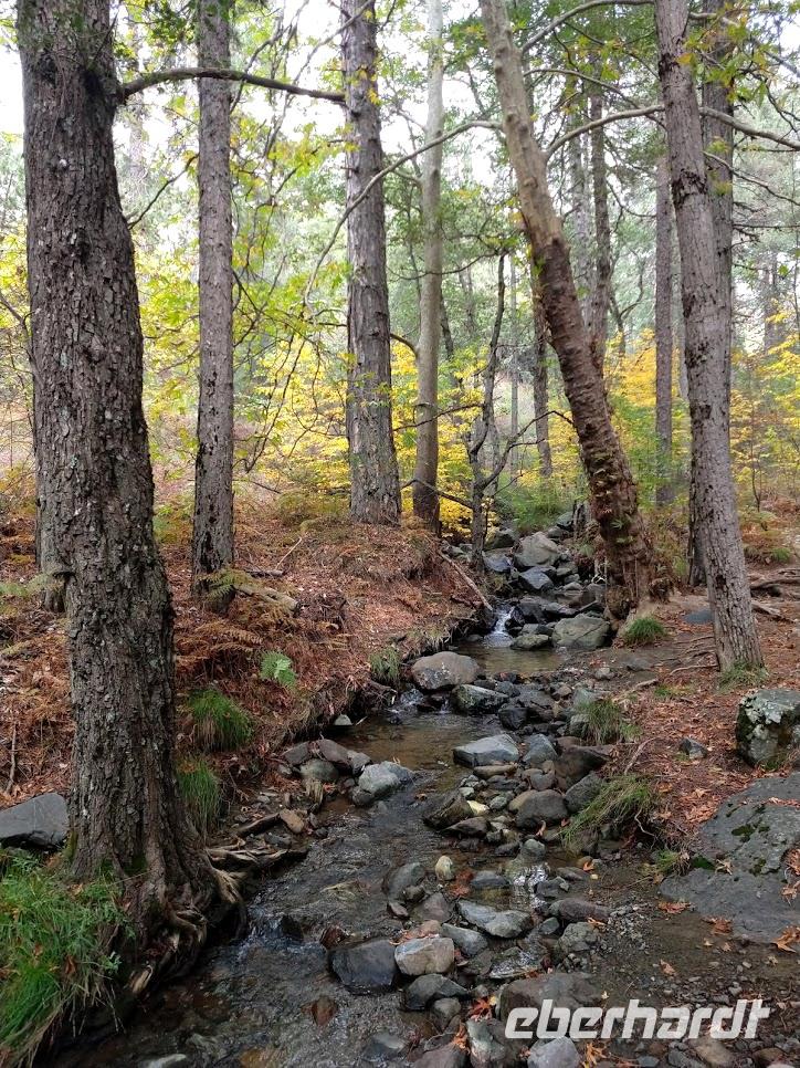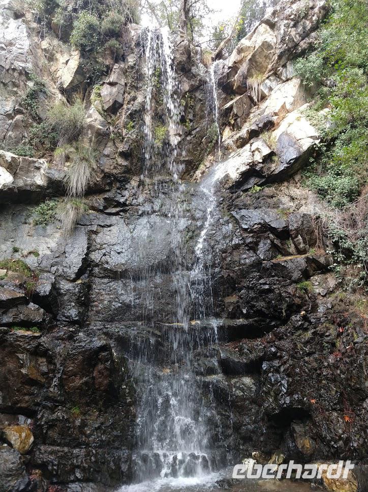 Die Weiterfahrt bringt uns hinauf nach Troodos und ab hier beginnt die Wanderung auf dem Natur-Trail durch den Schwarz-Pinienwald auf der Südseite des Olympus. Danach erreichen wir das Bachtal des Kyos. Auf dem Kaledonia-Naturlehrpfad wandern wir das Bachtal hinunter, über kleine Brücken und bei Steinsetzungen machen wir mehrere Bachüberquerungen. Das Tal wir immer mehr zu einer Schlucht und Steintreppen führen neben den Kaledonia -Wasserfällen steil hinab. Der unterste Wasserfall ist mit 15 m der Höchste. Am Talausgang seht ein hübsches Restaurant, in das wir zum Forelle-Essen einkehren. Auch hier geht nun ein heftiger Gewitter schauer mit Hagel nieder. Wir sitzen nach dem leckeren ‚Essen im Trockenen und genießen noch einen Cappuccino als eberhardt-Wow.