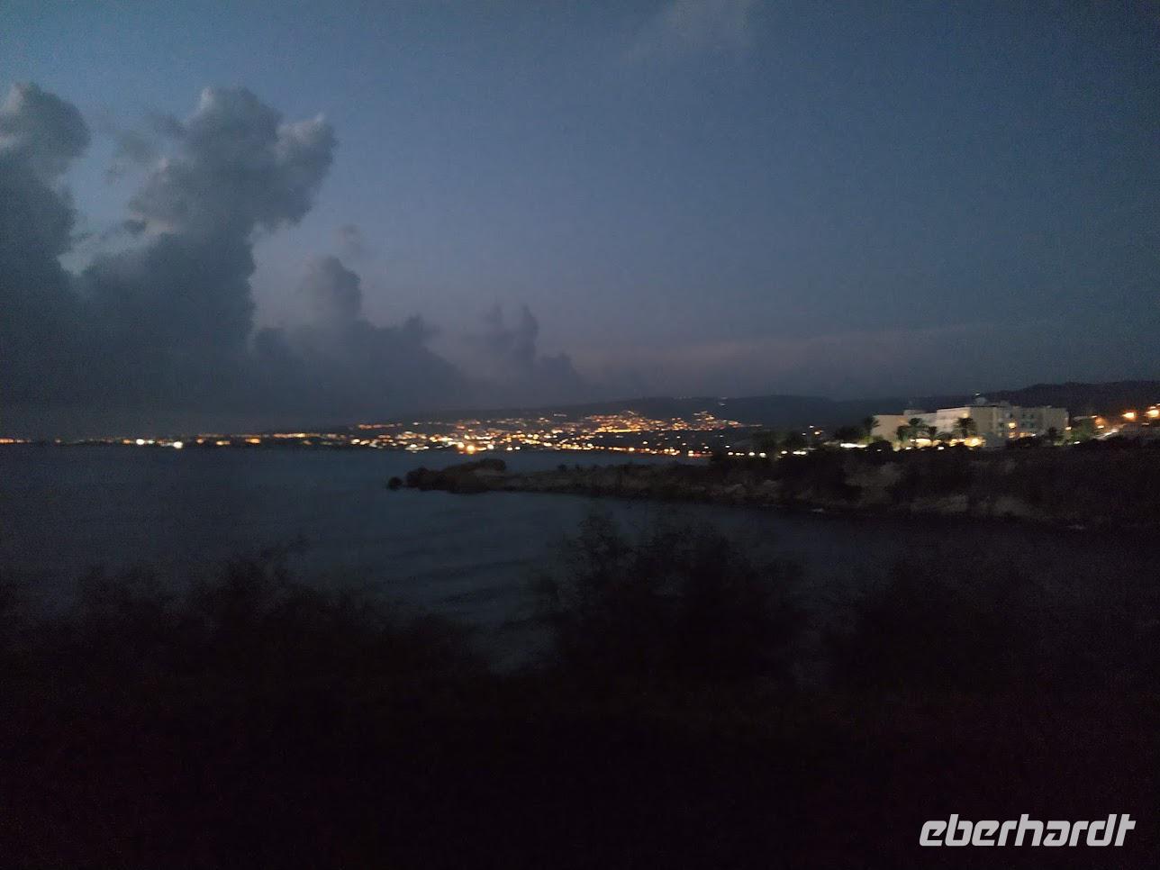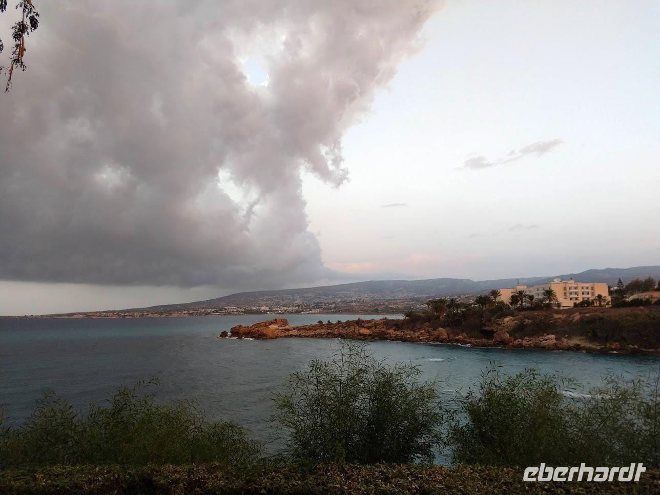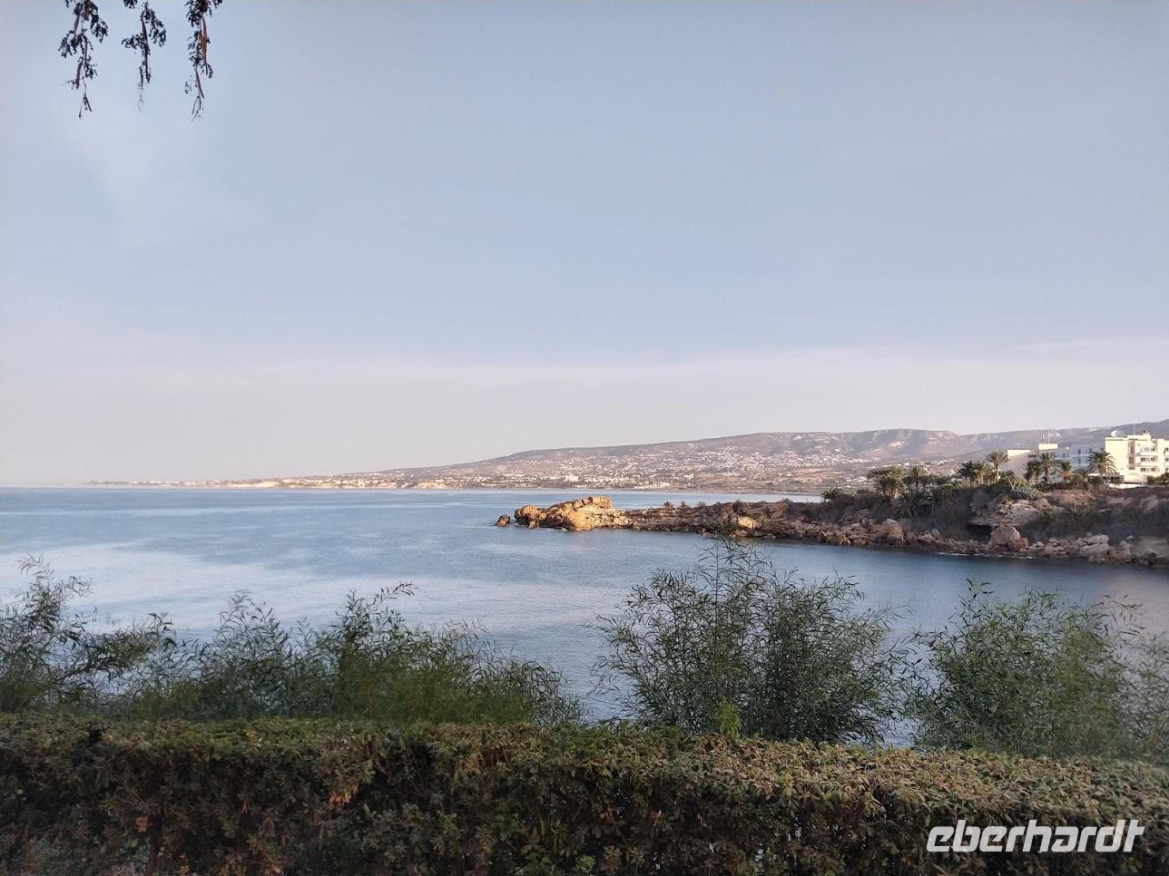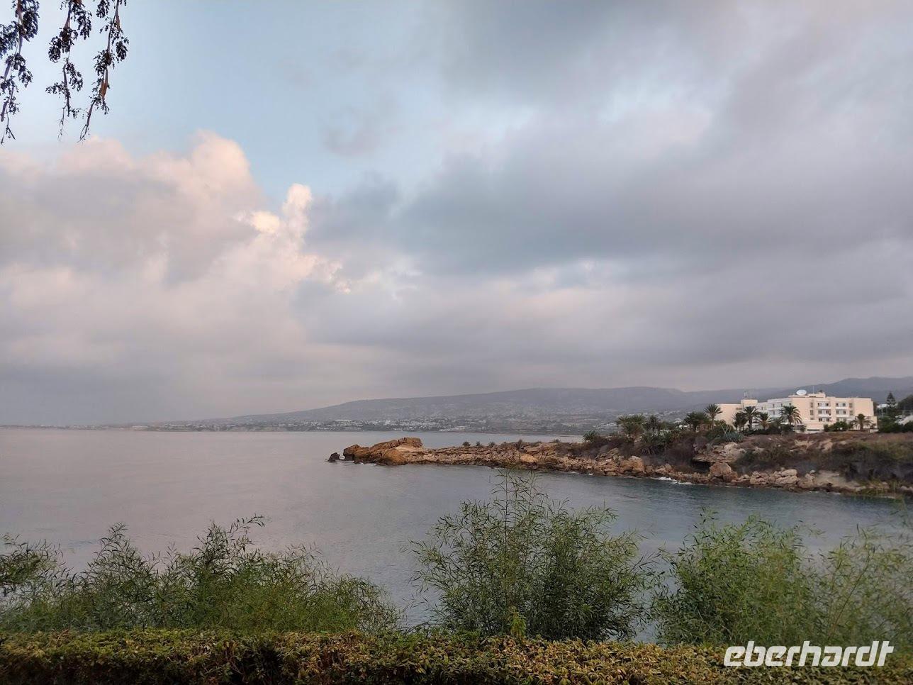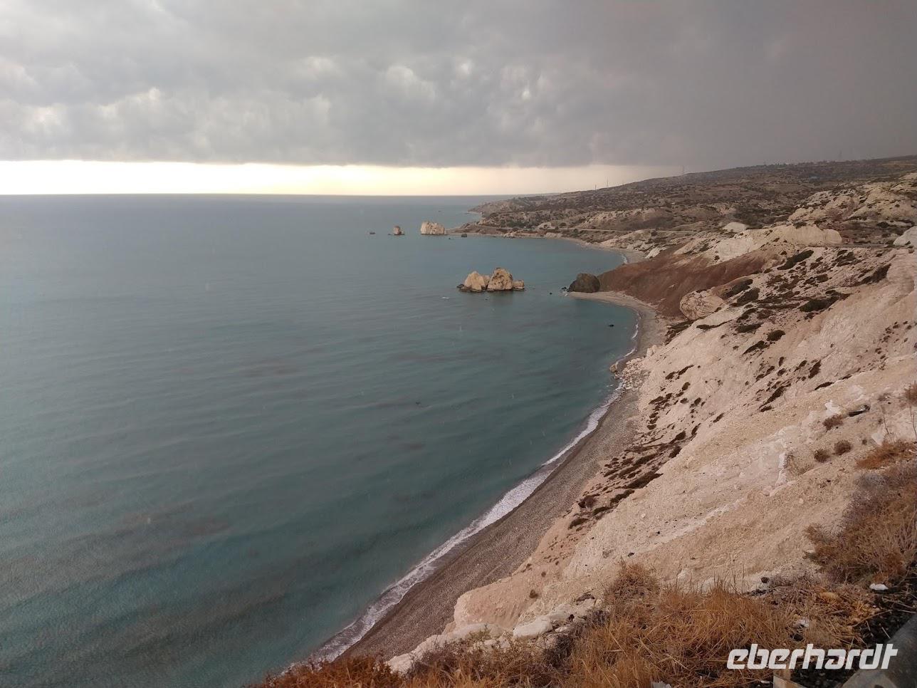Danach dann die direkte Weiterfahrt nach Paphos. Dabei holt uns das Unwetter wieder ein und es wittert mit Starkregen und heftigem Hagel während der Fahrt. Glücklicherweise hört es am Fotostopp an der Küste, mit Blick auf den Aphrodite-Felsen kurz auf.