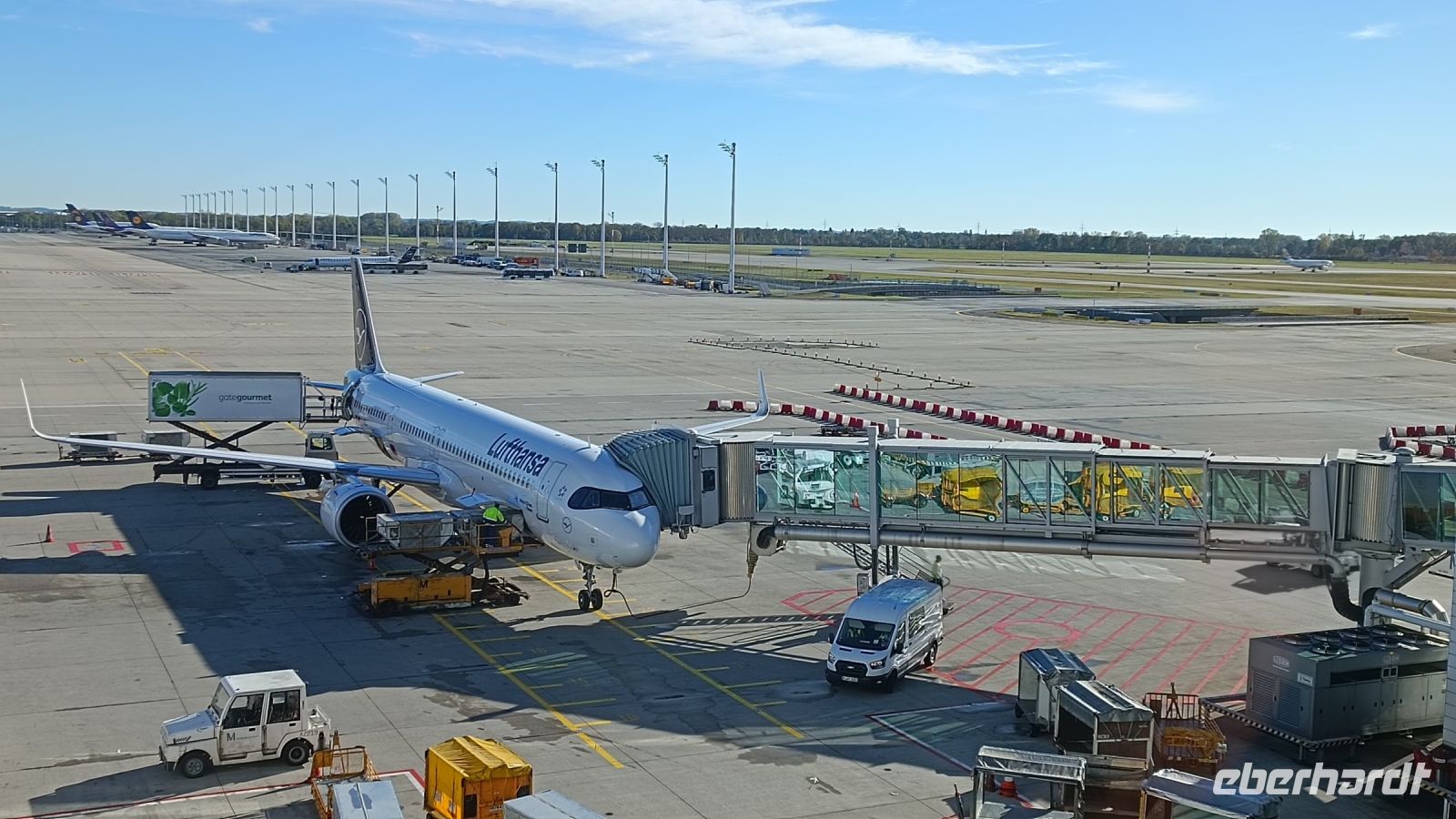 Unser Flieger nach München startete mit etwas Verspätung. Es fehlte noch ein Gast der jetzt verzweifelt gesucht wurde. Das Gepäck des Gastes wurde ebenfalls gesucht, da ein alleinreisendes Gepäck ohne zugehörige Person laut Vorschrift nicht mitgenommen werden durfte.