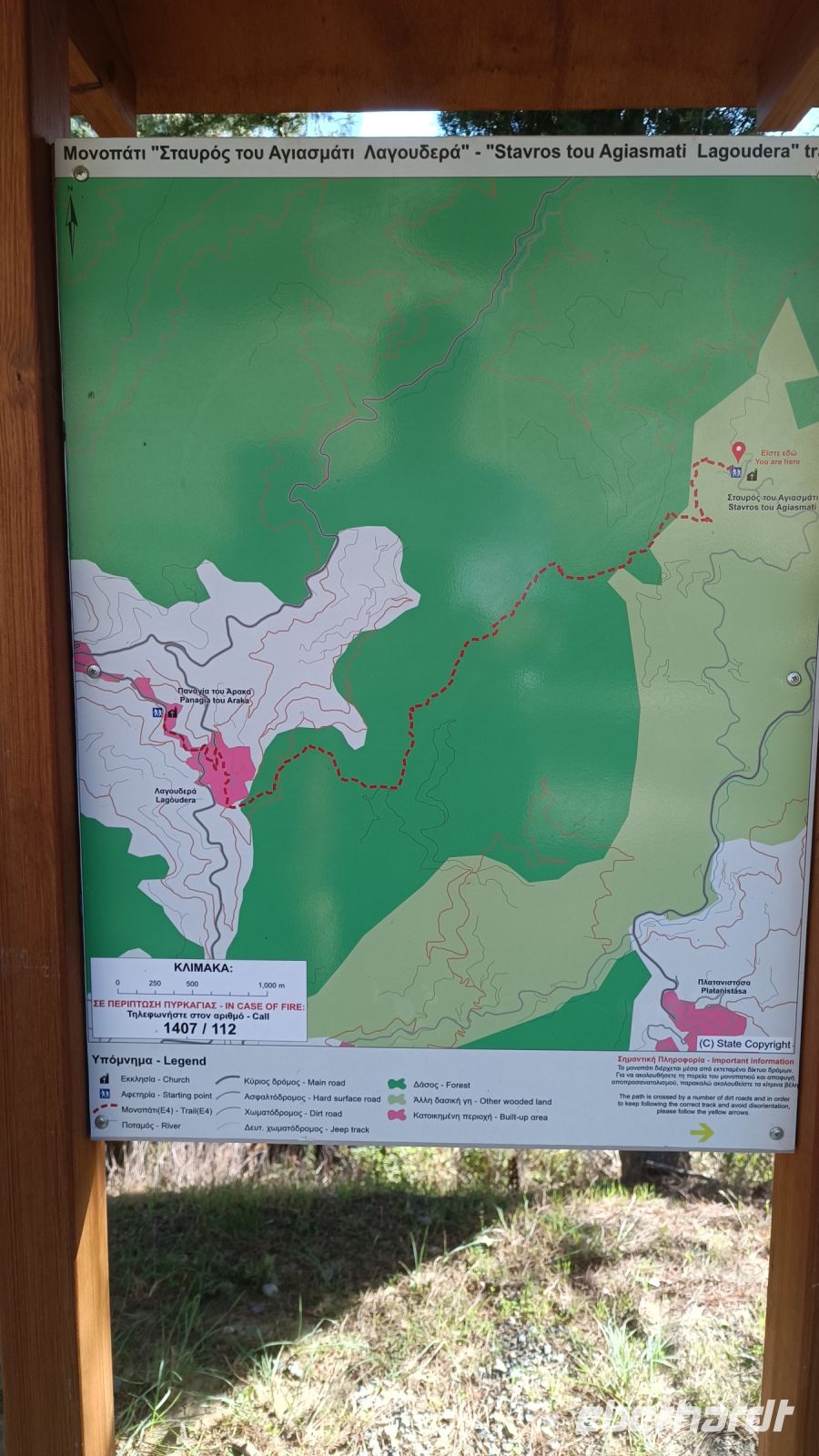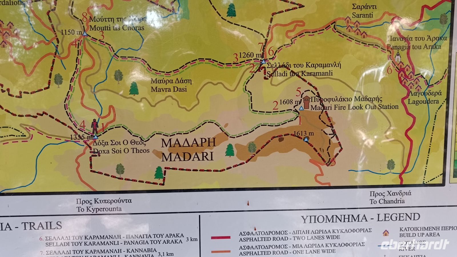 Wir folgten dem Naturlehrpfad „Tisia tis Madaris“ rund um das Bergmassiv Madaris, auf dessen Gipfel sich eine von der Feuerwehr besetzte kleine Hütte befindet. Das sogenannte „Feuerhaus“. Von hier aus kann man eventuell auftretende Waldbrände schnell erkennen und sie per Funk an die jeweils zuständigen Behörden weiter melden.