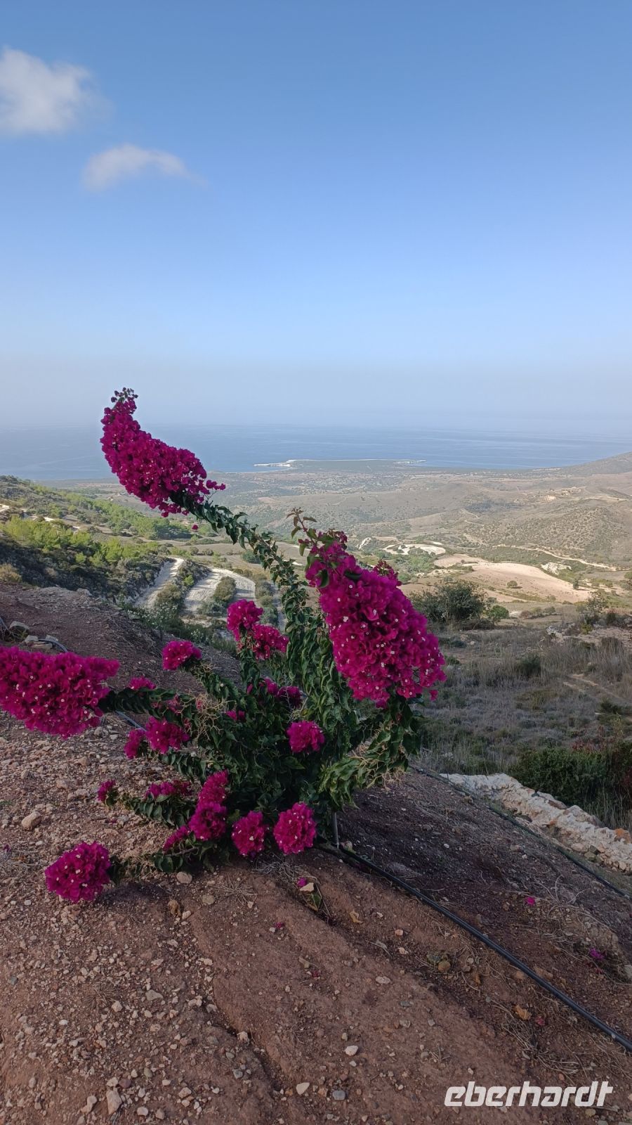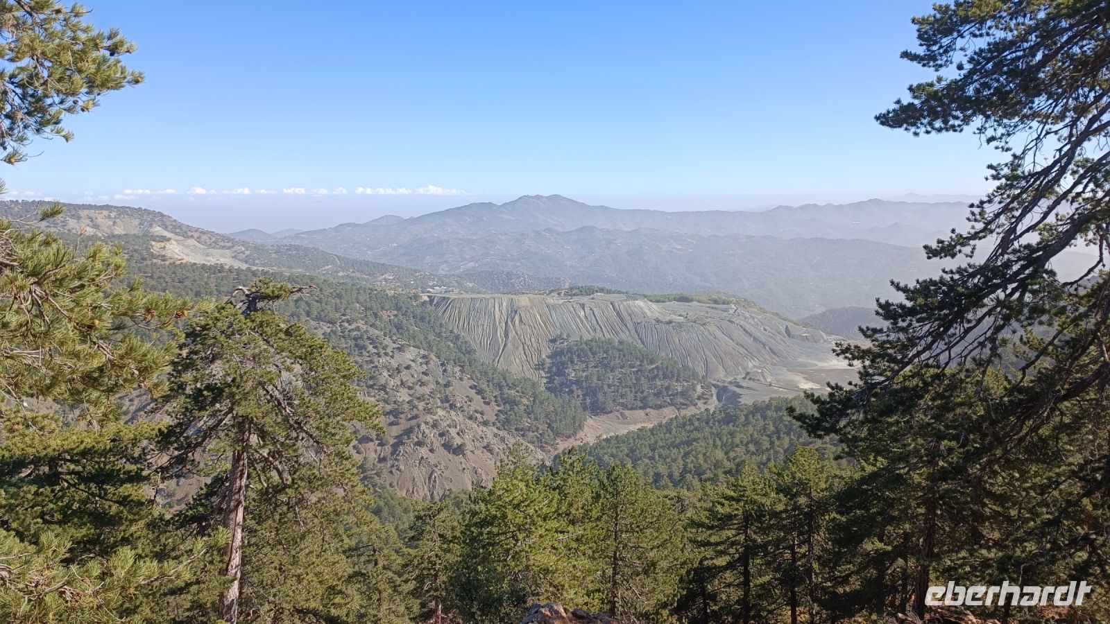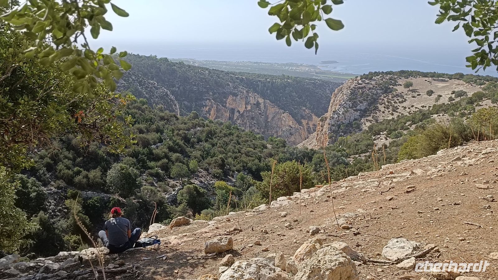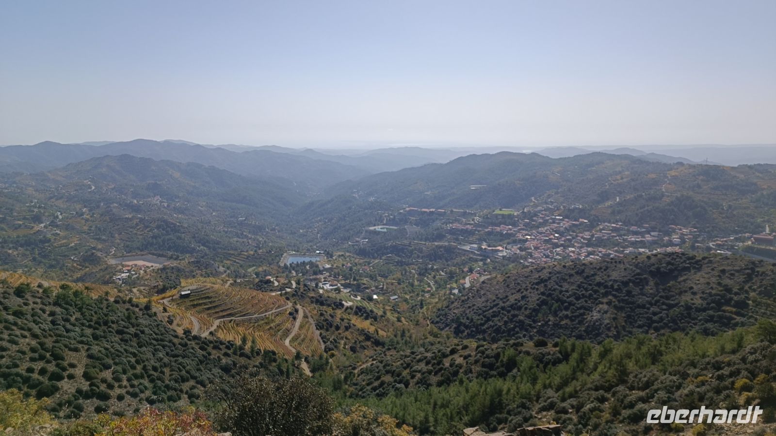 Gegenüber der Kirche begann unser langer steiler Anstieg mit oft grandiosen Ausblicken. Leider war es etwas dunstig und wir konnten die Hauptstadt Nikosia nicht mehr richtig erkennen, ebenso das türkische Taurusgebirge nur schemenhaft.