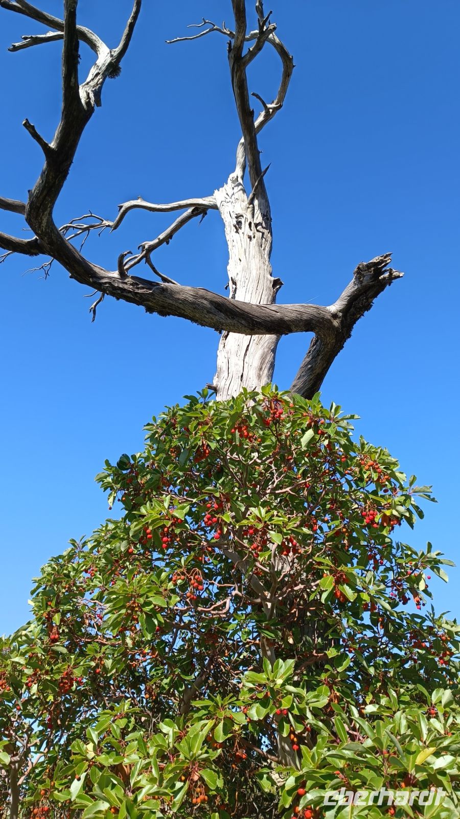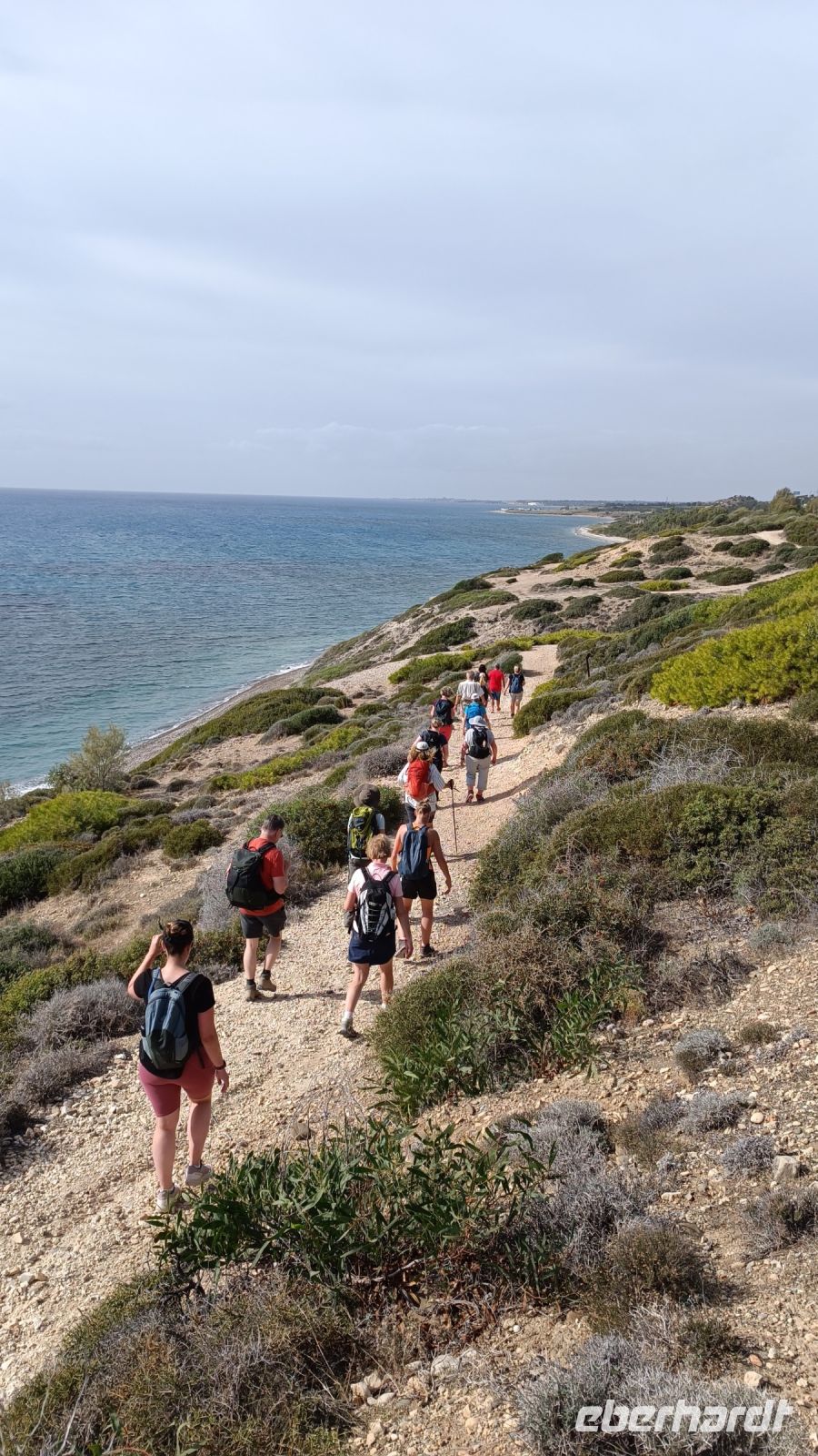 Von hier aus startete unsere heutige Wanderung immer am Meer entlang Richtung Kouklia. Bergauf und bergab, durch immergrüne Macchinalandschaft. Auf unserem Weg begleiteten uns der Mastixstrauch- voll mit roten Beeren, wilder Spargel- der am besten mit Eiern gebraten wird und dazu passend ein Glas Rotwein. Indische Eukalyptusbäume, die einst gepflanzt wurde, um die Sümpfe trocken zu legen, verhindern ein Aufkommen der edemischen Pflanzen wie, zum Beispiel der Orchidee.