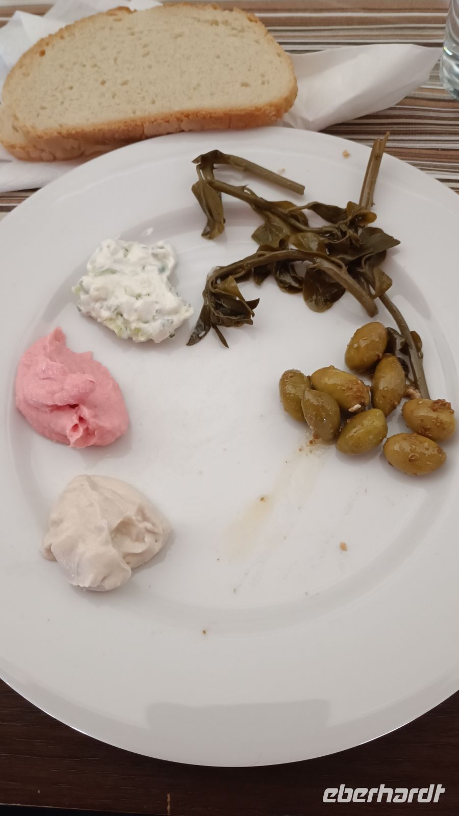 Verwöhnt wurden wir mit köstlichen Meze-Variationen aus verschiedenen typischen Gerichten. Zum Beispiel, die mit Schafskäse überbackenen Auberginen denen Pfefferminz beigemengt wurde. Eine Kreation, die dem Gericht eine gewisse Frische verleihte.