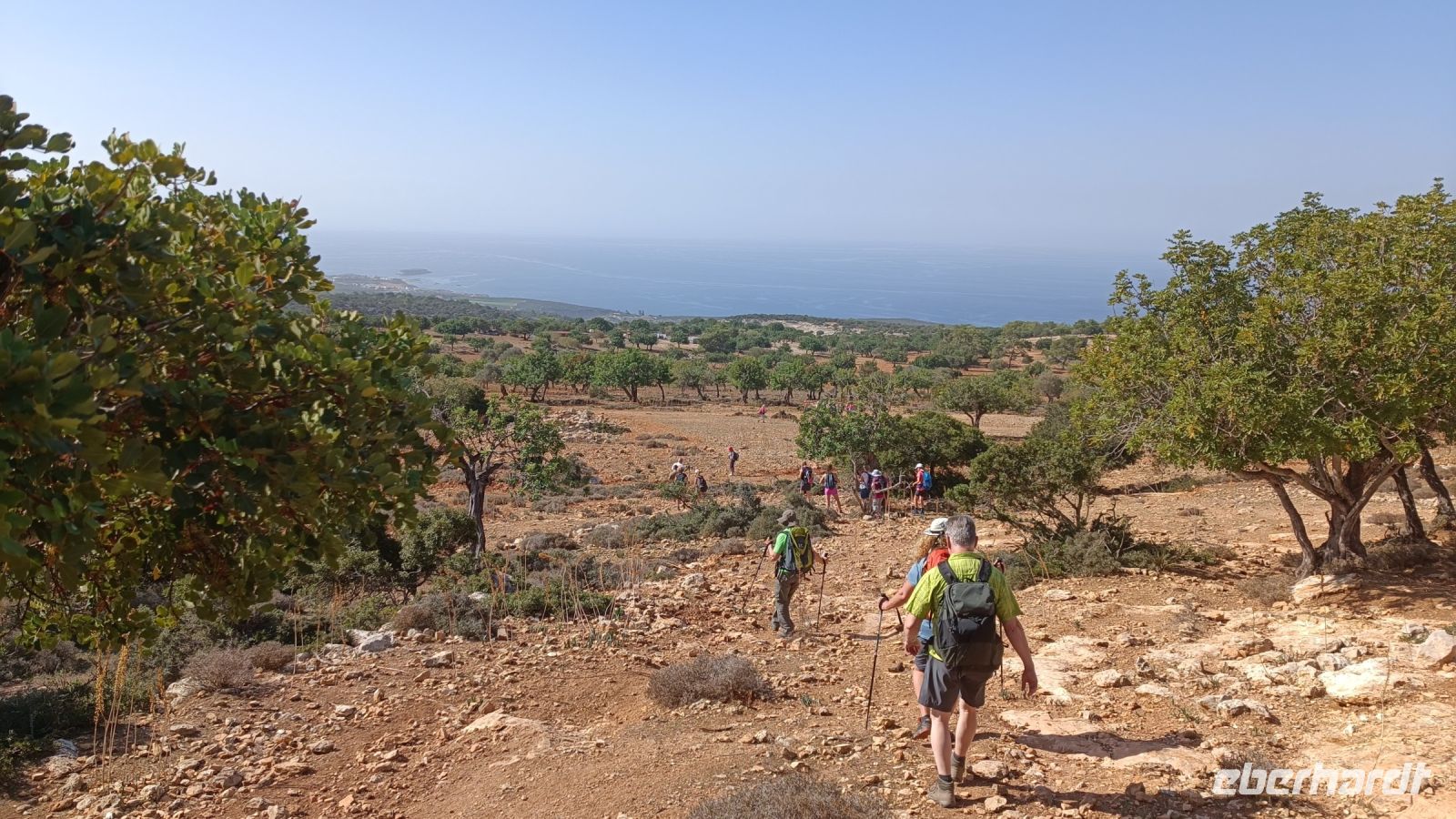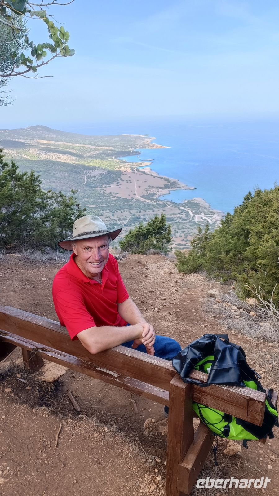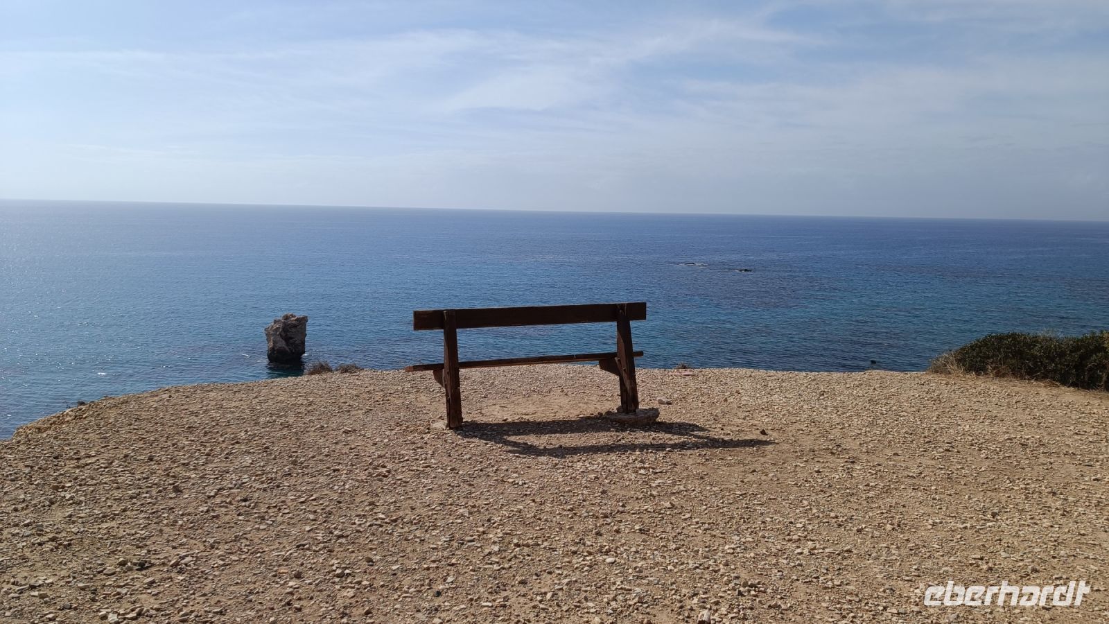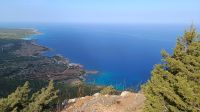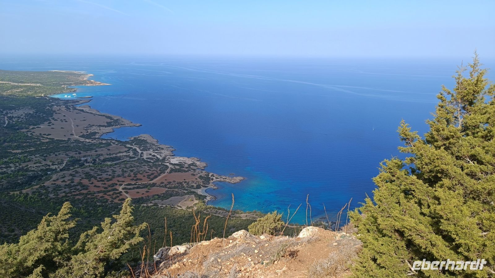Die mächtige 500 Jahre alte Eiche, an der Zusammenführung des Adonis- mit dem Aphroditeweg bot einen herrlichen Rastplatz. An der Quelle konnte man die Wasserflaschen füllen, bevor ein kurzer Anstieg zum Moutti tis Sotiras erfolgte. Hier bot sich uns ein wunderschöner Ausblick hinunter auf die Küste der Chrysochoubucht mit ihrem türkisblauem Wasser und ihrer berühmten Blauen Lagune.