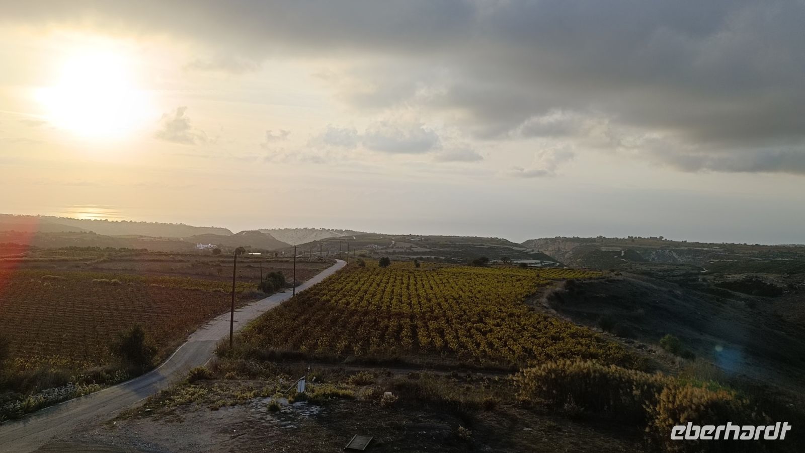Während der Fahrt dorthin erzählte uns Minni, dass der Wein auf Zypern nur einmal gegossen wird, und zwar bei der Pflanzung. Hinterher nicht mehr. Die Stöcke werden kurz geschnitten und damit nieder gehalten, damit sich die Feuchtigkeit besser im Boden halten kann.