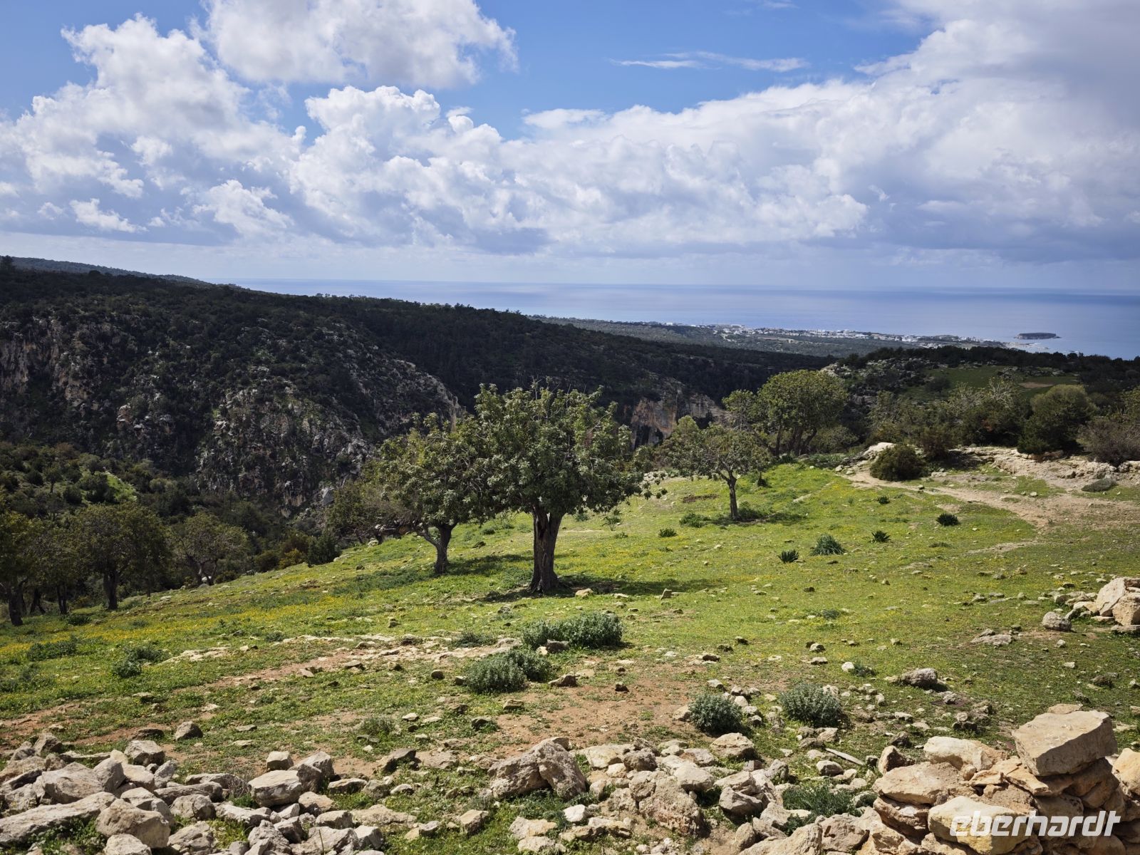 Wir wanderten über Feldwegen und kamen an einen Aussichtspunkt, an dem wir auf die Lara Bucht, auch bekannt als Schildkrötenbucht, sehen konnten. Weiter ging es auf einen Pfad (Geheimtipp) oberhalb der Schlucht, sodass wir herrliche Blicke in die Schlucht und Weitblicke aufs Meer hatten.