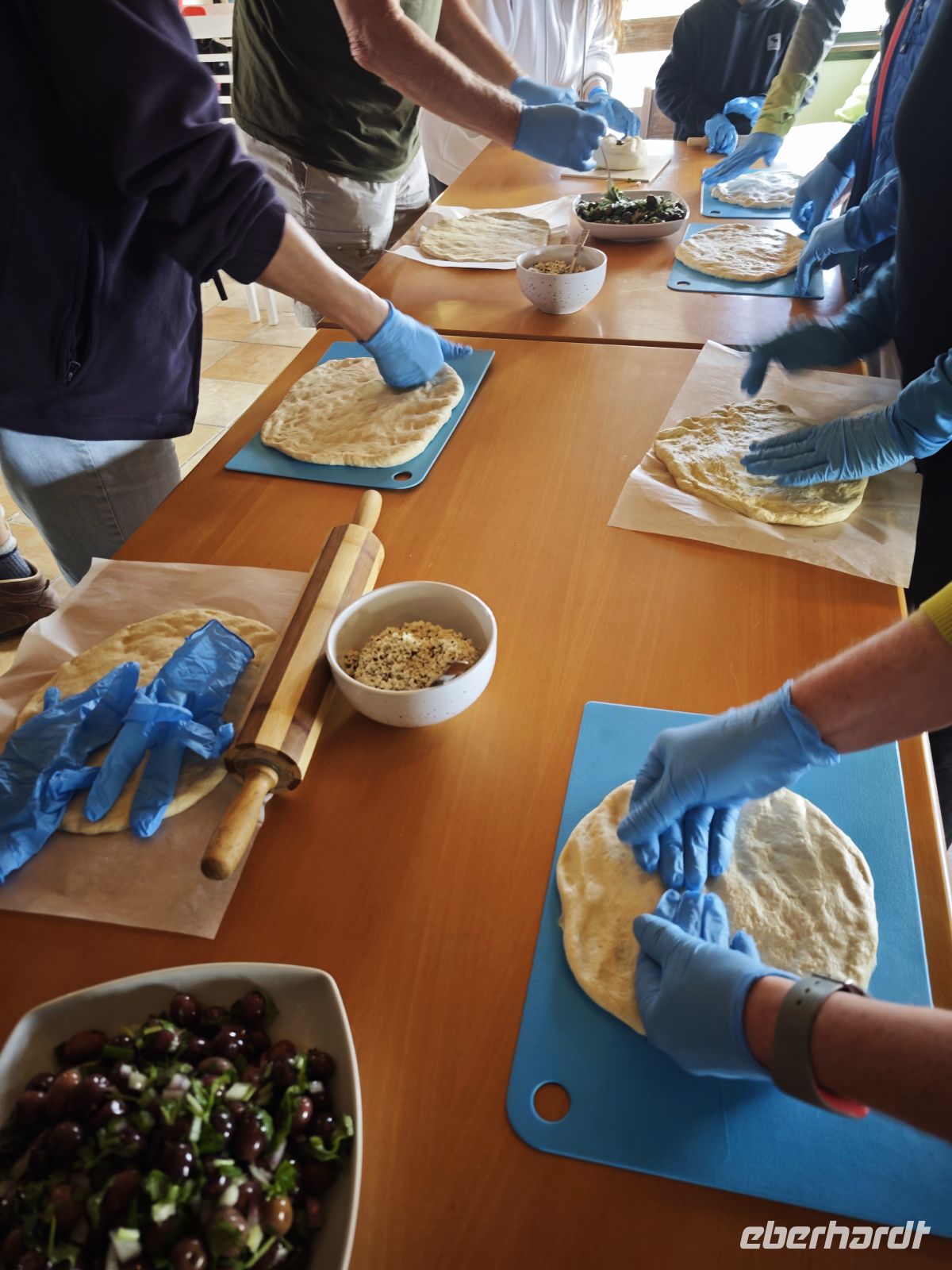 Wir startete um 9.00 Uhr vom Hotel mit dem Bus. Alle waren schon etwas aufgeregt und gespannt, da heute handwerkliches Geschick als erstes auf dem Programm stand. Wir durften unser eigenes Olivenbrot backen. Wir kamen bei der Wirtin der kleinen Taverne an und wurden bereits erwartet. Sie hatte den Teig schon vorbereitet. Ihr Enkeltochter zeigte uns wie wir es machen sollten. Jeder bekam einen Klumpen Teig, musste ihn aus Wellen und mit einer vorbereiteten Olivenmischung füllen. Die Kunst war den Brotrohling auf ein Blech zu bekommen. In einem Lehmofen, der mit Holz angeheizt wurde, kamen die Brot zum Fertigbacken rein.