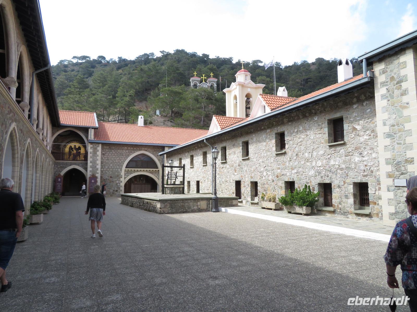 Ganz entspannt genossen wir das zypriotische Frühstück inmitten des Mararathsa Tales und spazierten anschließend zu dem im Dorf gelegenen ehemaligen Kloster Ioannis Lambadidis. Nachdem uns der örtliche Priester die Tür geöffnet hatte besichtigten wir die Klosteranlagen und die dreischiffige Kirche mit seinen gut erhaltenen Fresken. Im Anschluss fuhren wir weiter mit dem Bus in das nahegelegene Dorf Pedoulas und spazierten durch die kleinen Gassen. Während unseres entspannten Rundganges schauten wir uns außerdem im kleinen Dorfmuseum um und genossen im Anschluss im dorfeigenen Kafenio, dem zypriotischen Kaffeehaus, einen typisch zypriotischen Kaffee. Am Mittag stiegen wir dann wieder in unseren gemütlichen Bus und fuhren in Richtung Kykkos-Kloster. Doch bevor wir das größte Kloster der Insel Zypern besichtigten, hielten wir unterwegs an einem der urigen Picknickplätze und genossen ein Picknick mit frischen zypriotischem Speisen und Getränken. Die Zyprioten lieben das Picknicken, Grillen und Campen und sie treffen sich sehr oft am Wochenende in den Bergen um die Zeit gemeinsam mit der Familie oder Freunden zu verbringen. Nachdem wir zwischen Vogelgezwitscher und dem intensiven Duft der Zedernwälder unser Picknick beendet hatten fuhren wir weiter entlang der Gipfel des Troodosgebirges, bis wir das Kykkos-Kloster erreichten. Das größte Kloster der Insel besticht vorallem durch seine prachtvolle und goldverzierte Ikonostase und seine vielen Ikonenbilder aus aufwendig verzierten Mosaiken. Oberhalb des Klosters befindet sich außerdem der Berg Throni mit dem Grab des ehemaligen Erzbischofs und Präsidenten Makarios, das wir ebenfalls besuchten. Er war einer der beliebtesten Zyprioten auf der Insel Zypern und wird bis heute von vielen Menschen der Insel vereehrt. Vom Gipfel des Berges bot sich dann ein toller Blick bis an das Mittelmeer und bis zum höchsten Berg der Insel Zypern, dem Olymp. Am Nachmittag erreichten wir dann nach einer schönen Fahrt über die kurvigen Straßen des Troodosgebirges wieder unser Dorf Kalopanayiotis. Am späten Nachmittag unternahmen wir dann bei Sonnenuntergang noch einen kleinen Spaziergang durch das Dorf und das Mararathsatal, bevor wir am Abend im edlen Restaurant feine zypriotische Küche genossen.