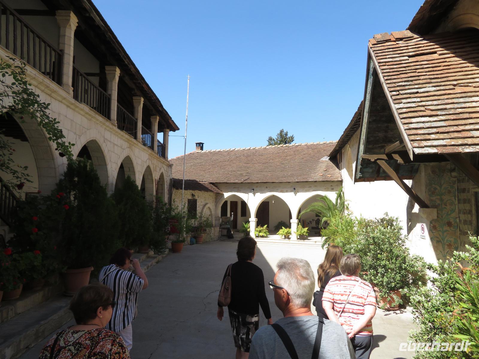 Nicht weit ist es von Paphos in die kleine Stadt Geroskipou, wo wir nach einem leckeren Frühstück zunächst die byzantinische Kirche Paraskevi mit seinen sehr gut erhaltenen Fresken besuchten, bevor wir anschließend in das Hinterland von Paphos fuhren. Inmitten zahlreicher Weinberge besuchten wir dann das Kloster Chrysorrogiatissa. In dem aktiven Kloster mit seinen urigen Gemäuern und einem tollem Ausblick über die Weinberge wird auch selbst Wein hergestellt, den wir natürlich verkosteten. Nach einer kleinen Kaffeepause fuhren wir dann weiter in das nahegelegene Dorf Pano Panagia und besichtigten das kleine Geburtshaus des ehemaligen Erzbischofes und Präsidenten Makarios. Umgeben vom intensiven Duft der damaszener Rosen verließen wir dann Pano Panagia und erreichten nach dem Mittag die Familie auf dem Land. Nach einem herzlichen Empfang genossen wir ein tolles Mittagessen mit allerlei zypriotischen Spezialitäten, hauseigenem Wein und leckerem Zivania, dem zypriotischen Schnaps. Nach vielen diesem tollen Erlebnis fuhren wir am Nachmittag wieder zurück nach Paphos in unser 4-Sterne-Hotel Alexander the Great und genossen die Sonne.