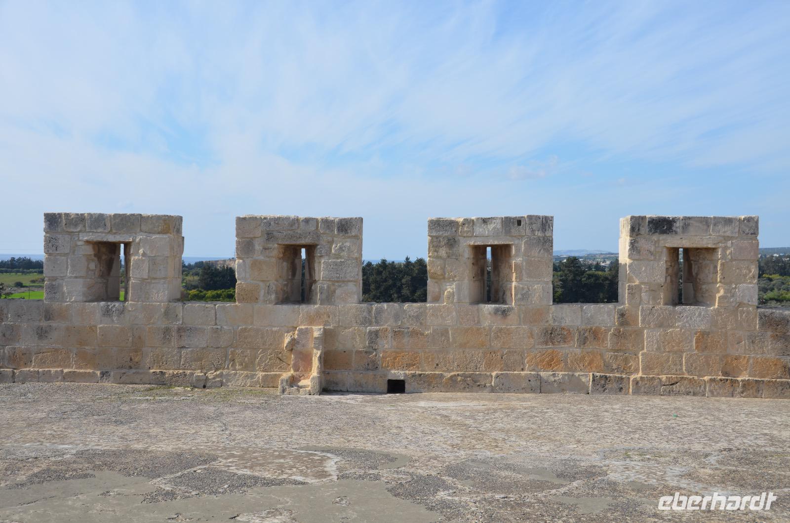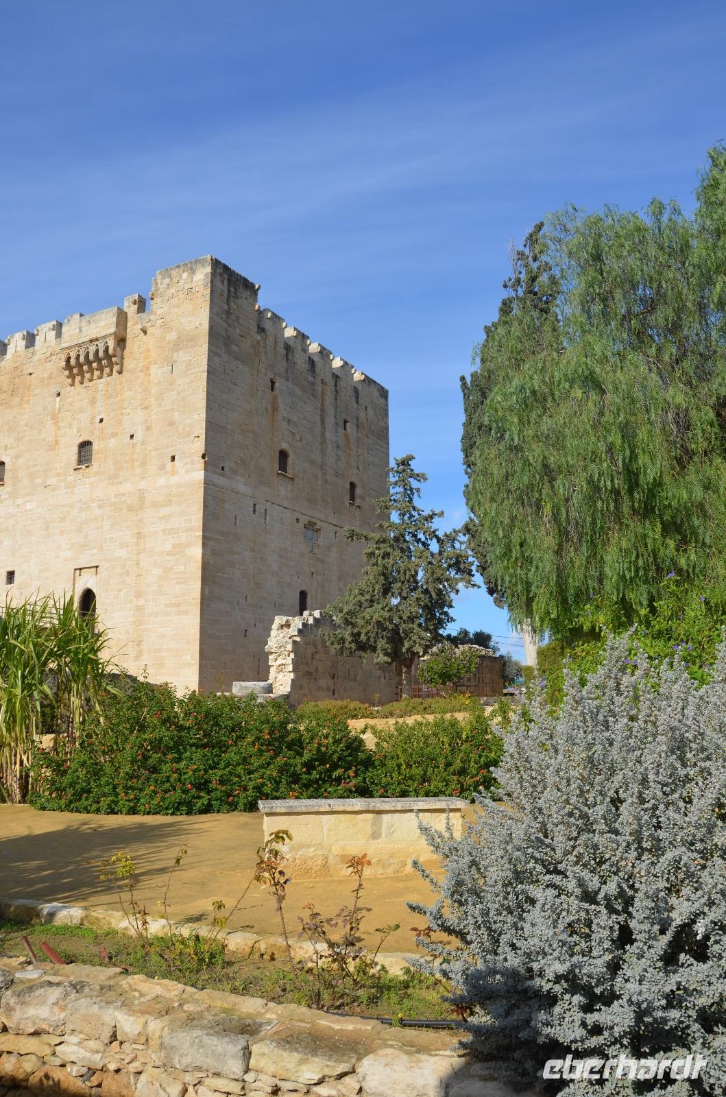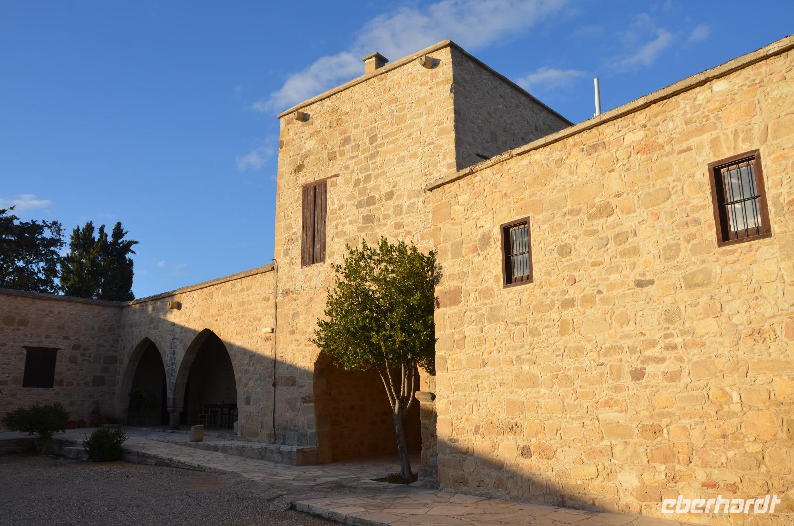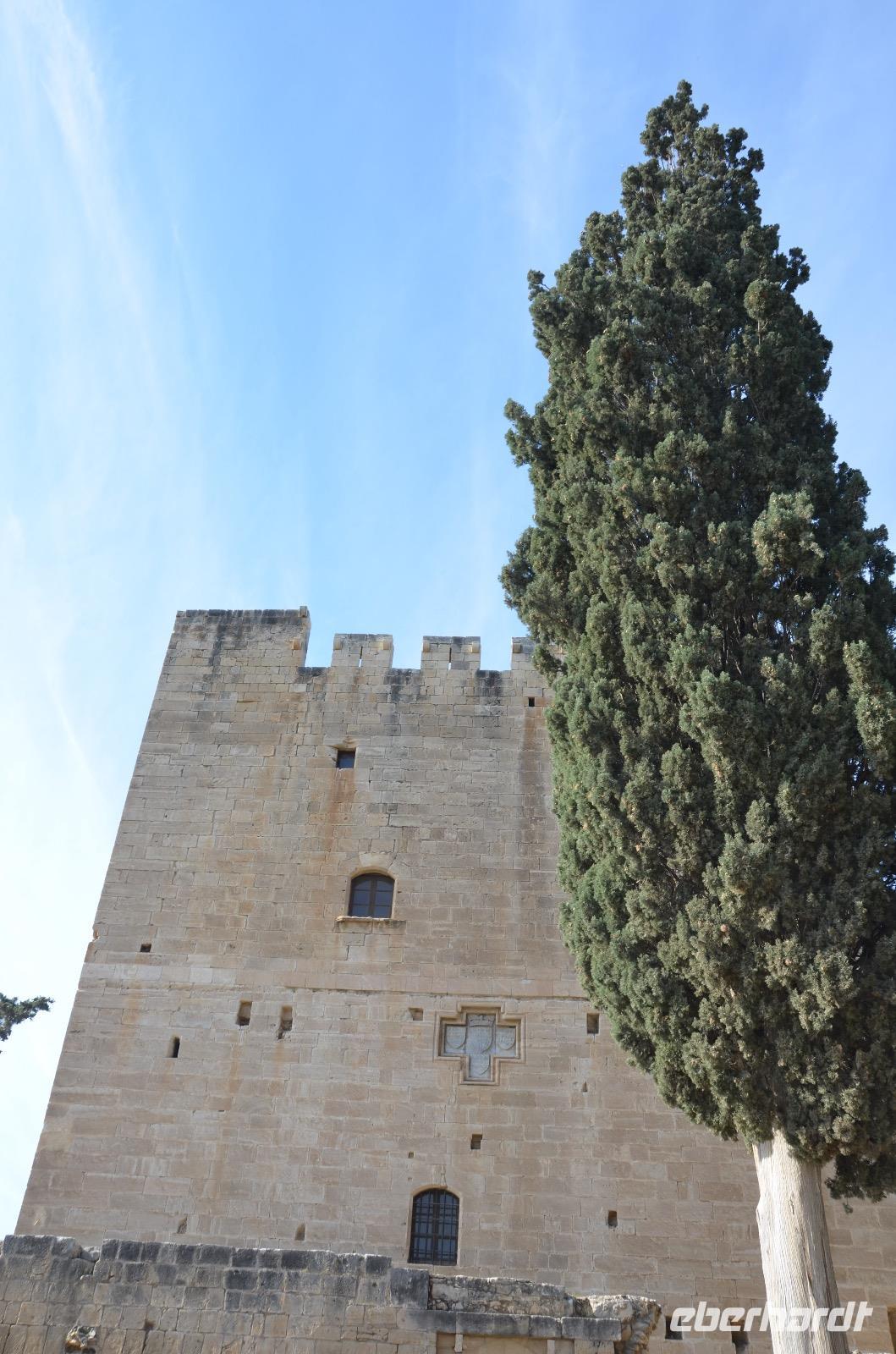 Wir fuhren weiter zur Kolossi-Burg. Die 3-stöckige Johanniterburg besitzt im vorderen Teil eine Zugbrücke, über die wir in das Gebäude gelangten. Hier durchliefen wir zuerst die Küche und danach die Schlafsäle. Auf der mittleren Etage bekam wir den Commandaria zu probieren. Der Name stammt von der Kommandantur der Johanniter. Sie stellten nicht nur den Dessertwein her, sondern bauten ebenfalls Zuckerrohr an. Zypern war der zweite Sitz der Johanniter, nach Jerusalem. Später folgten Malta und Deutschland. Bei dem grandiosen Wetter lohnte sich der Ausblick von der dritten Etage. Wir stiegen die schmale Wendeltreppe empor und genossen die warmen Sonnenstrahlen auf der Burg. Auch die Außenanlage ist einen Spaziergang wert und vorne am Kiosk gab es frisch gepressten Orangensaft, welchen wir uns nicht entgehen lassen wollten.