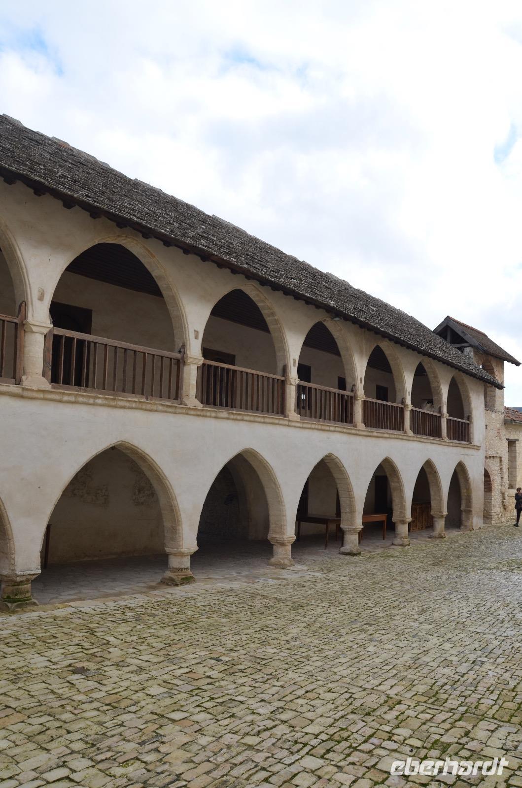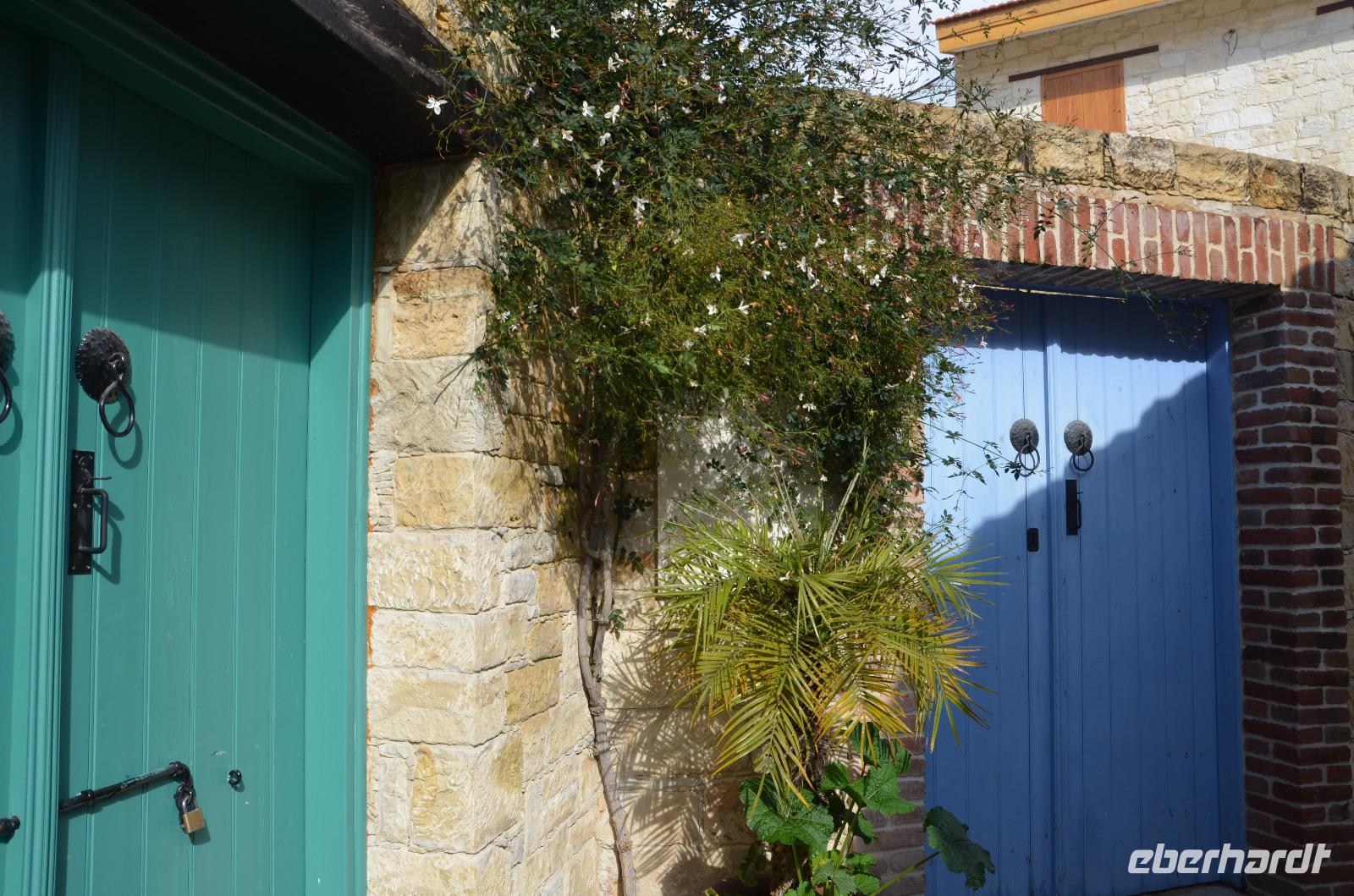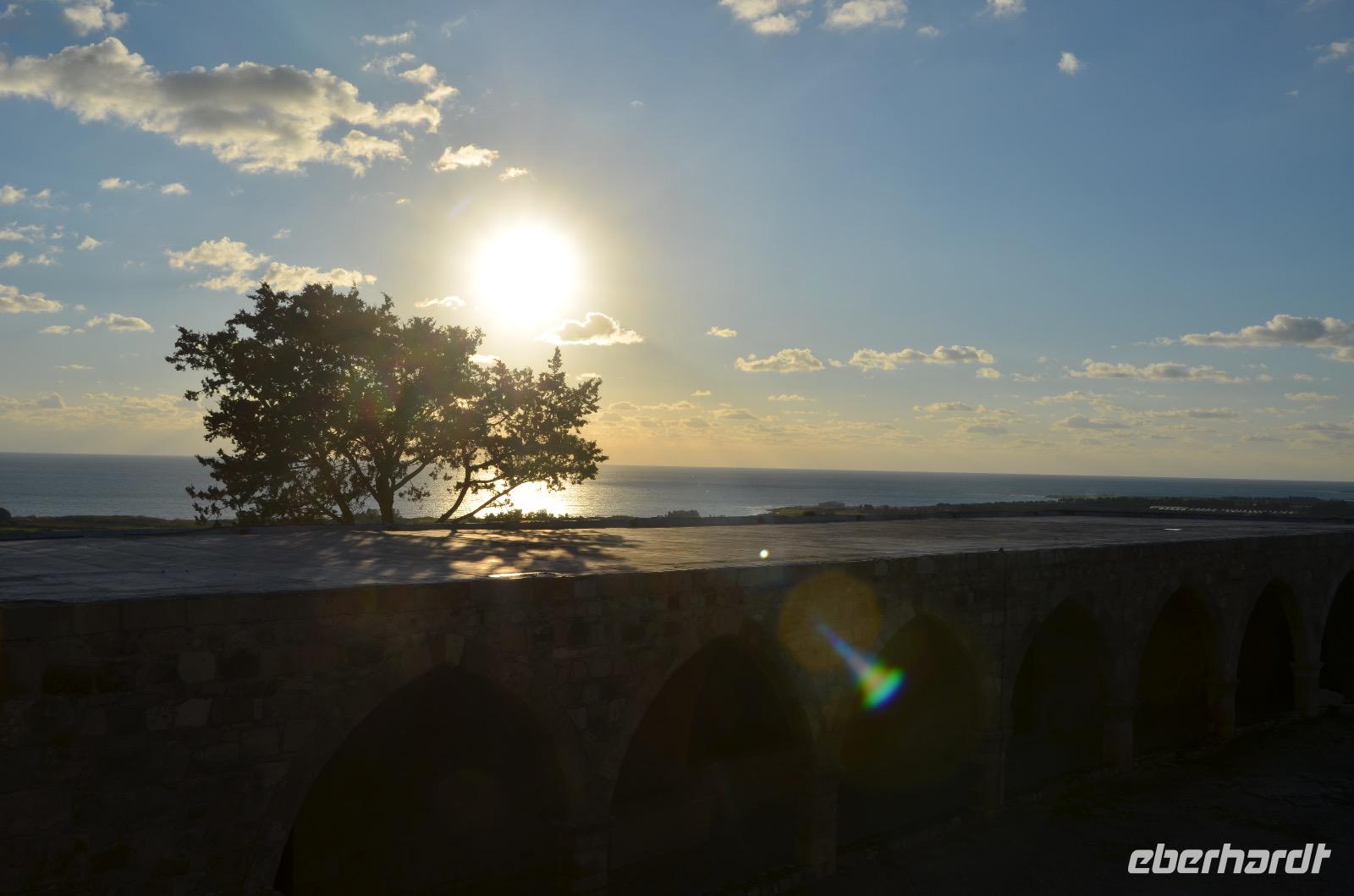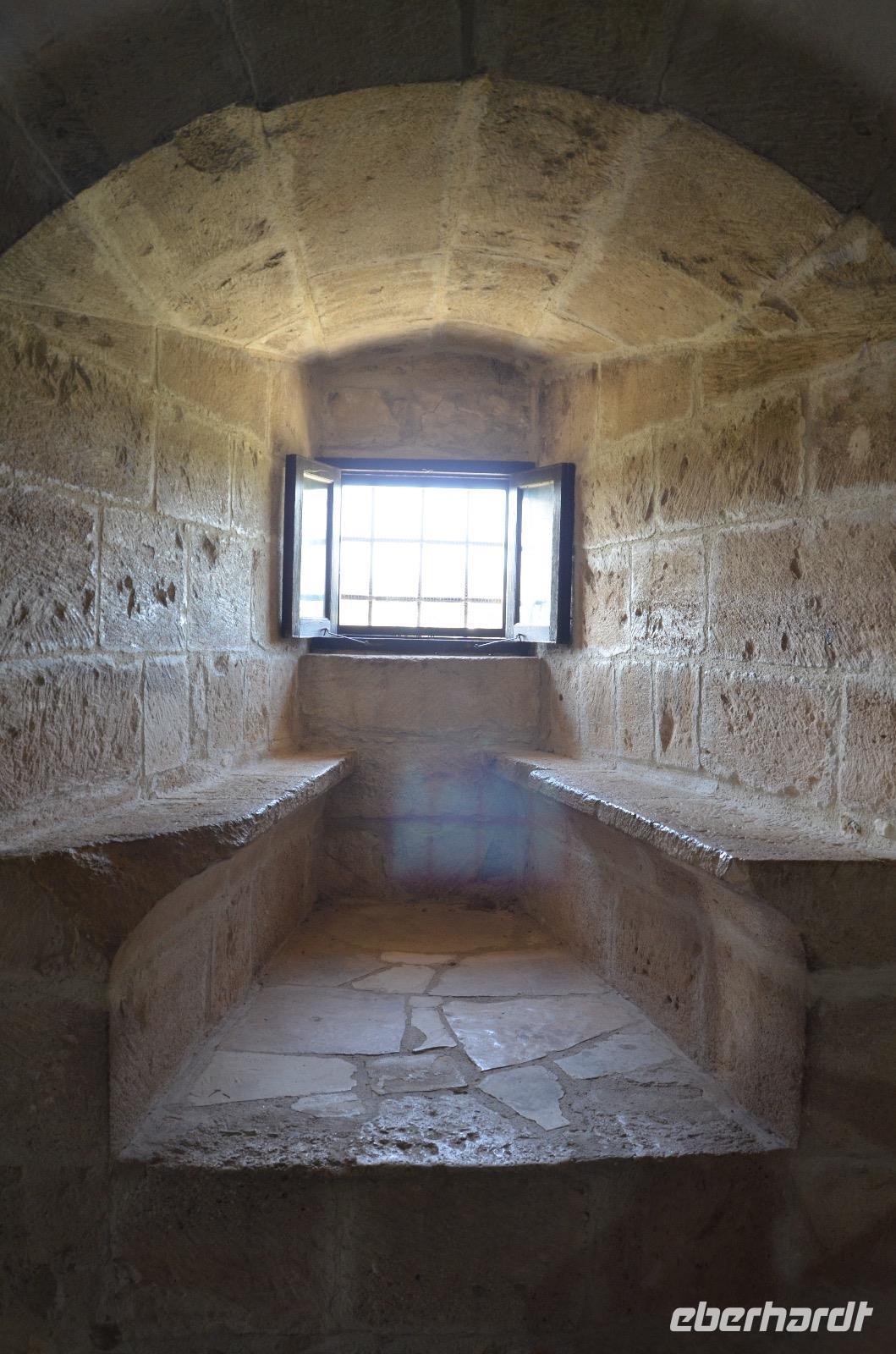 Wir fuhren weiter zur Kolossi-Burg. Die 3-stöckige Johanniterburg besitzt im vorderen Teil eine Zugbrücke, über die wir in das Gebäude gelangten. Hier durchliefen wir zuerst die Küche und danach die Schlafsäle. Auf der mittleren Etage bekam wir den Commandaria zu probieren. Der Name stammt von der Kommandantur der Johanniter. Sie stellten nicht nur den Dessertwein her, sondern bauten ebenfalls Zuckerrohr an. Zypern war der zweite Sitz der Johanniter, nach Jerusalem. Später folgten Malta und Deutschland. Bei dem grandiosen Wetter lohnte sich der Ausblick von der dritten Etage. Wir stiegen die schmale Wendeltreppe empor und genossen die warmen Sonnenstrahlen auf der Burg. Auch die Außenanlage ist einen Spaziergang wert und vorne am Kiosk gab es frisch gepressten Orangensaft, welchen wir uns nicht entgehen lassen wollten.