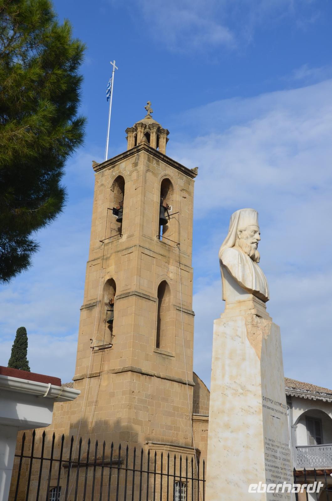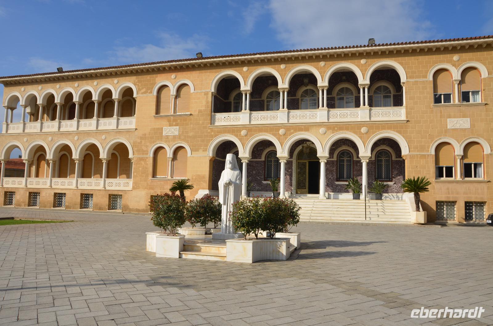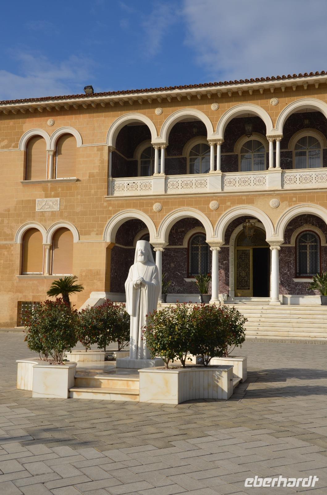 Auch heute noch spielt die orthodoxe Kirche in Zypern eine wichtige Rolle. Eine dieser Kirchen war unser erster Besichtigungspunkt. Wir stiegen an der Stadtmauer von Nikosia aus dem Bus. Vorbei an dem ältesten Gymnasium der Stadt sowie der Bibliothek, gelangen wir zum Erzbistum. Davor die Statue Makarios und vor allem für die Männer unter uns interessant, seine ehemaligen Fahrzeuge.
