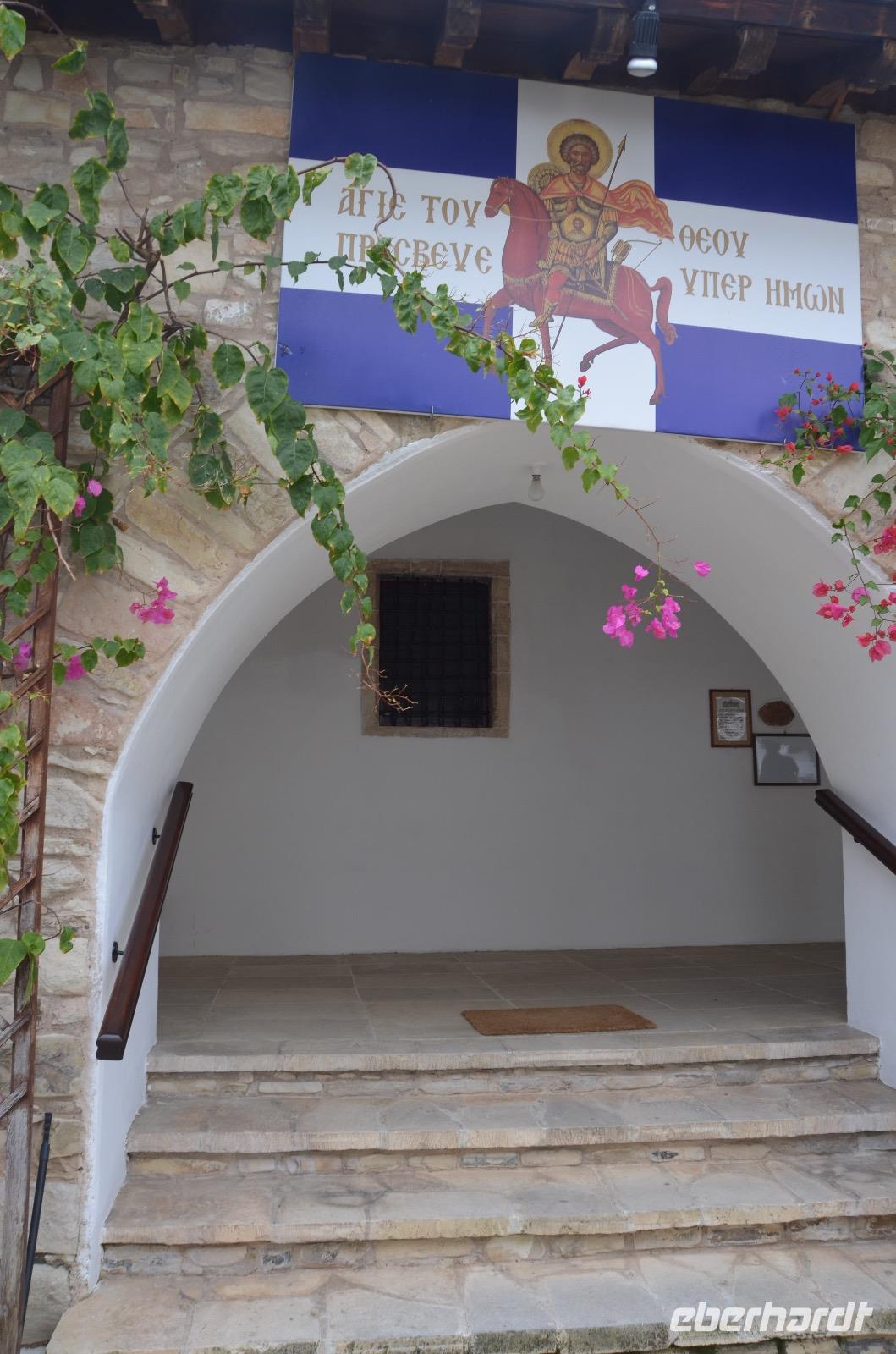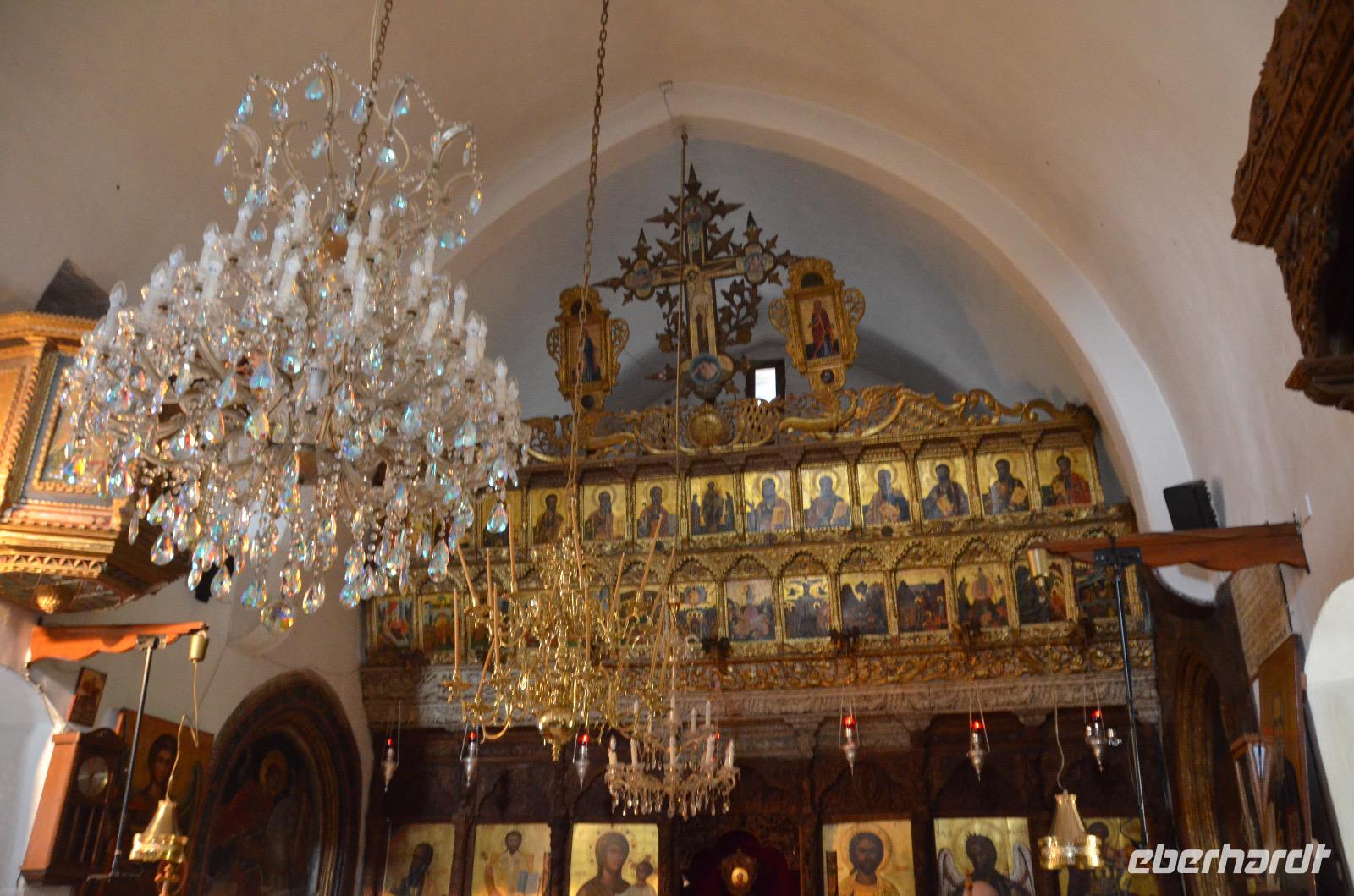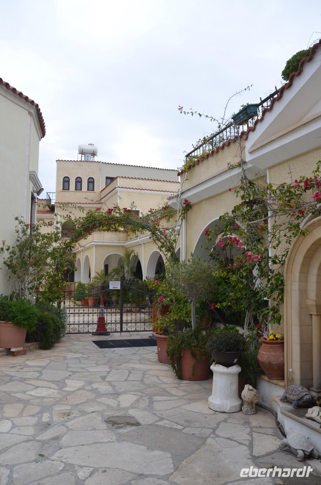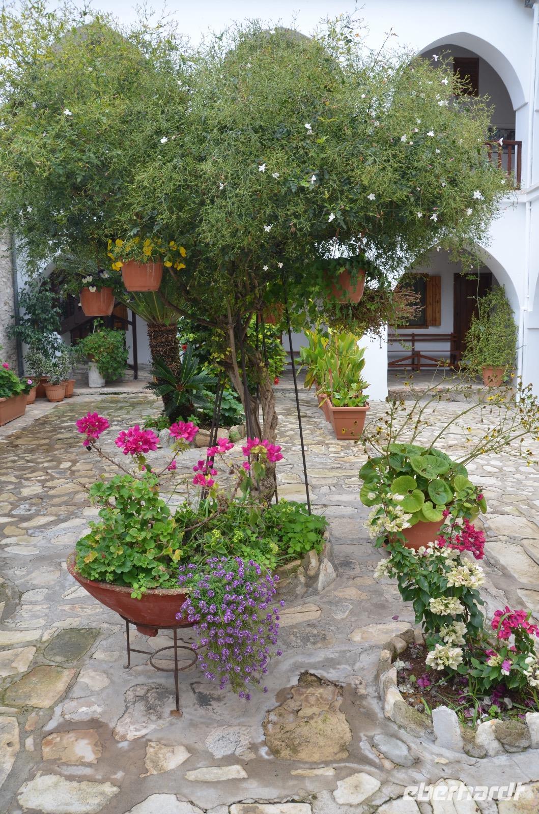 Um dem Thema des heutigen Tages gerecht zu werden, fuhren wir zum nächsten Kloster, dem Agios Minas. Der heilige Namensgeber war ein römischer Soldat, der das Christentum verehrte. Das 1574 erbaute Kloster wurde anfangs von Mönchen besiedelt, bis es dann zu einem Frauenkloster wurde. Auch hier fanden wir eine schöne gepflegte Anlage vor, die in den 1930er-Jahren renoviert wurde. Heutzutage leben hier noch ungefähr 10 - 12 aktive Nonnen, die unter anderem selbstgemachte Marmelade und Obst verkaufen, um das Kloster ein wenig zu finanzieren.
