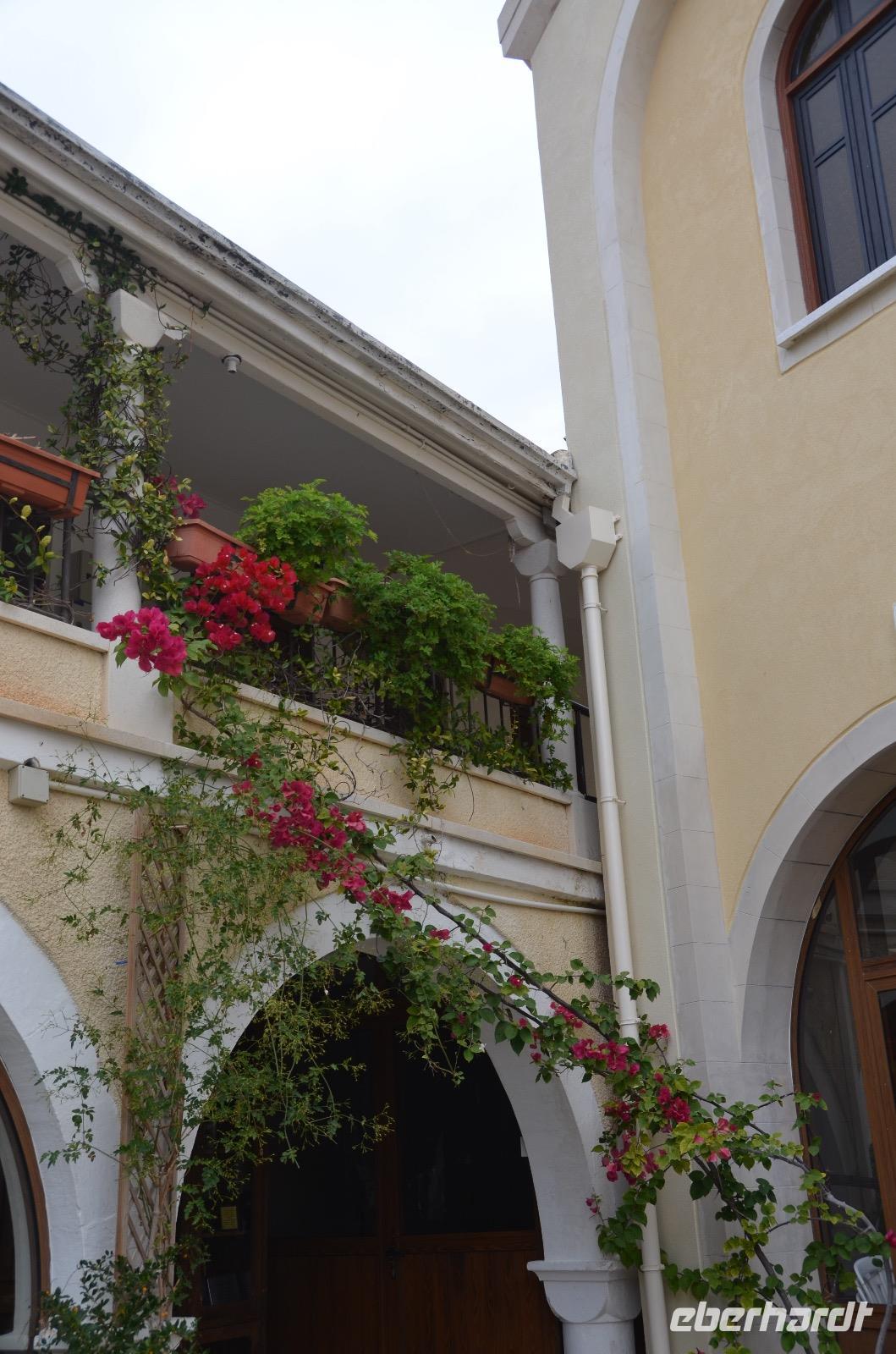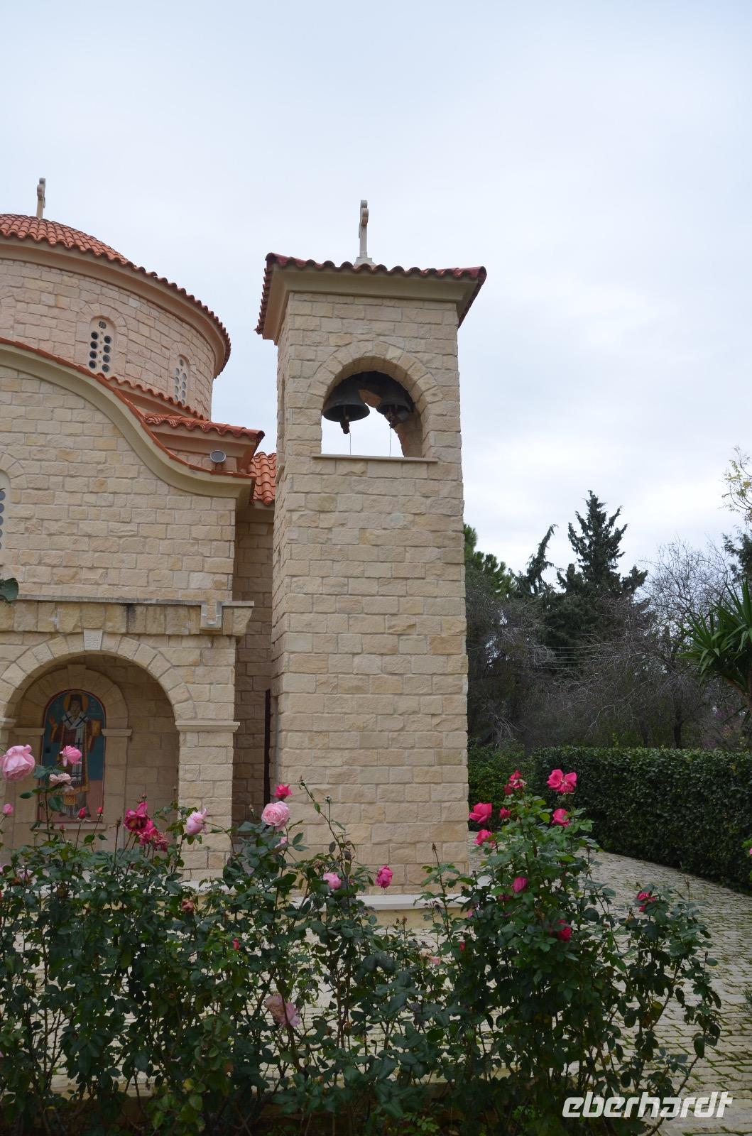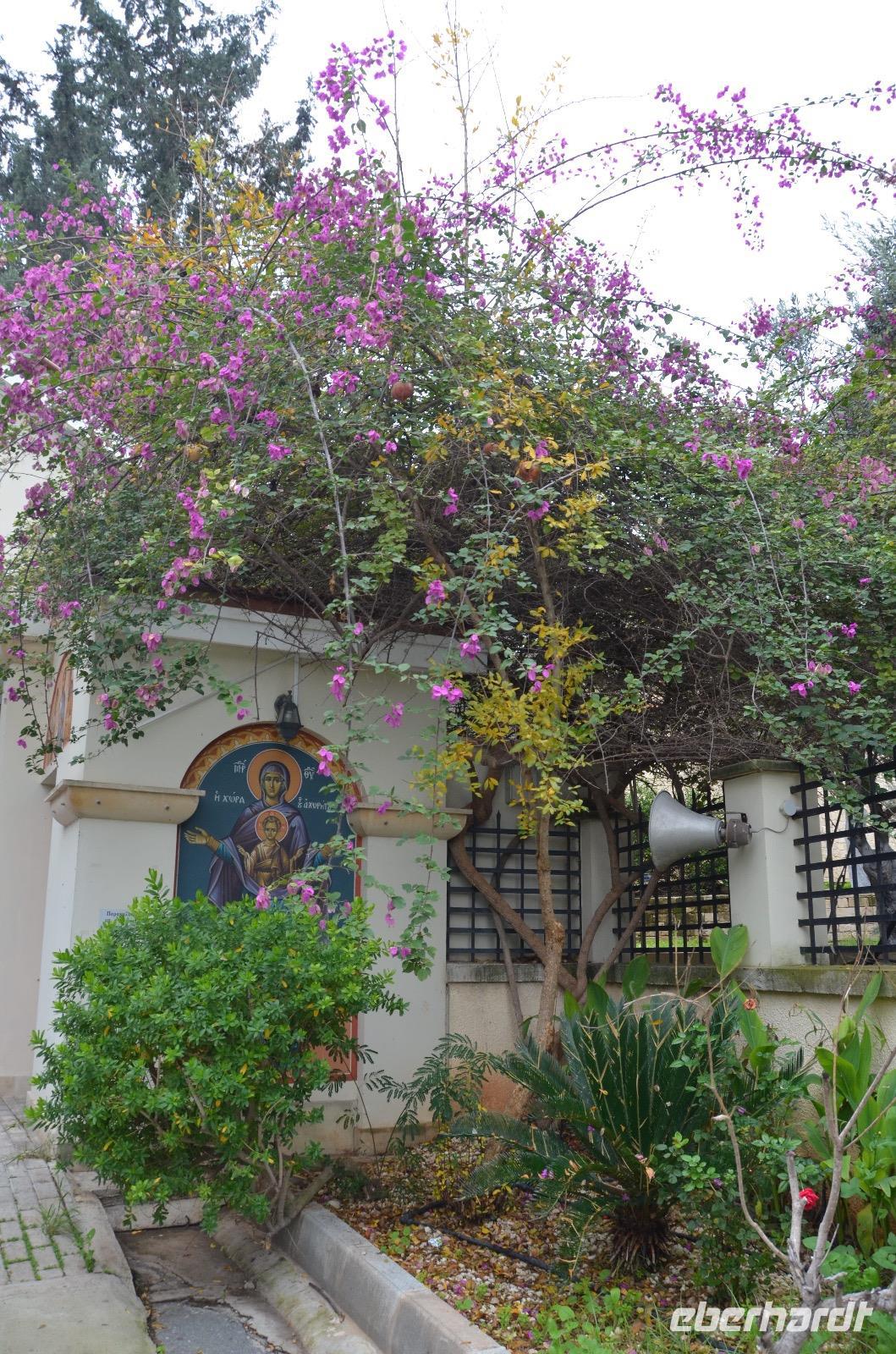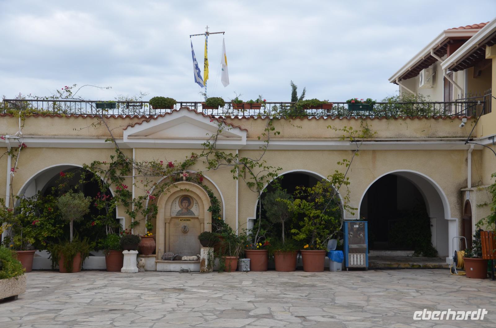 Um dem Thema des heutigen Tages gerecht zu werden, fuhren wir zum nächsten Kloster, dem Agios Minas. Der heilige Namensgeber war ein römischer Soldat, der das Christentum verehrte. Das 1574 erbaute Kloster wurde anfangs von Mönchen besiedelt, bis es dann zu einem Frauenkloster wurde. Auch hier fanden wir eine schöne gepflegte Anlage vor, die in den 1930er-Jahren renoviert wurde. Heutzutage leben hier noch ungefähr 10 - 12 aktive Nonnen, die unter anderem selbstgemachte Marmelade und Obst verkaufen, um das Kloster ein wenig zu finanzieren.