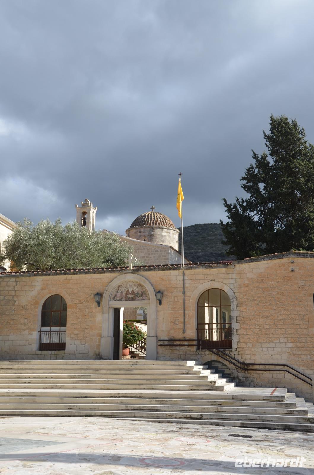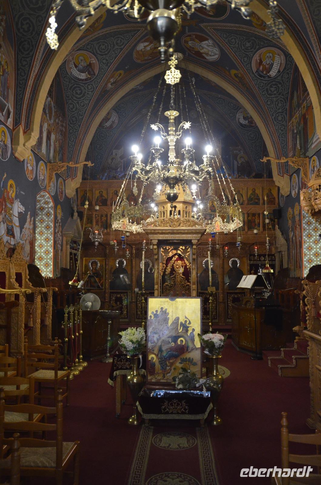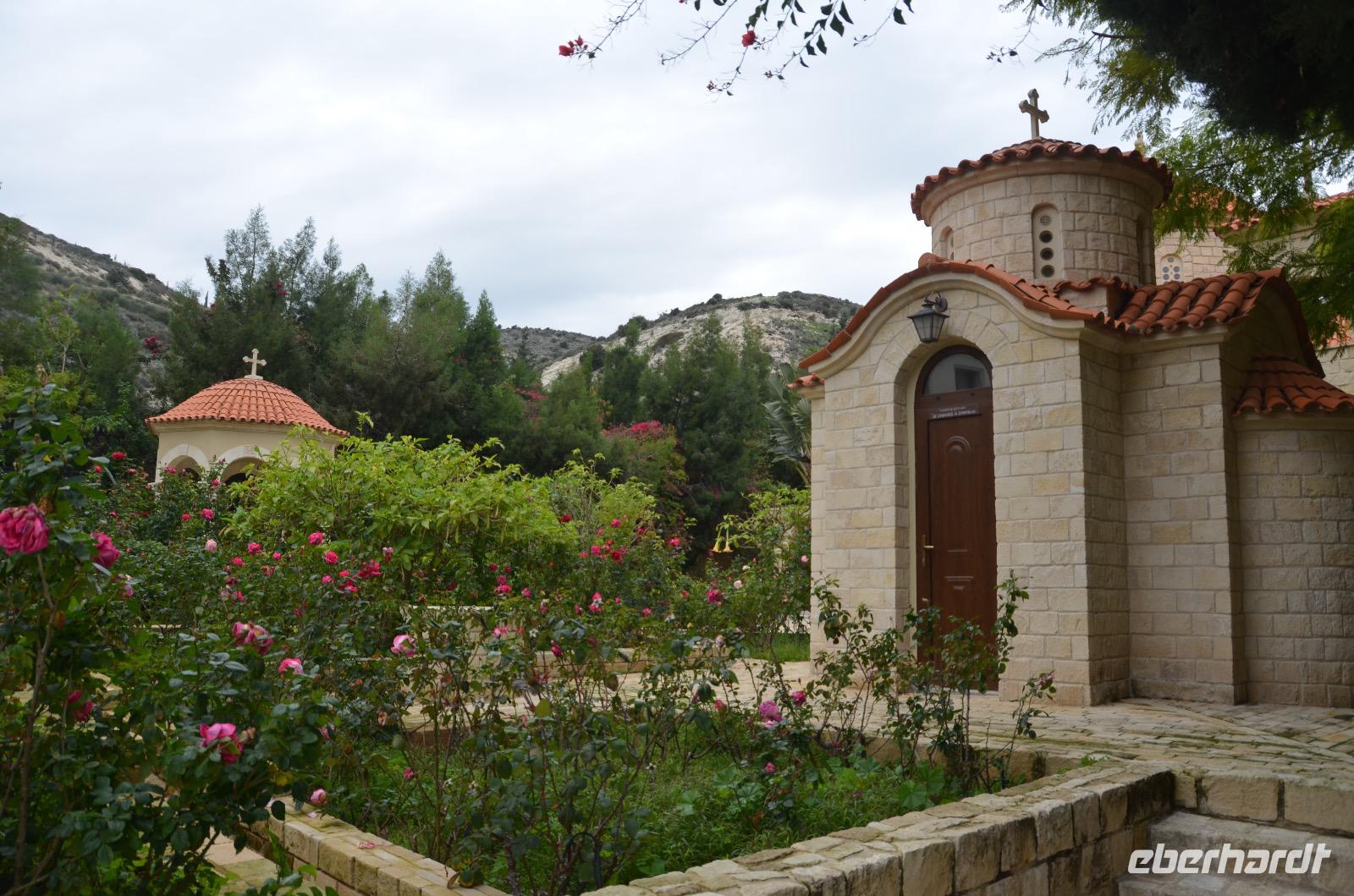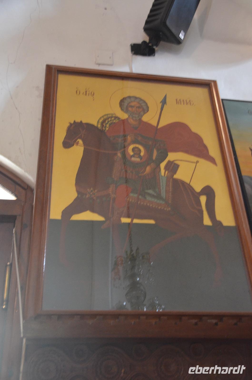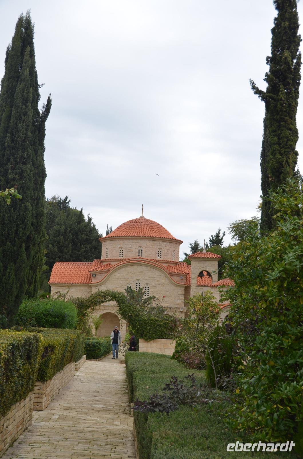Um dem Thema des heutigen Tages gerecht zu werden, fuhren wir zum nächsten Kloster, dem Agios Minas. Der heilige Namensgeber war ein römischer Soldat, der das Christentum verehrte. Das 1574 erbaute Kloster wurde anfangs von Mönchen besiedelt, bis es dann zu einem Frauenkloster wurde. Auch hier fanden wir eine schöne gepflegte Anlage vor, die in den 1930er-Jahren renoviert wurde. Heutzutage leben hier noch ungefähr 10 - 12 aktive Nonnen, die unter anderem selbstgemachte Marmelade und Obst verkaufen, um das Kloster ein wenig zu finanzieren.