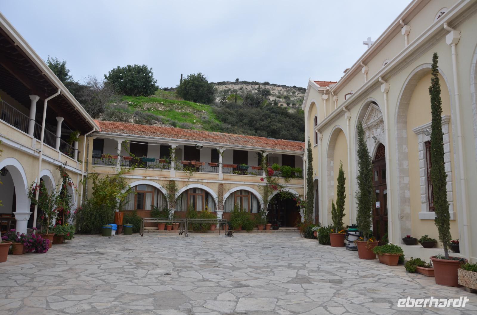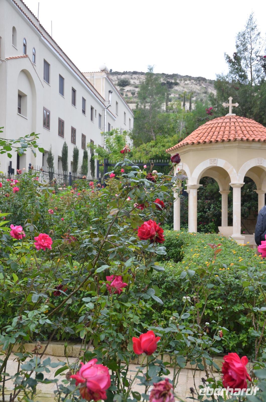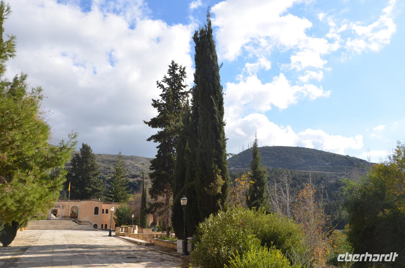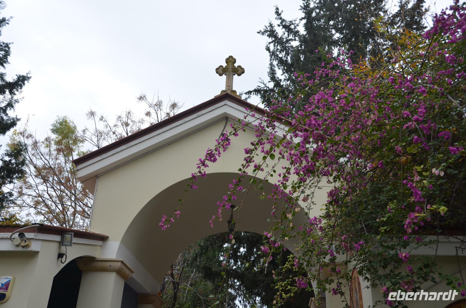 Um dem Thema des heutigen Tages gerecht zu werden, fuhren wir zum nächsten Kloster, dem Agios Minas. Der heilige Namensgeber war ein römischer Soldat, der das Christentum verehrte. Das 1574 erbaute Kloster wurde anfangs von Mönchen besiedelt, bis es dann zu einem Frauenkloster wurde. Auch hier fanden wir eine schöne gepflegte Anlage vor, die in den 1930er-Jahren renoviert wurde. Heutzutage leben hier noch ungefähr 10 - 12 aktive Nonnen, die unter anderem selbstgemachte Marmelade und Obst verkaufen, um das Kloster ein wenig zu finanzieren.