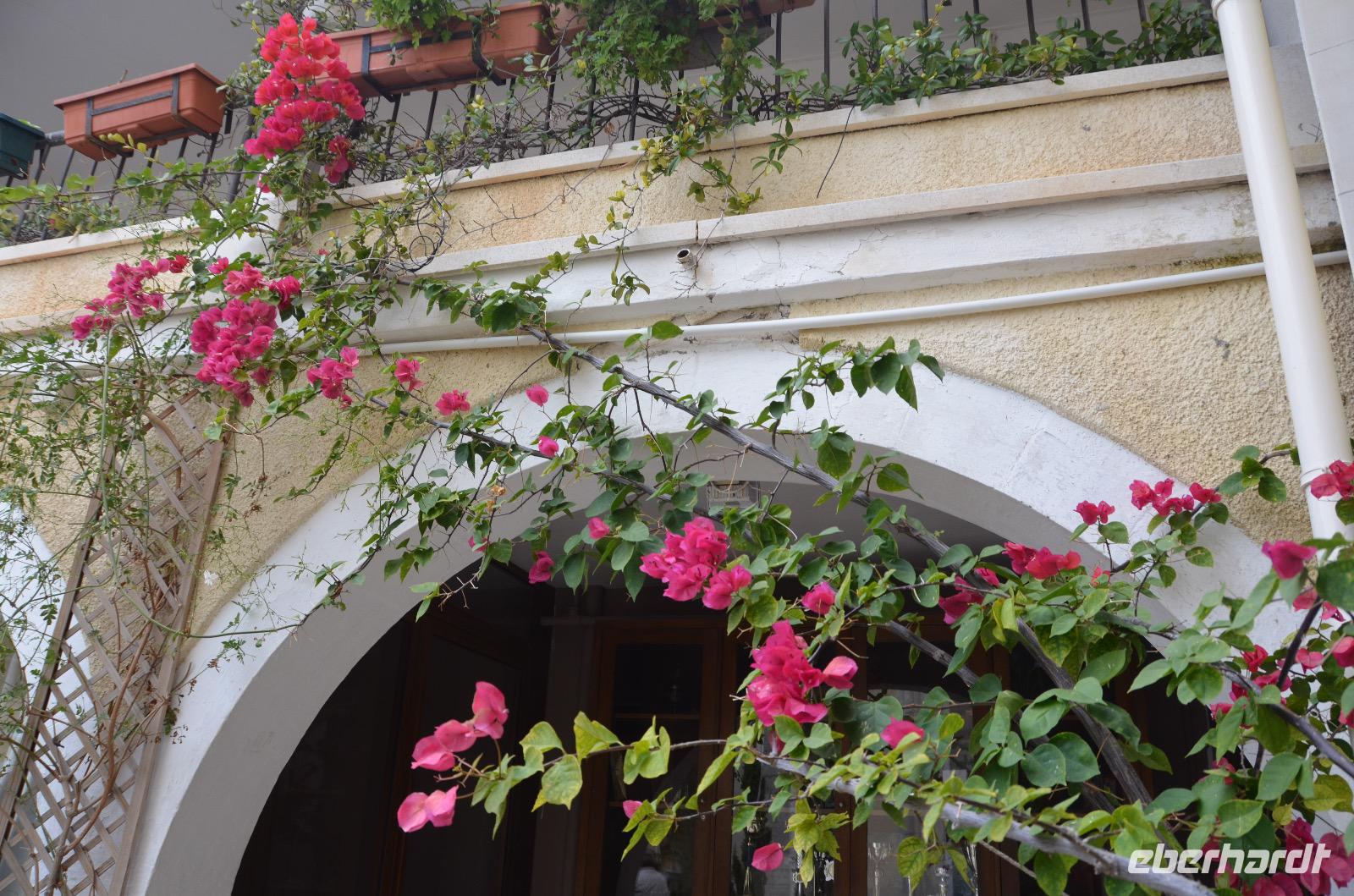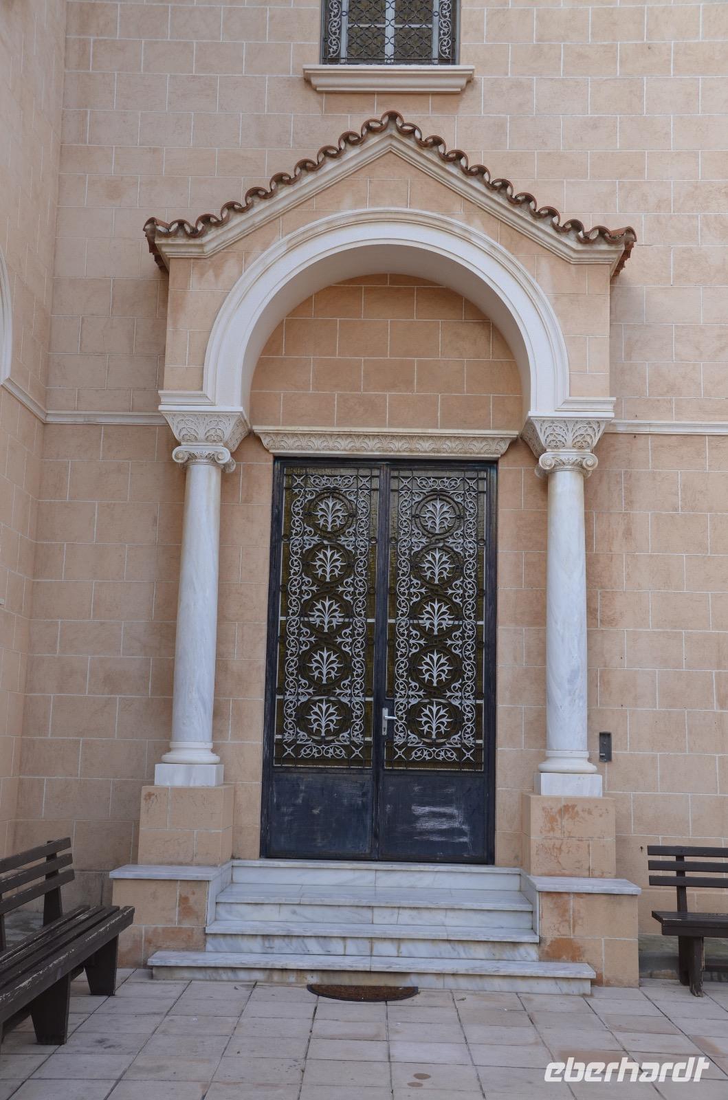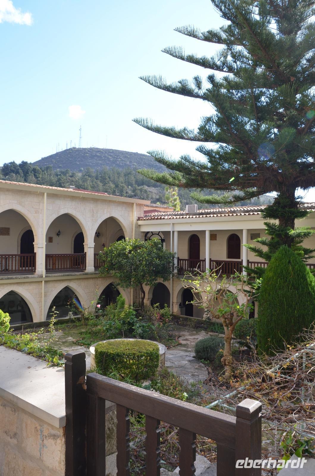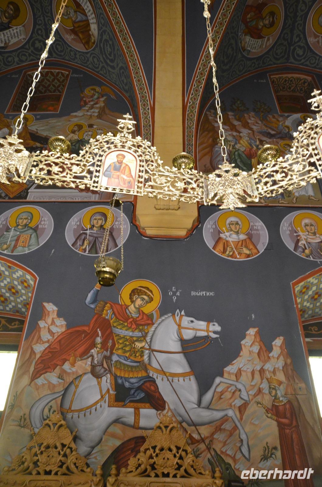 Um dem Thema des heutigen Tages gerecht zu werden, fuhren wir zum nächsten Kloster, dem Agios Minas. Der heilige Namensgeber war ein römischer Soldat, der das Christentum verehrte. Das 1574 erbaute Kloster wurde anfangs von Mönchen besiedelt, bis es dann zu einem Frauenkloster wurde. Auch hier fanden wir eine schöne gepflegte Anlage vor, die in den 1930er-Jahren renoviert wurde. Heutzutage leben hier noch ungefähr 10 - 12 aktive Nonnen, die unter anderem selbstgemachte Marmelade und Obst verkaufen, um das Kloster ein wenig zu finanzieren.