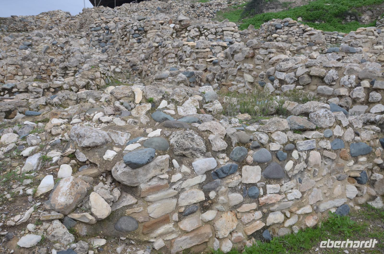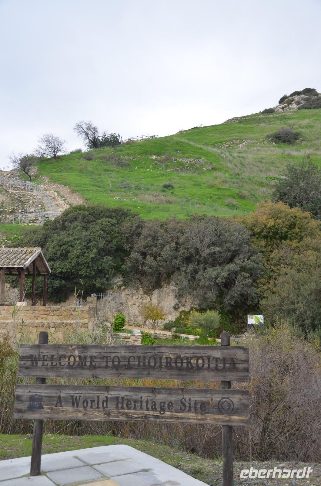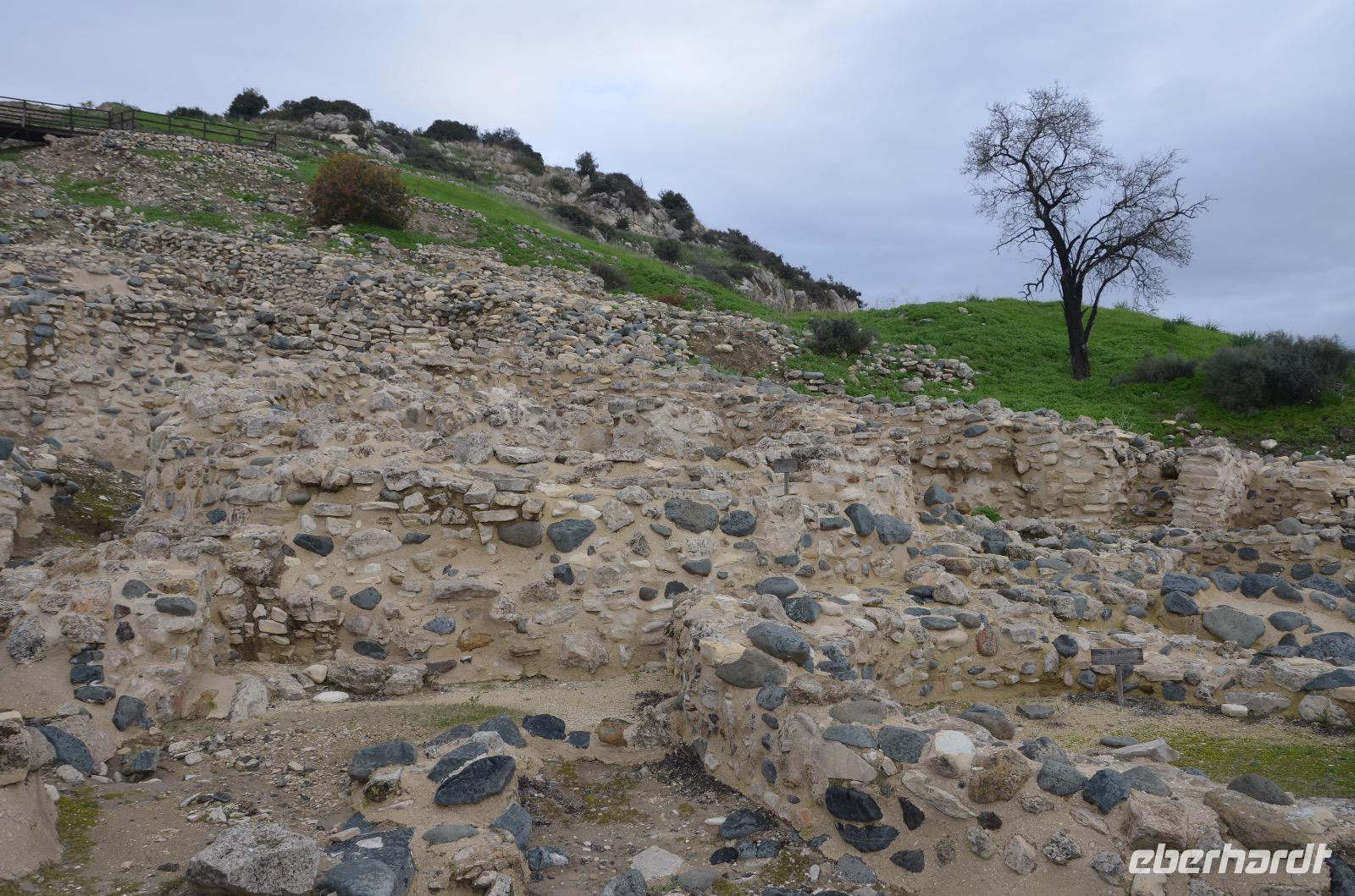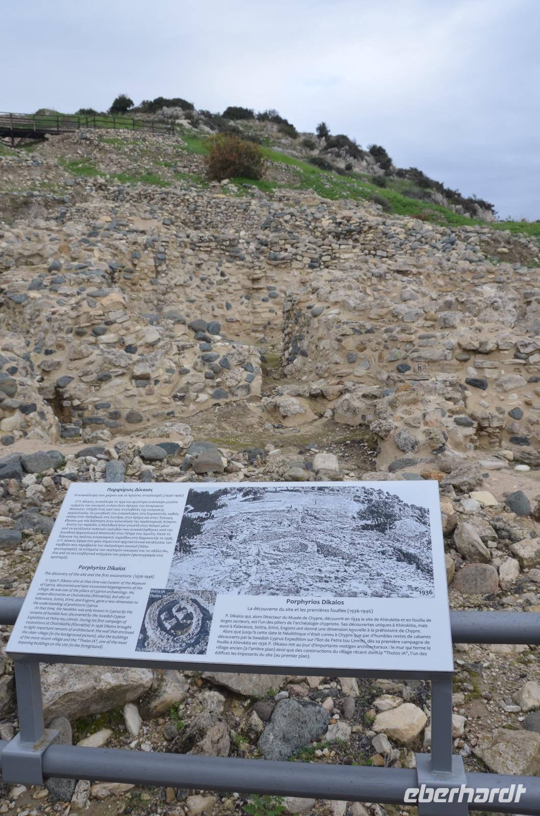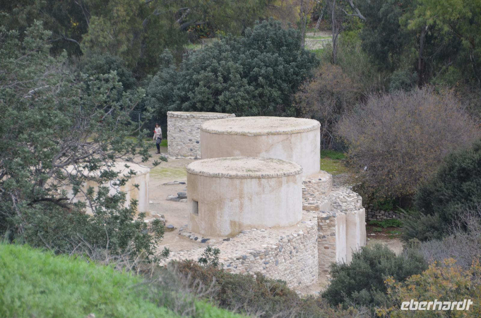 Als erstes besuchten wir heute das Agios Georgius. Das Nonnenkloster verzauberte uns mit seinem Innenhof mit den vielen bunten Blühten und den tragenden Obstbäumen, die ein tolles Fotomotiv boten. Nach dem Besuch der Kirche bekamen wir von einer der Nonnen Gebäck geschenkt, bevor es weiter zu der Jungsteinzeitsiedlung ging. Als wir in Chiroktitia ankamen, besichtigten wir erst die Nachbildung der Siedlung. Die Hütten waren rund und bestanden unten aus Stein und darüber aus Lehm. Bereits 7500 Jahre v. Chr. war dies eine organisierte Siedlung mit Anführer, Haustieren, Getreideanbau und Webstühlen. Man sagt der Ausgrabungsstätte nach, dass hier die erste Katze gefunden wurden sein soll. Die Lebenserwartung eines Menschen betrug damals 30 - 35 Jahre. Die Verstorbenen wurden unter den Häusern gekrümmt und mit einem Stein auf der Brust vergraben. Der Kreis des Lebens sollte somit geschlossen werden. Die embryonale Stellung bildet den ersten Halbkreis, die Position im Grab den zweiten.