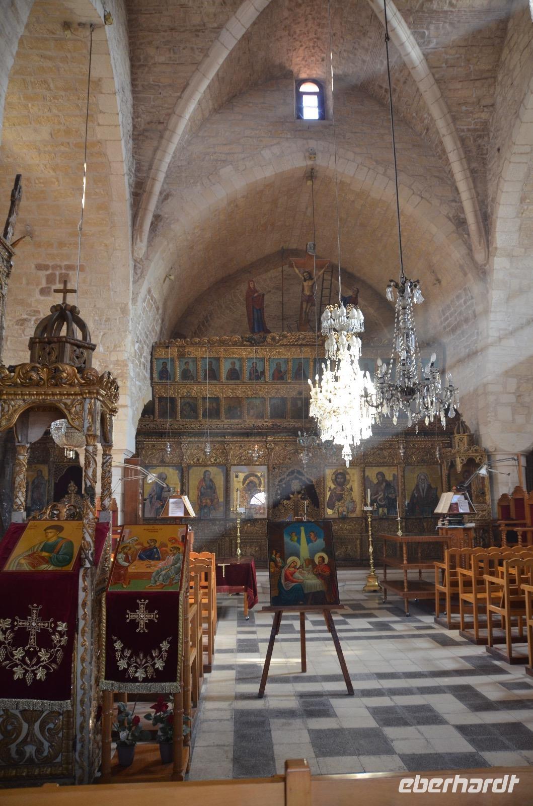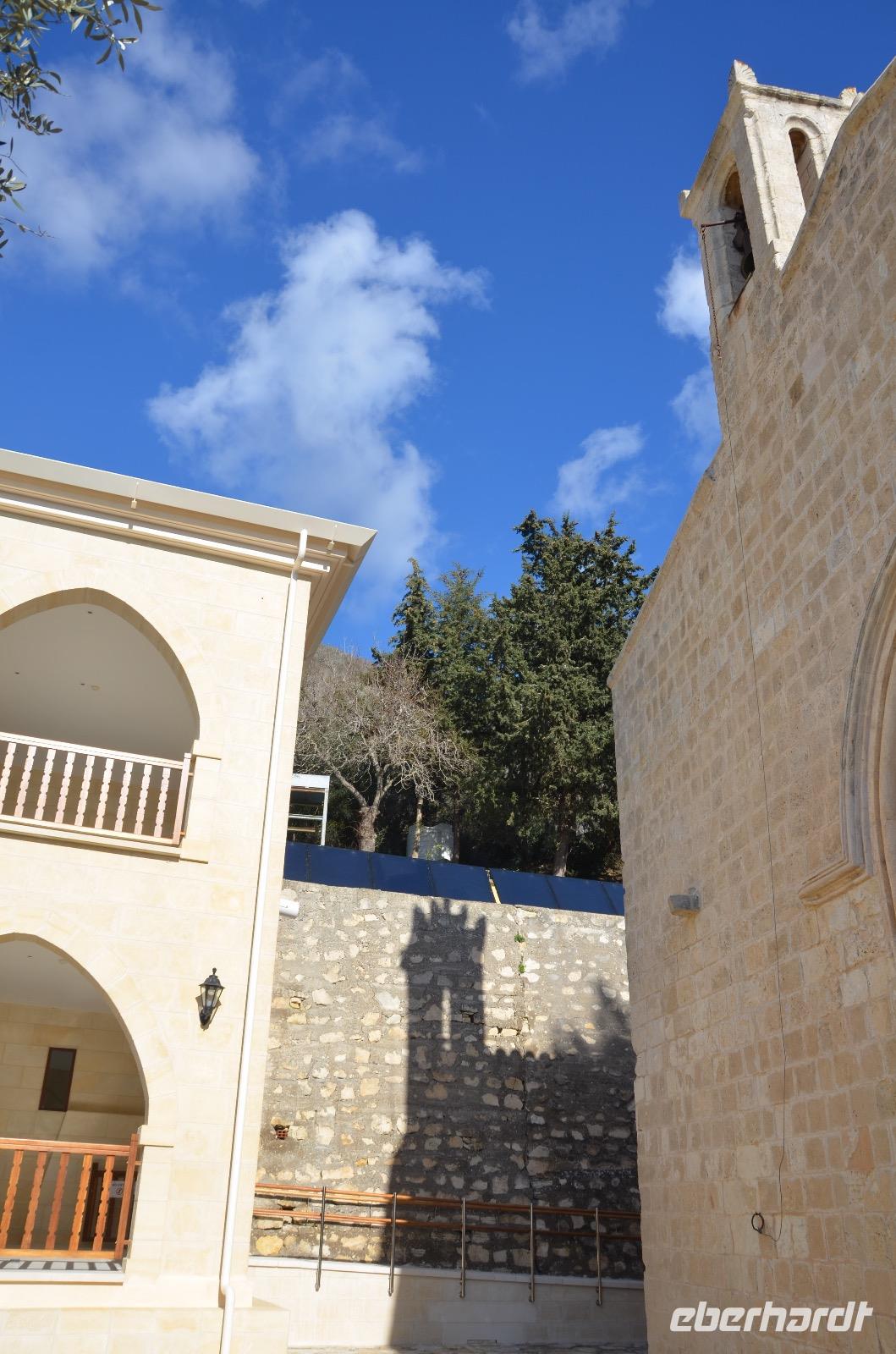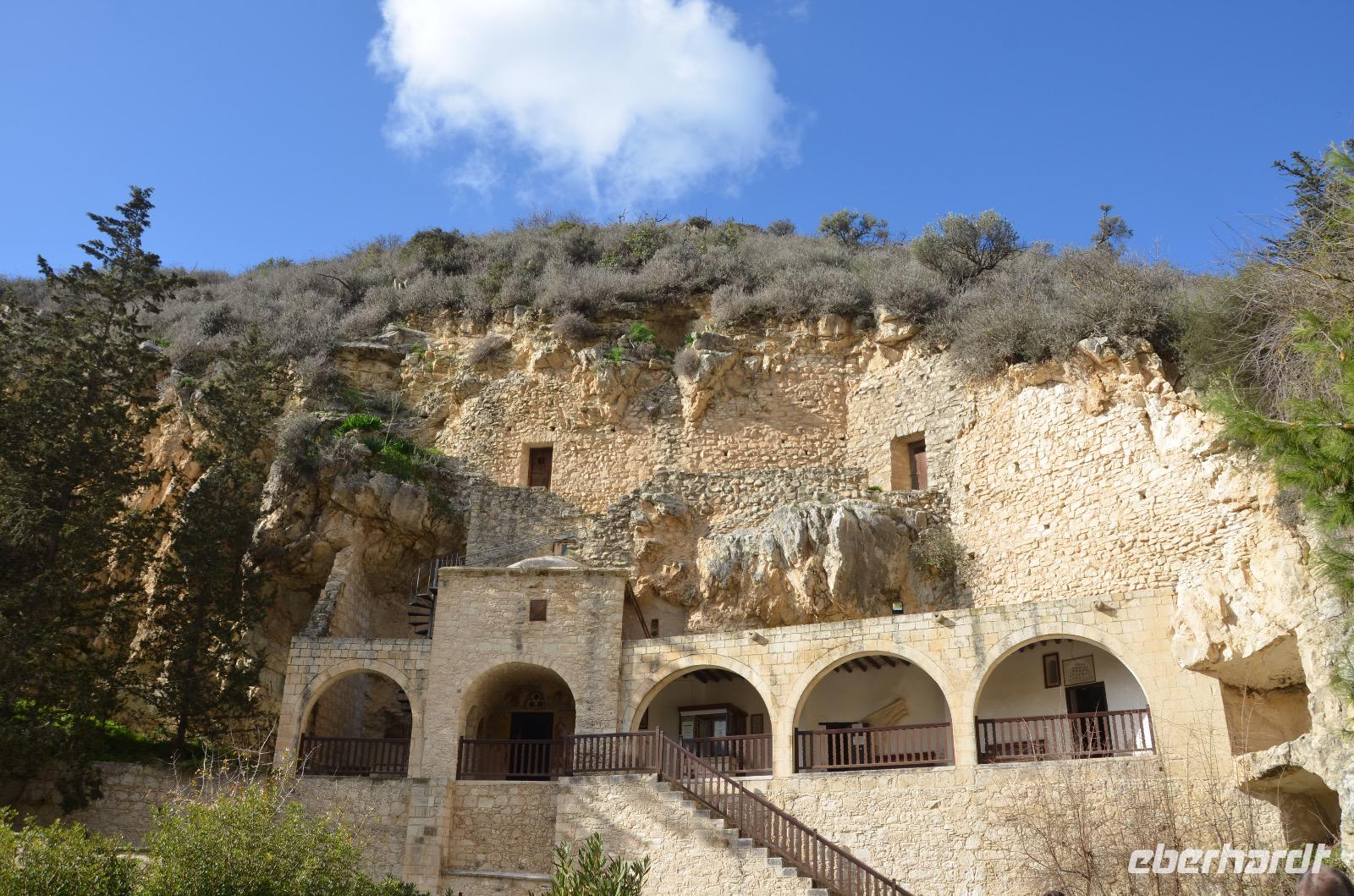 Weiter ging es zum Kloster St. Neophytos. Hier befindet sich eine kleine Höhlenkirche, die nach dem Heiligen benannt wurde, der als erster eine schriftliche Klosterordnung verfasste. Im Innenraum bewunderten wir die Wandmalerei aus dem 12. Jahrhundert. Typisch für die byzantinische Kunst sind ein strenges Gesicht, große Augen, ein kleiner fleischiger Mund und eine große schiefe Nase. Man konnte auch einige Bilder erkennen, bei denen die Proportionen nicht stimmen. Hier vermutet man, dass der Maler mit dieser Darstellung zeigen wollte, dass die Kirche für alle ist. Egal, ob gesund oder krank, groß oder klein. Durch winzige Türen gelangten wir auch in den Wohn- und Speiseraum.