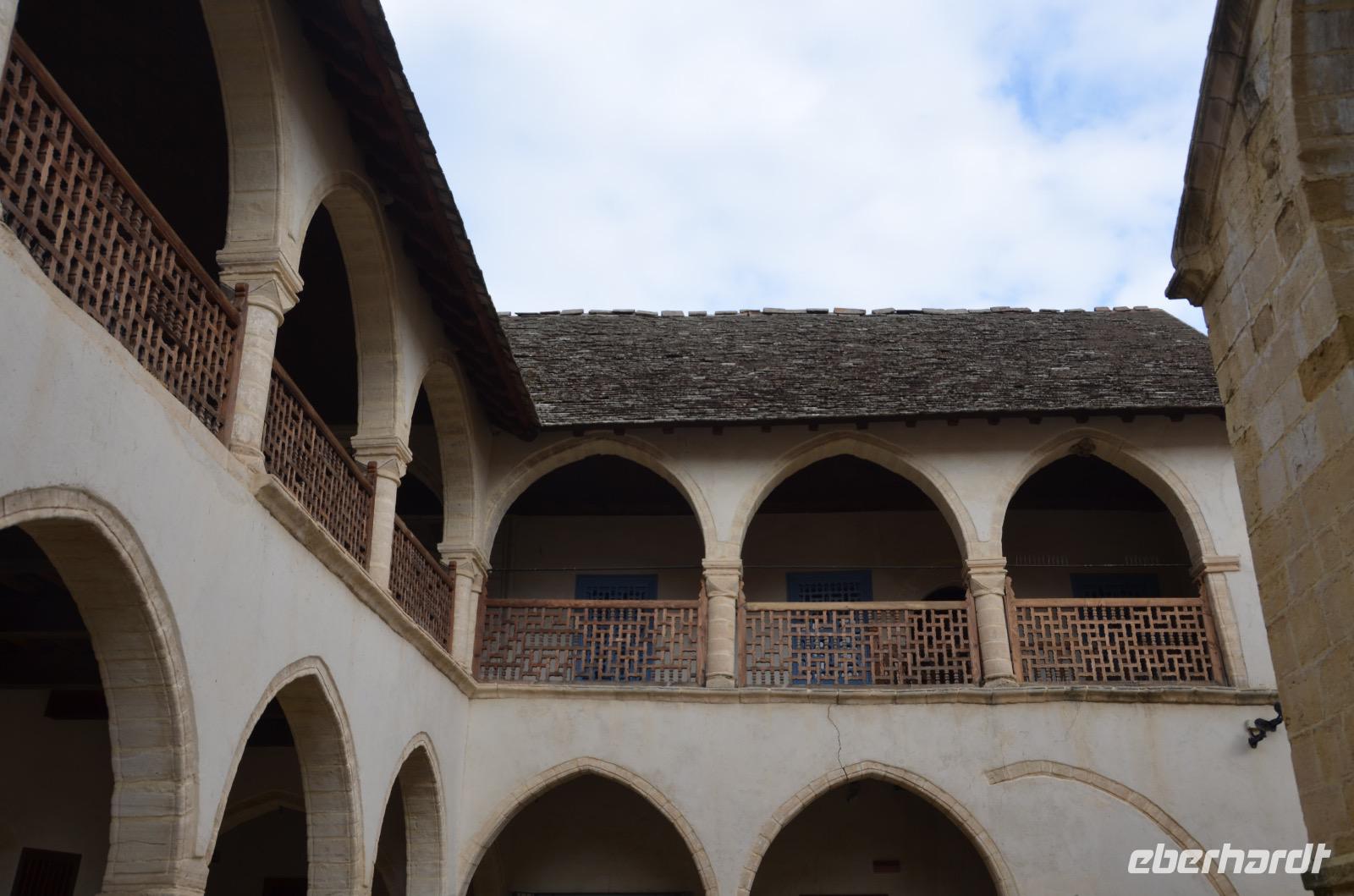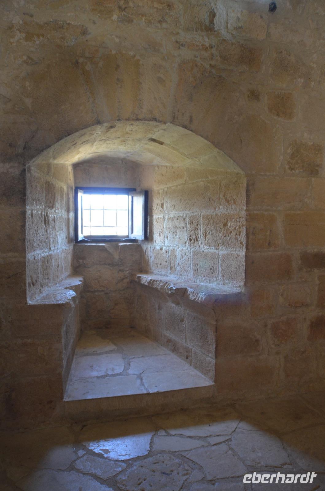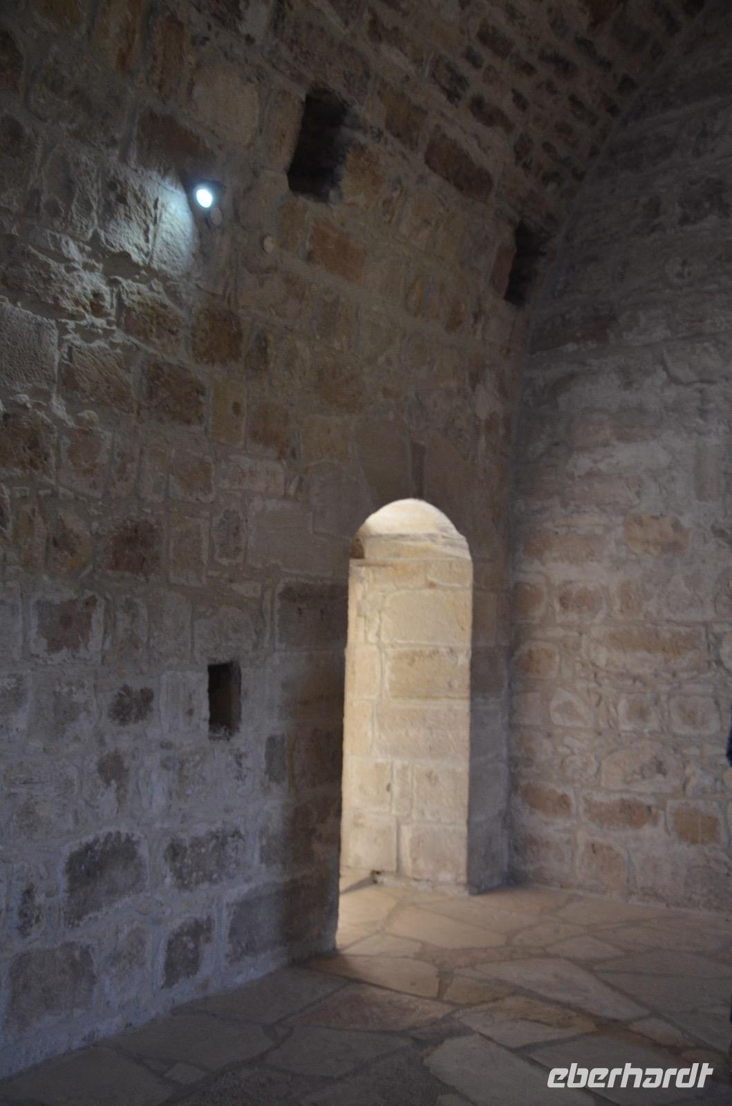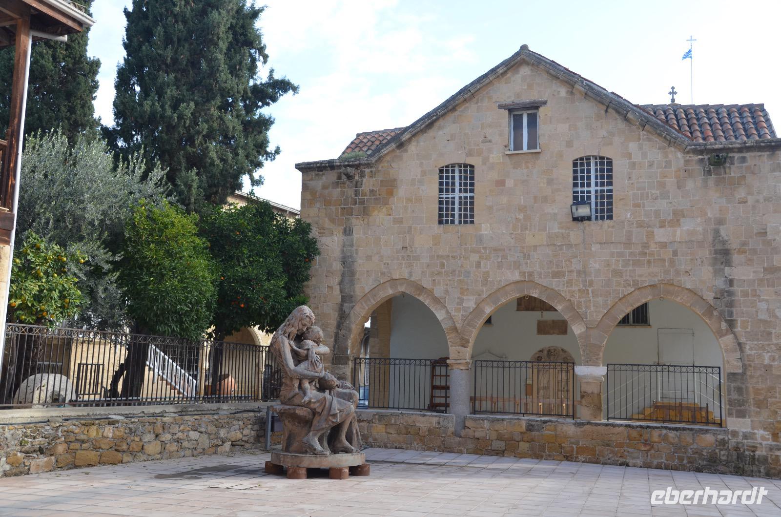 Weiter ging es zum Kloster St. Neophytos. Hier befindet sich eine kleine Höhlenkirche, die nach dem Heiligen benannt wurde, der als erster eine schriftliche Klosterordnung verfasste. Im Innenraum bewunderten wir die Wandmalerei aus dem 12. Jahrhundert. Typisch für die byzantinische Kunst sind ein strenges Gesicht, große Augen, ein kleiner fleischiger Mund und eine große schiefe Nase. Man konnte auch einige Bilder erkennen, bei denen die Proportionen nicht stimmen. Hier vermutet man, dass der Maler mit dieser Darstellung zeigen wollte, dass die Kirche für alle ist. Egal, ob gesund oder krank, groß oder klein. Durch winzige Türen gelangten wir auch in den Wohn- und Speiseraum.