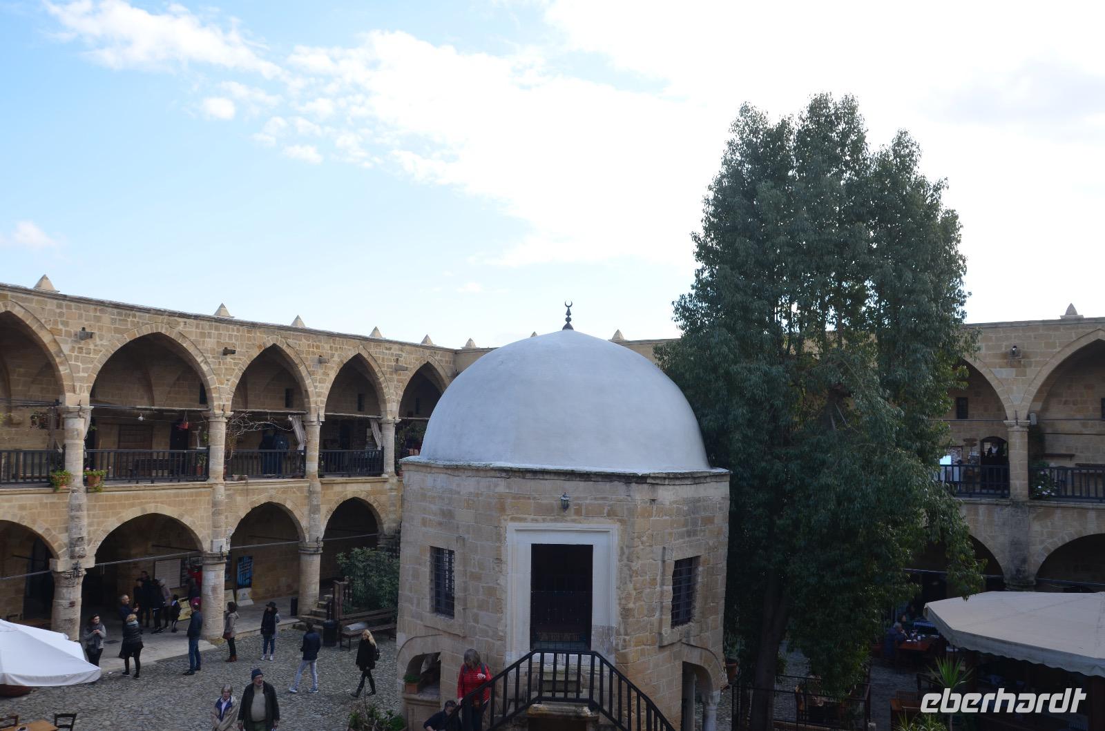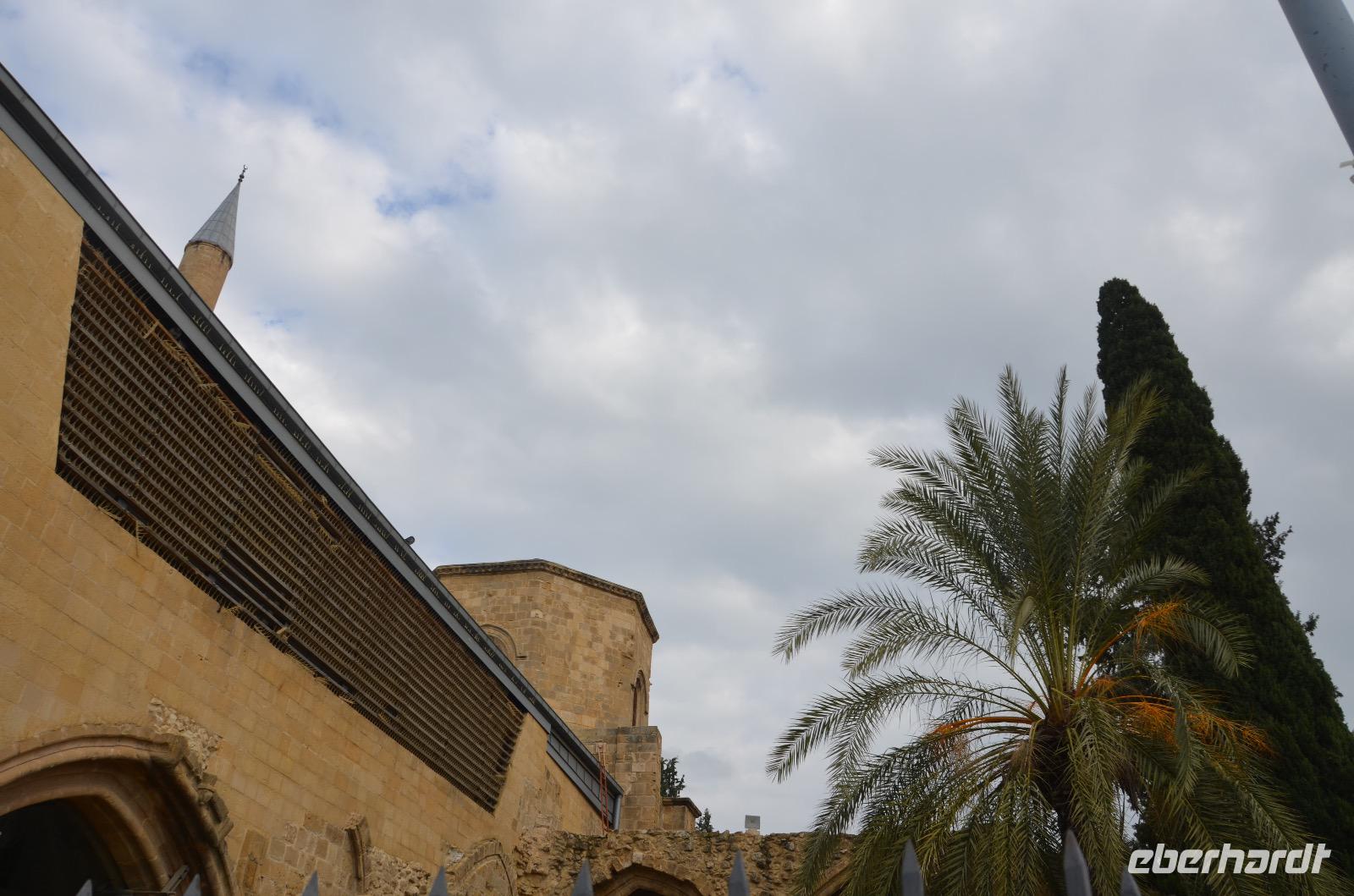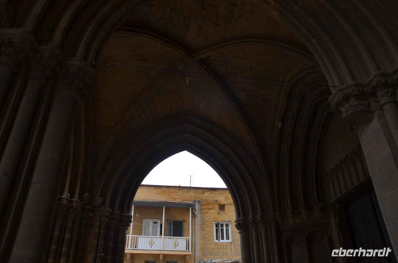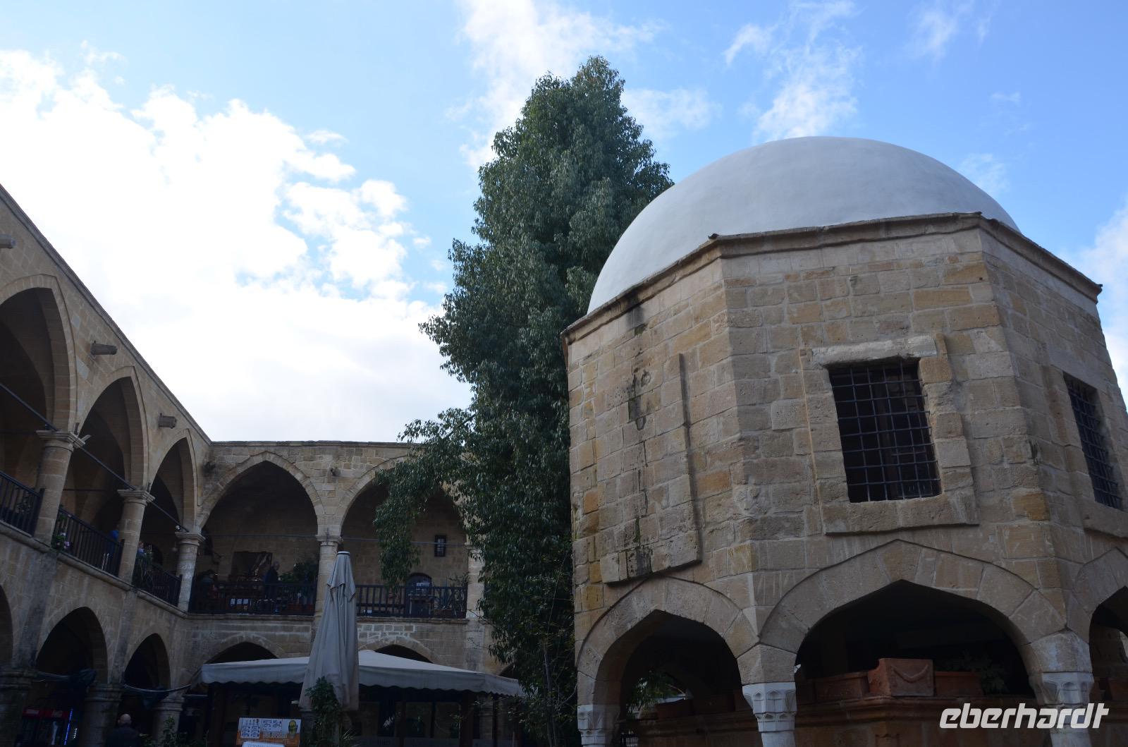 Bedächtigt starteten wir unseren Spaziergang durch Nikosia. Wir bummelten entlang der Ausgrabungen eines französischen Palastes aus dem 12. Jahrhundert, dem neuen Rathaus, welches ein Glasgestell über dem alten Gebäude darstellt und kommen schließlich zur ehemaligen Geschäftsstraße. Sehr verlassen und bedrückend wirken die Gassen. Nur noch ein paar alte Gewerke, wie Tischler haben sich hier niedergelassen. Immer näher kommen wir dem Grenzgebiet und einige fühlen sich an das ehemals geteilte Berlin erinnert. Mittlerweile ist Nikosia die letzte geteilte Hauptstadt Europas. Wir überquerten die Demarkationslinie und befanden uns schließlich im türkischen Teil der Stadt. Hier stieß Cecile zu uns dazu, die uns vorschriftsgemäß in Nordzypern begleiten musste. Auf der Einkaufsstraße entdeckten wir einen Kleidungsladen am nächsten. Das komplette Gegenteil von den grenznahen Straßen im Süden der Stadt. Am Ende der Fußgängerzone imponiert die ehemalige Sophienkathedrale. Wir ließen es uns natürlich nicht nehmen, das beeindruckende Bauwerk auch von innen zu besichtigen. Also zogen wir die Schuhe aus, um die jetzige Moschee zu betreten. Die gotische Kathedrale wurde von 1209 - 1326 erbaut. Als wir den Gebetsraum betraten fiel uns sofort die Einfachheit auf. Als Nikosia 1571 von den Osmanen besetzt wurde, ließen sie die Sophienkathedrale zu einer Moschee umbauen. Dabei wurden die bunten Glasfenster sowie alle Statuen entfernt. Der Fliesenboden wurde mit Teppichboden beklebt und somit zerstört. Die Musterlinie auf dem Stoffbelag weist einem die Richtung nach Mekka. Direkt neben der Moschee befindet sich der ehemalige Gemüsemarkt, der auch heute noch als Verkaufshalle dient. Wir schlenderten entlang der Geschäfte und waren beeindruckt von der Farbvielfalt der Obst- und Gemüsesorten. Von hier aus gingen wir weiter zur Karawanserei. Im Innenhof der ehemaligen Herberge, kamen wir zum ersten Mal in den Genuss von Antonis Schnaps und einer süßen Leckerei. Hier hatten wir Zeit, um ein paar Mitbringsel zu besorgen oder durch die angrenzenden Gassen zu spazieren.