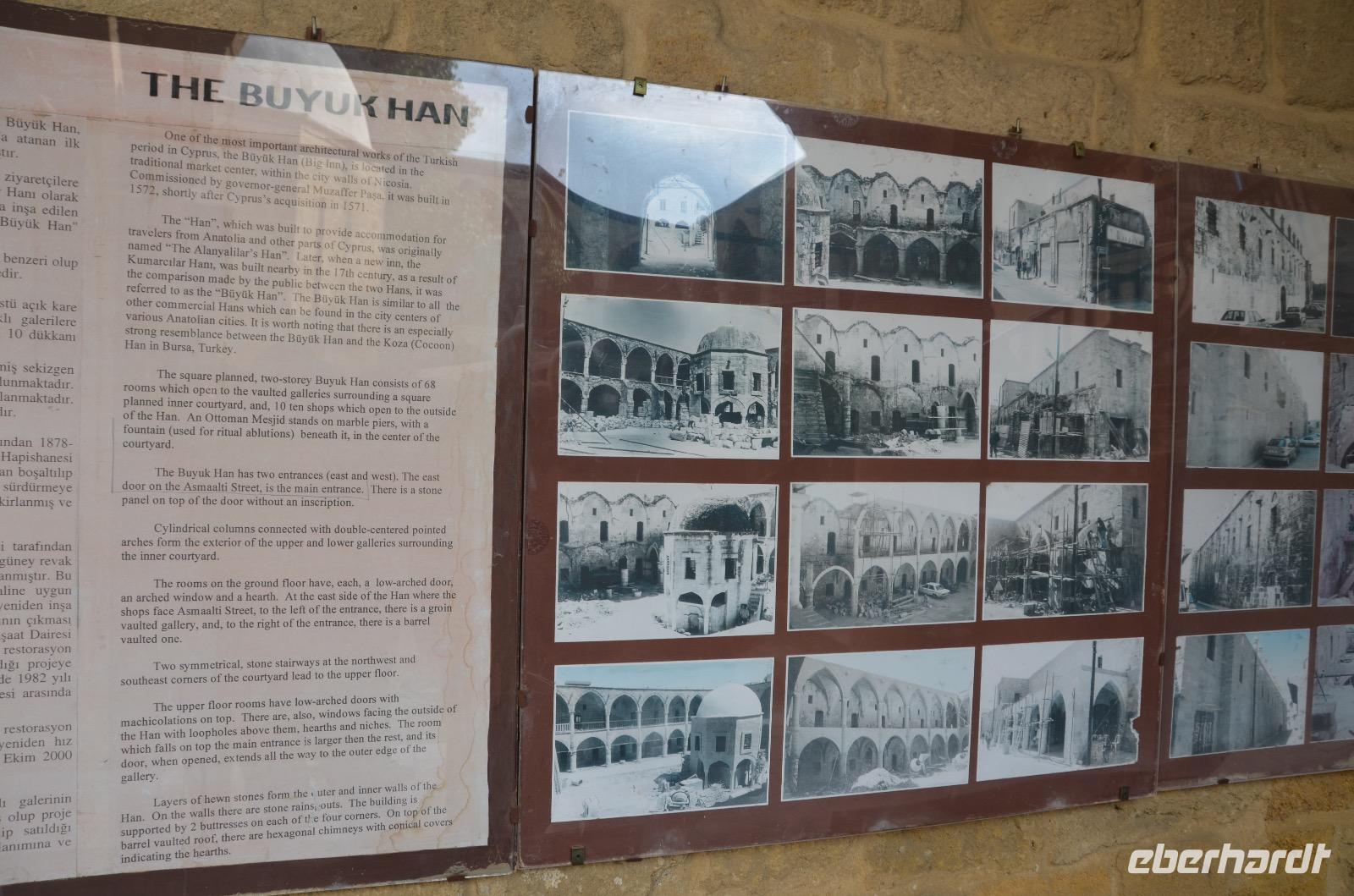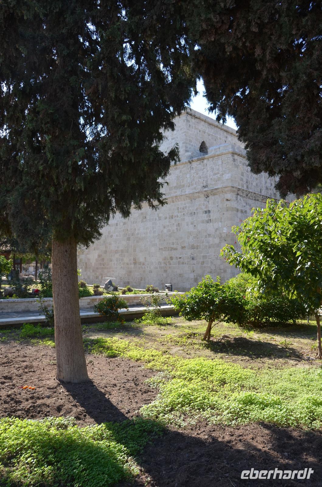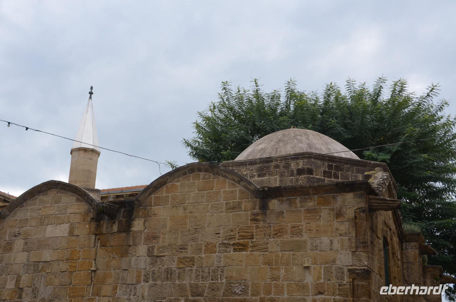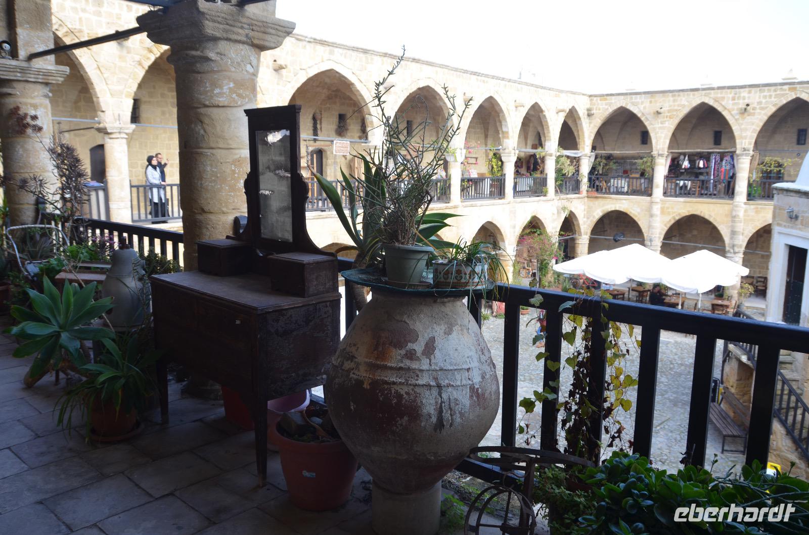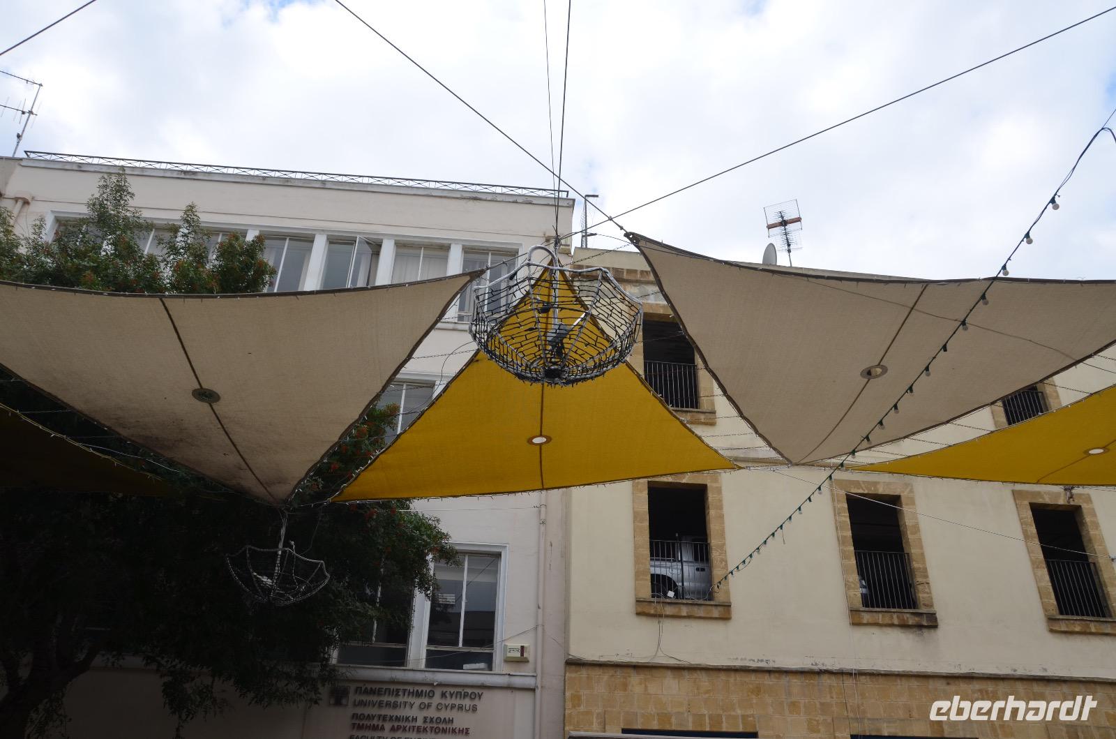 Bedächtigt starteten wir unseren Spaziergang durch Nikosia. Wir bummelten entlang der Ausgrabungen eines französischen Palastes aus dem 12. Jahrhundert, dem neuen Rathaus, welches ein Glasgestell über dem alten Gebäude darstellt und kommen schließlich zur ehemaligen Geschäftsstraße. Sehr verlassen und bedrückend wirken die Gassen. Nur noch ein paar alte Gewerke, wie Tischler haben sich hier niedergelassen. Immer näher kommen wir dem Grenzgebiet und einige fühlen sich an das ehemals geteilte Berlin erinnert. Mittlerweile ist Nikosia die letzte geteilte Hauptstadt Europas. Wir überquerten die Demarkationslinie und befanden uns schließlich im türkischen Teil der Stadt. Hier stieß Cecile zu uns dazu, die uns vorschriftsgemäß in Nordzypern begleiten musste. Auf der Einkaufsstraße entdeckten wir einen Kleidungsladen am nächsten. Das komplette Gegenteil von den grenznahen Straßen im Süden der Stadt. Am Ende der Fußgängerzone imponiert die ehemalige Sophienkathedrale. Wir ließen es uns natürlich nicht nehmen, das beeindruckende Bauwerk auch von innen zu besichtigen. Also zogen wir die Schuhe aus, um die jetzige Moschee zu betreten. Die gotische Kathedrale wurde von 1209 - 1326 erbaut. Als wir den Gebetsraum betraten fiel uns sofort die Einfachheit auf. Als Nikosia 1571 von den Osmanen besetzt wurde, ließen sie die Sophienkathedrale zu einer Moschee umbauen. Dabei wurden die bunten Glasfenster sowie alle Statuen entfernt. Der Fliesenboden wurde mit Teppichboden beklebt und somit zerstört. Die Musterlinie auf dem Stoffbelag weist einem die Richtung nach Mekka. Direkt neben der Moschee befindet sich der ehemalige Gemüsemarkt, der auch heute noch als Verkaufshalle dient. Wir schlenderten entlang der Geschäfte und waren beeindruckt von der Farbvielfalt der Obst- und Gemüsesorten. Von hier aus gingen wir weiter zur Karawanserei. Im Innenhof der ehemaligen Herberge, kamen wir zum ersten Mal in den Genuss von Antonis Schnaps und einer süßen Leckerei. Hier hatten wir Zeit, um ein paar Mitbringsel zu besorgen oder durch die angrenzenden Gassen zu spazieren.