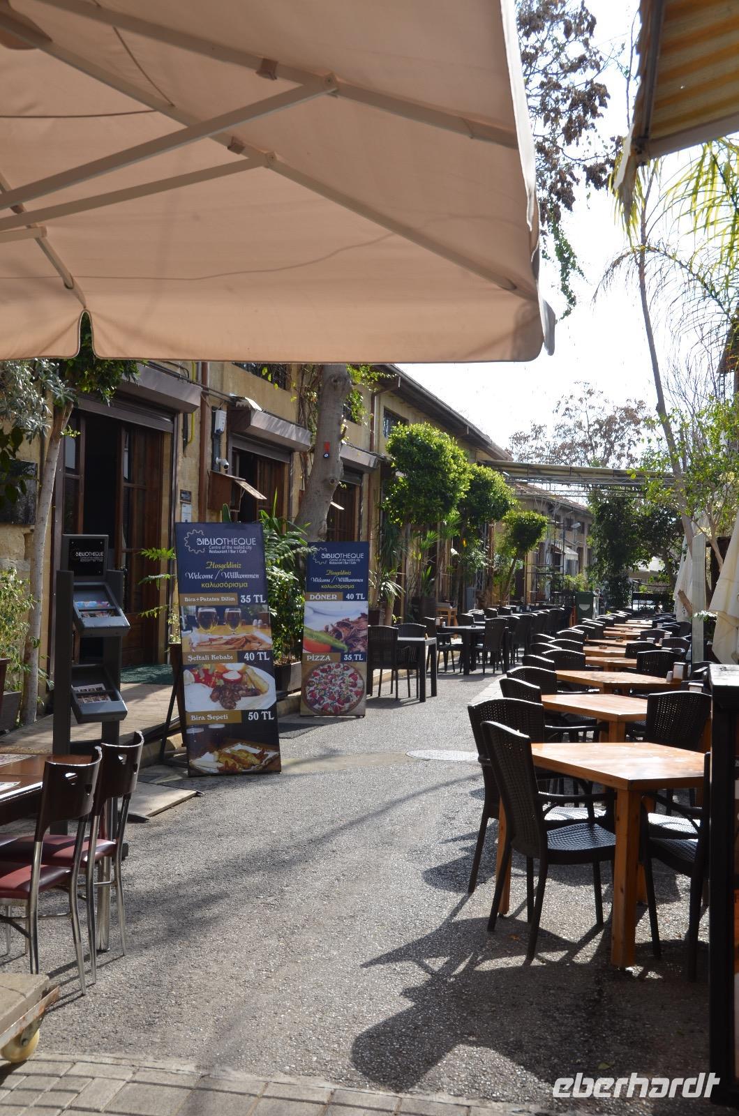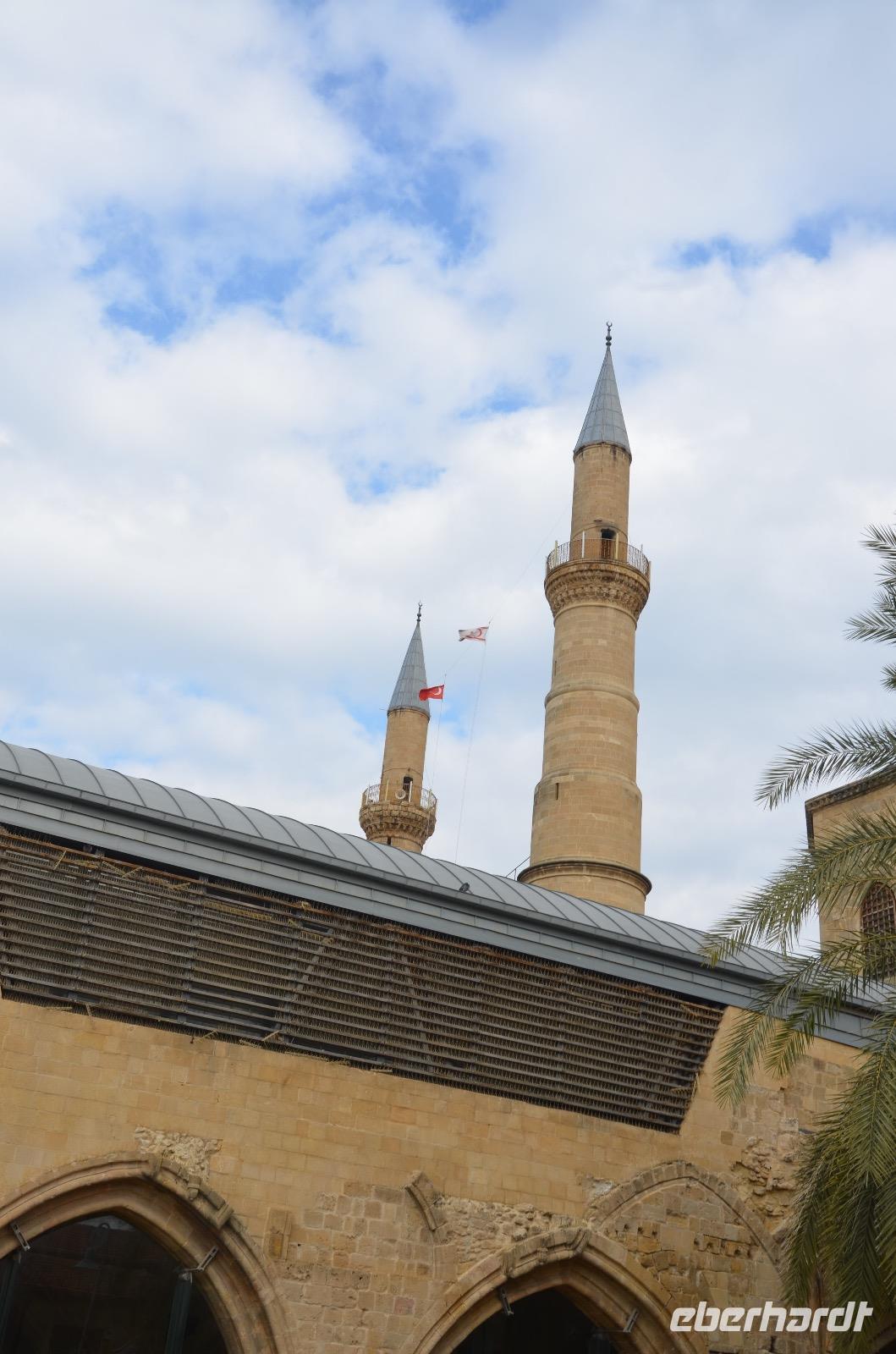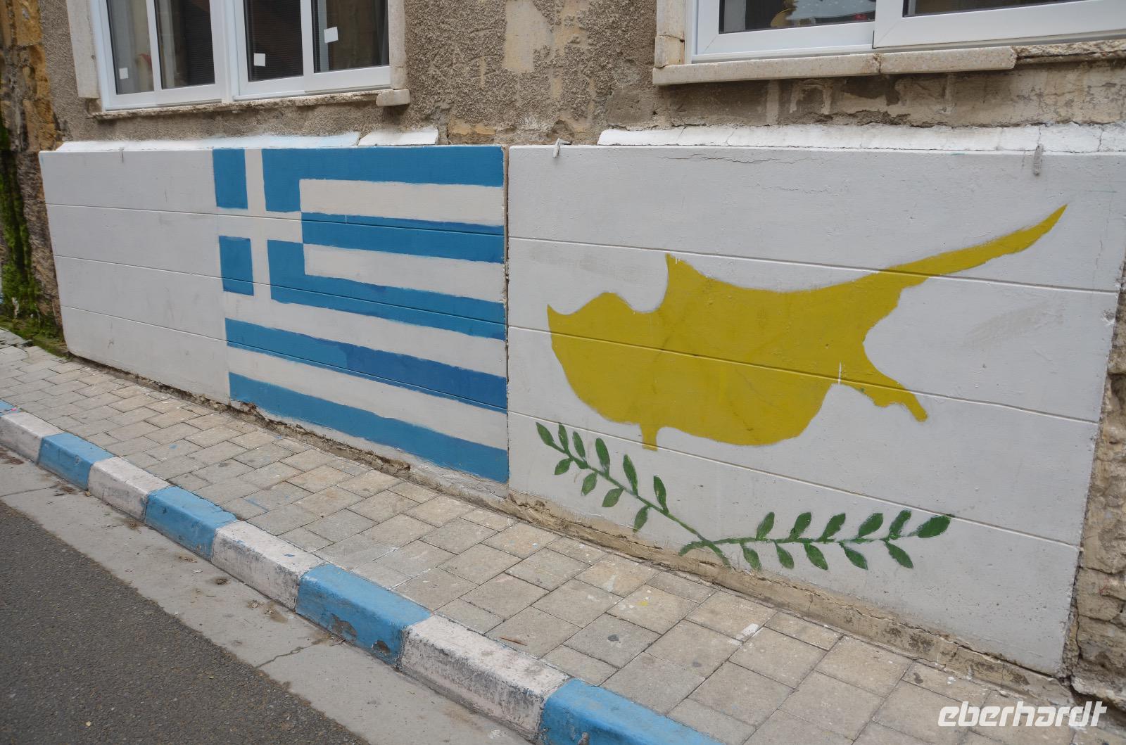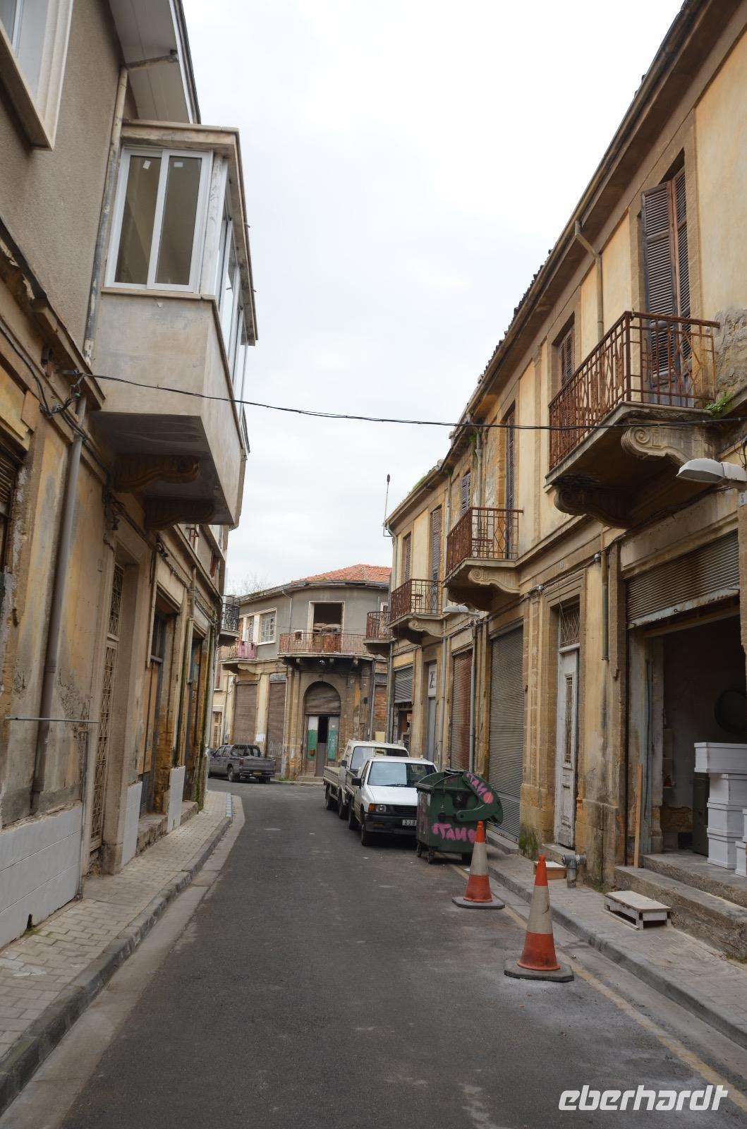 Bedächtigt starteten wir unseren Spaziergang durch Nikosia. Wir bummelten entlang der Ausgrabungen eines französischen Palastes aus dem 12. Jahrhundert, dem neuen Rathaus, welches ein Glasgestell über dem alten Gebäude darstellt und kommen schließlich zur ehemaligen Geschäftsstraße. Sehr verlassen und bedrückend wirken die Gassen. Nur noch ein paar alte Gewerke, wie Tischler haben sich hier niedergelassen. Immer näher kommen wir dem Grenzgebiet und einige fühlen sich an das ehemals geteilte Berlin erinnert. Mittlerweile ist Nikosia die letzte geteilte Hauptstadt Europas. Wir überquerten die Demarkationslinie und befanden uns schließlich im türkischen Teil der Stadt. Hier stieß Cecile zu uns dazu, die uns vorschriftsgemäß in Nordzypern begleiten musste. Auf der Einkaufsstraße entdeckten wir einen Kleidungsladen am nächsten. Das komplette Gegenteil von den grenznahen Straßen im Süden der Stadt. Am Ende der Fußgängerzone imponiert die ehemalige Sophienkathedrale. Wir ließen es uns natürlich nicht nehmen, das beeindruckende Bauwerk auch von innen zu besichtigen. Also zogen wir die Schuhe aus, um die jetzige Moschee zu betreten. Die gotische Kathedrale wurde von 1209 - 1326 erbaut. Als wir den Gebetsraum betraten fiel uns sofort die Einfachheit auf. Als Nikosia 1571 von den Osmanen besetzt wurde, ließen sie die Sophienkathedrale zu einer Moschee umbauen. Dabei wurden die bunten Glasfenster sowie alle Statuen entfernt. Der Fliesenboden wurde mit Teppichboden beklebt und somit zerstört. Die Musterlinie auf dem Stoffbelag weist einem die Richtung nach Mekka. Direkt neben der Moschee befindet sich der ehemalige Gemüsemarkt, der auch heute noch als Verkaufshalle dient. Wir schlenderten entlang der Geschäfte und waren beeindruckt von der Farbvielfalt der Obst- und Gemüsesorten. Von hier aus gingen wir weiter zur Karawanserei. Im Innenhof der ehemaligen Herberge, kamen wir zum ersten Mal in den Genuss von Antonis Schnaps und einer süßen Leckerei. Hier hatten wir Zeit, um ein paar Mitbringsel zu besorgen oder durch die angrenzenden Gassen zu spazieren.
