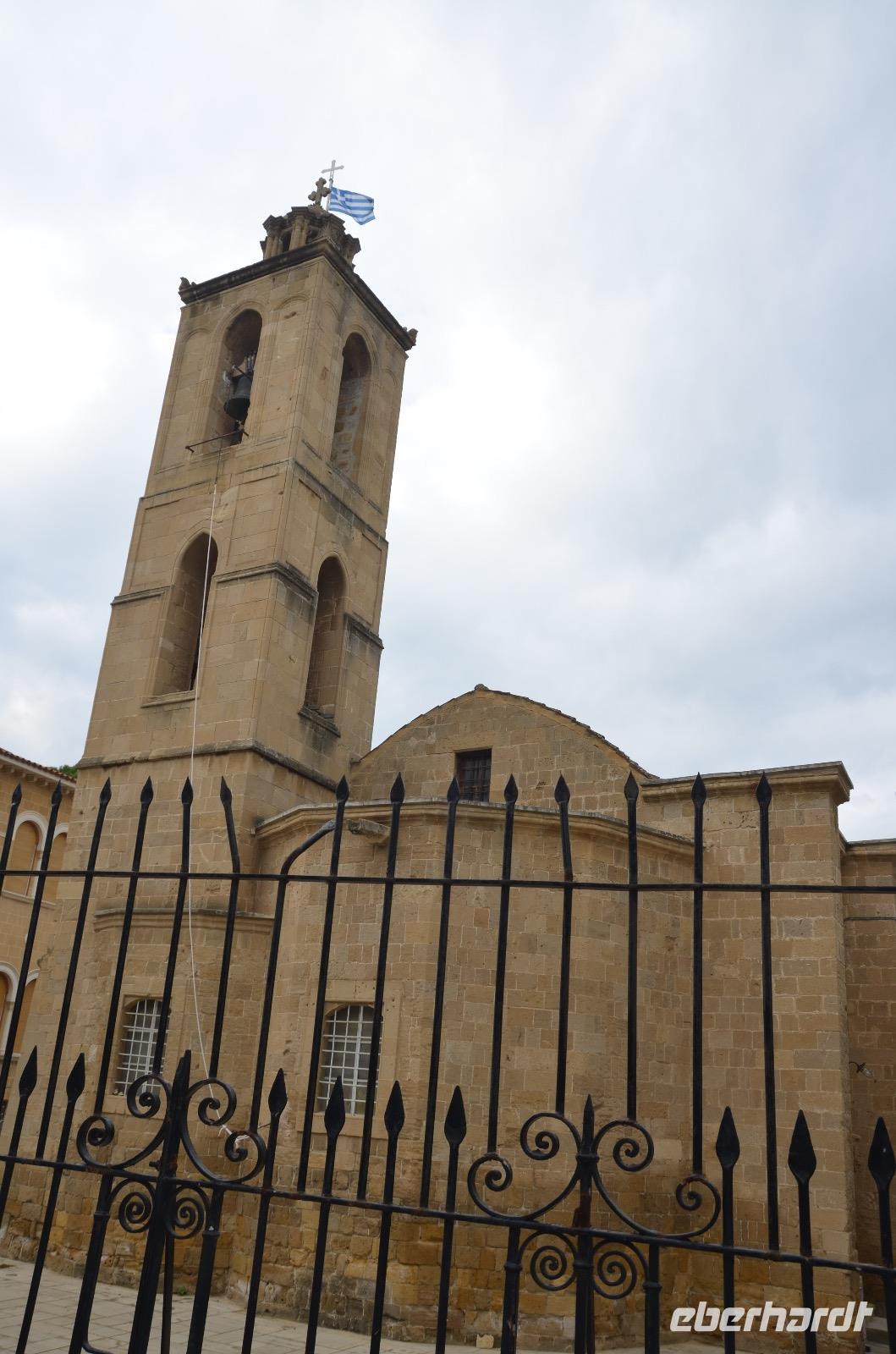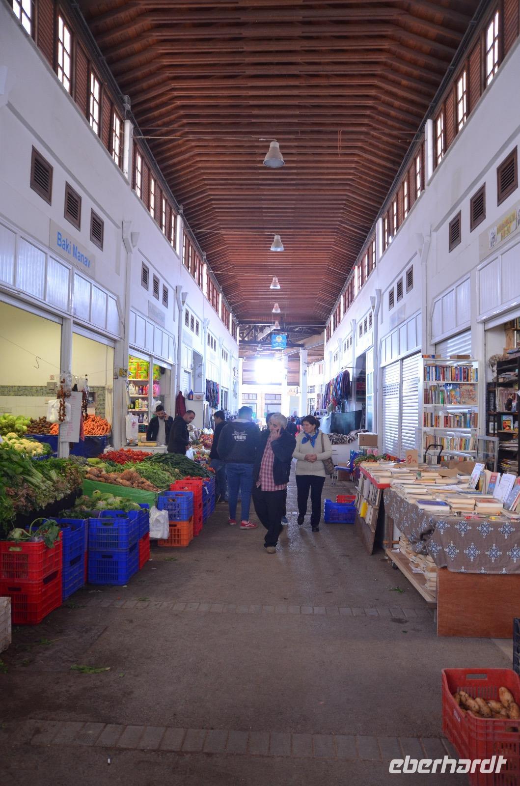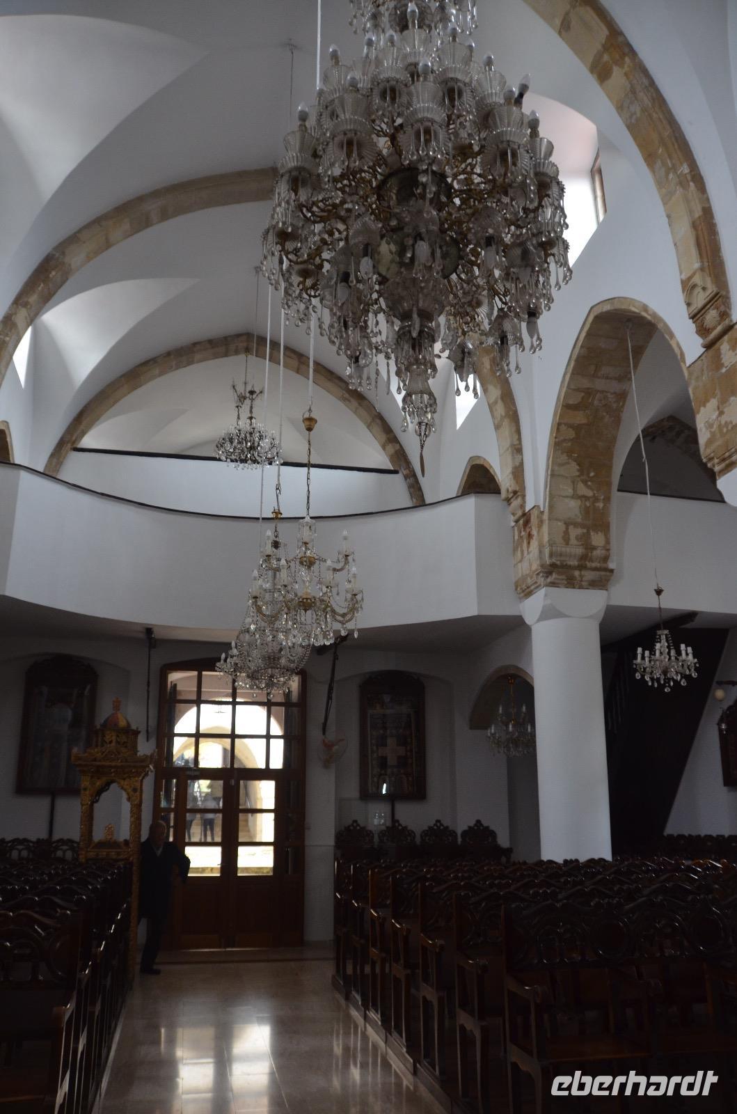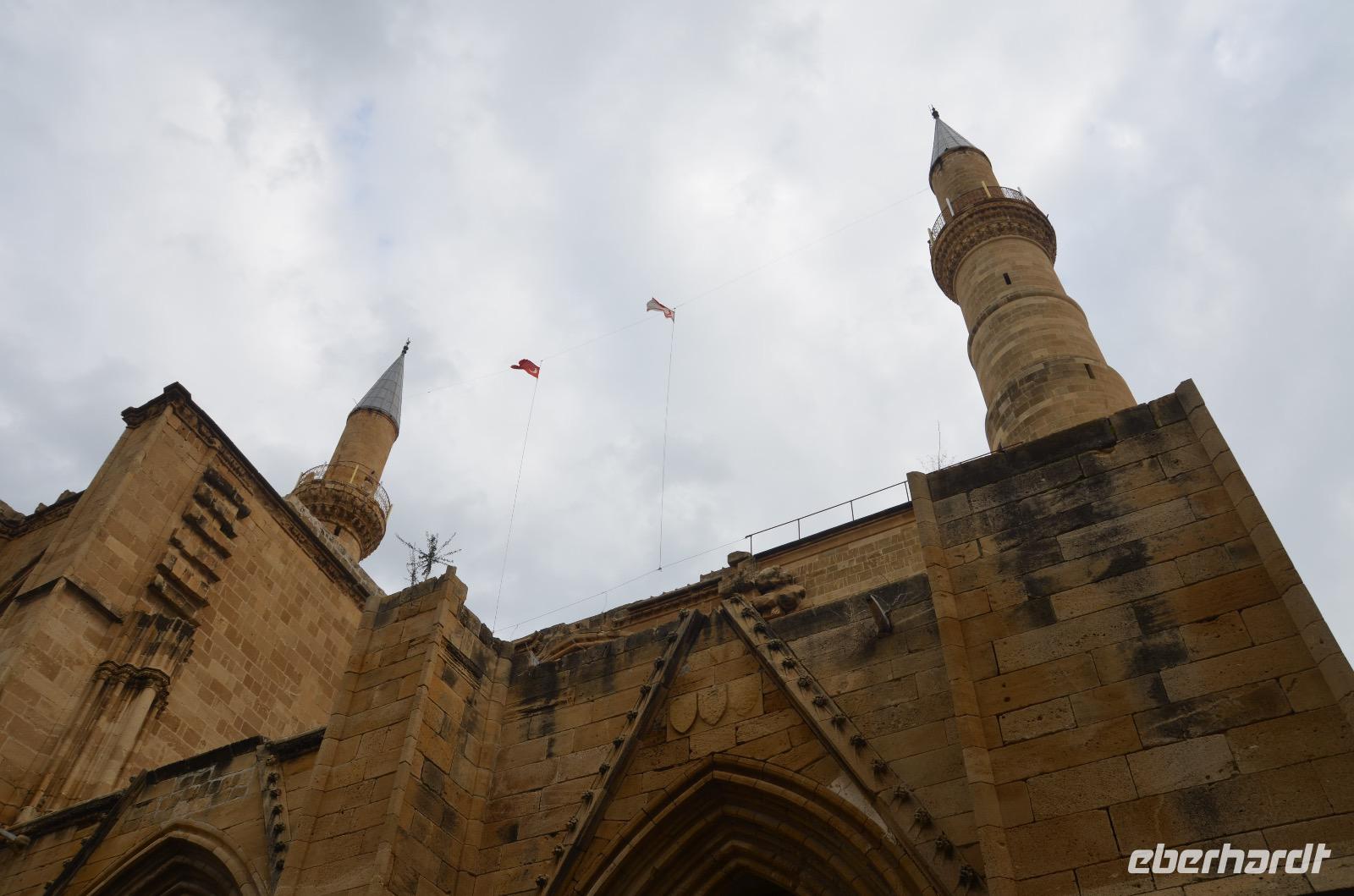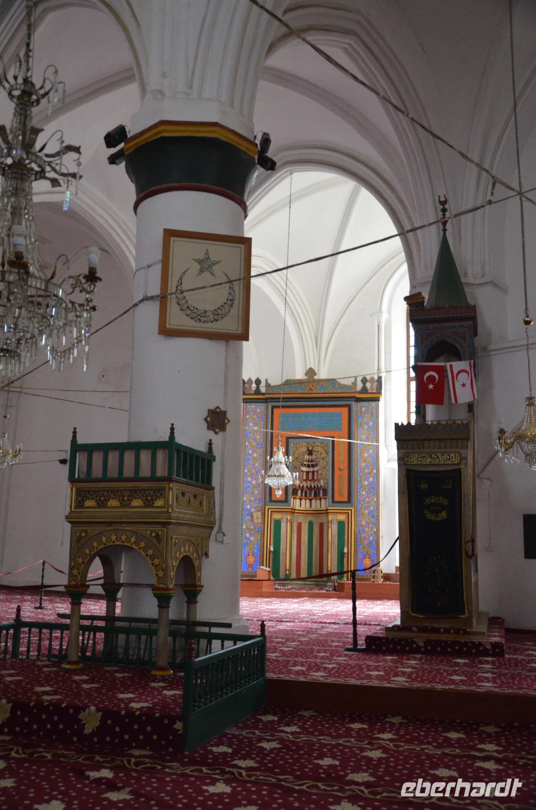 Bedächtigt starteten wir unseren Spaziergang durch Nikosia. Wir bummelten entlang der Ausgrabungen eines französischen Palastes aus dem 12. Jahrhundert, dem neuen Rathaus, welches ein Glasgestell über dem alten Gebäude darstellt und kommen schließlich zur ehemaligen Geschäftsstraße. Sehr verlassen und bedrückend wirken die Gassen. Nur noch ein paar alte Gewerke, wie Tischler haben sich hier niedergelassen. Immer näher kommen wir dem Grenzgebiet und einige fühlen sich an das ehemals geteilte Berlin erinnert. Mittlerweile ist Nikosia die letzte geteilte Hauptstadt Europas. Wir überquerten die Demarkationslinie und befanden uns schließlich im türkischen Teil der Stadt. Hier stieß Cecile zu uns dazu, die uns vorschriftsgemäß in Nordzypern begleiten musste. Auf der Einkaufsstraße entdeckten wir einen Kleidungsladen am nächsten. Das komplette Gegenteil von den grenznahen Straßen im Süden der Stadt. Am Ende der Fußgängerzone imponiert die ehemalige Sophienkathedrale. Wir ließen es uns natürlich nicht nehmen, das beeindruckende Bauwerk auch von innen zu besichtigen. Also zogen wir die Schuhe aus, um die jetzige Moschee zu betreten. Die gotische Kathedrale wurde von 1209 - 1326 erbaut. Als wir den Gebetsraum betraten fiel uns sofort die Einfachheit auf. Als Nikosia 1571 von den Osmanen besetzt wurde, ließen sie die Sophienkathedrale zu einer Moschee umbauen. Dabei wurden die bunten Glasfenster sowie alle Statuen entfernt. Der Fliesenboden wurde mit Teppichboden beklebt und somit zerstört. Die Musterlinie auf dem Stoffbelag weist einem die Richtung nach Mekka. Direkt neben der Moschee befindet sich der ehemalige Gemüsemarkt, der auch heute noch als Verkaufshalle dient. Wir schlenderten entlang der Geschäfte und waren beeindruckt von der Farbvielfalt der Obst- und Gemüsesorten. Von hier aus gingen wir weiter zur Karawanserei. Im Innenhof der ehemaligen Herberge, kamen wir zum ersten Mal in den Genuss von Antonis Schnaps und einer süßen Leckerei. Hier hatten wir Zeit, um ein paar Mitbringsel zu besorgen oder durch die angrenzenden Gassen zu spazieren.