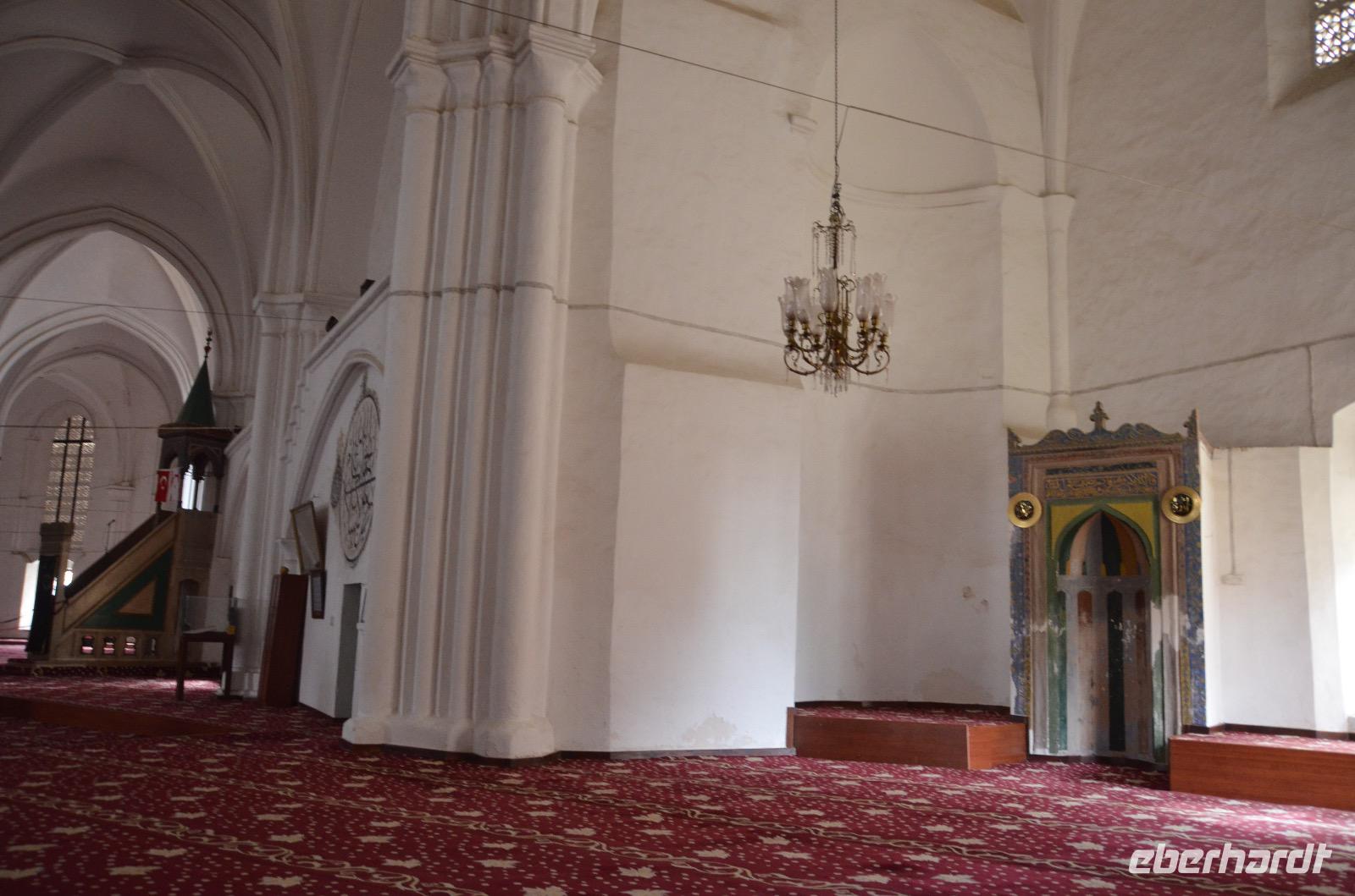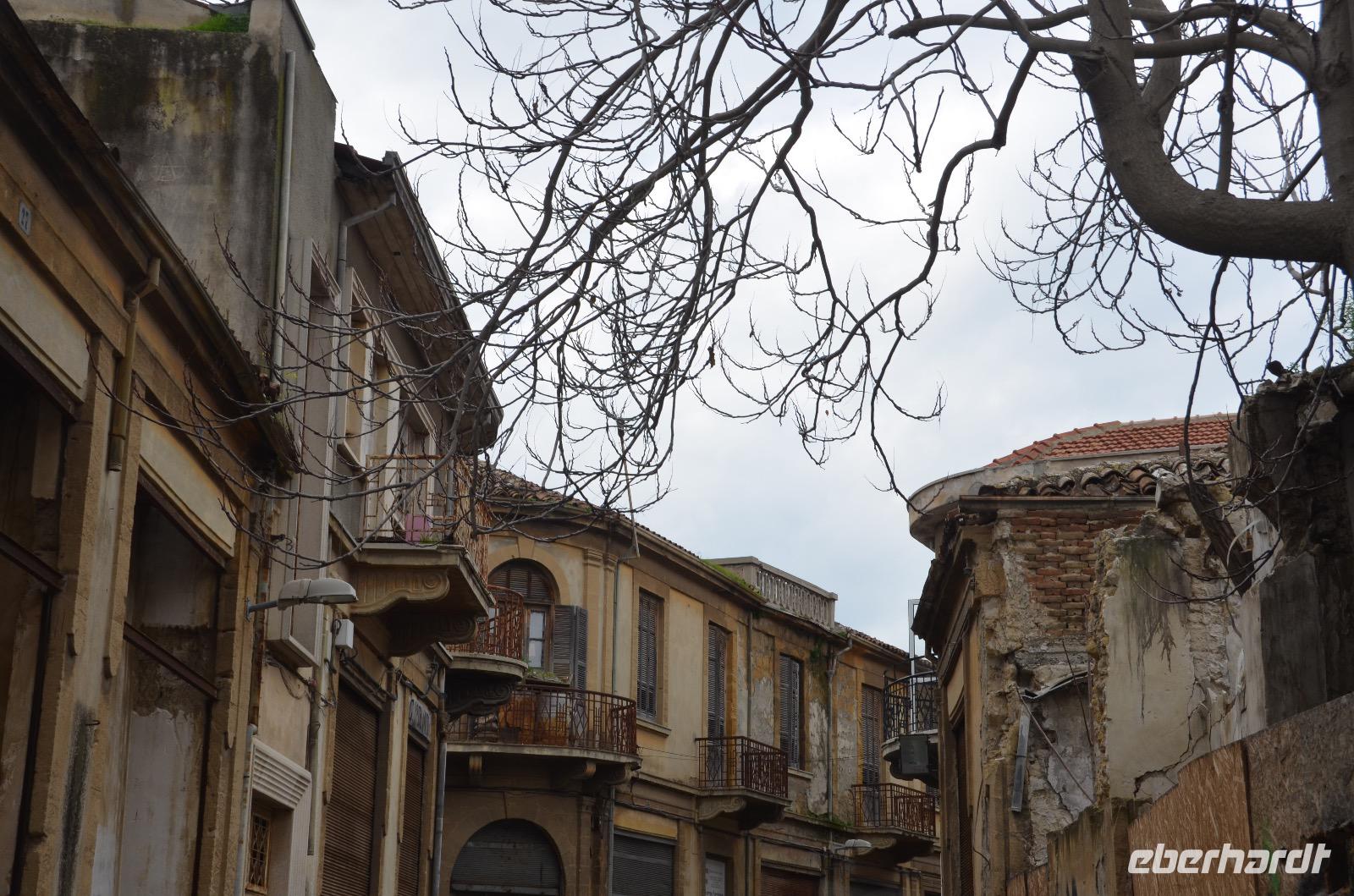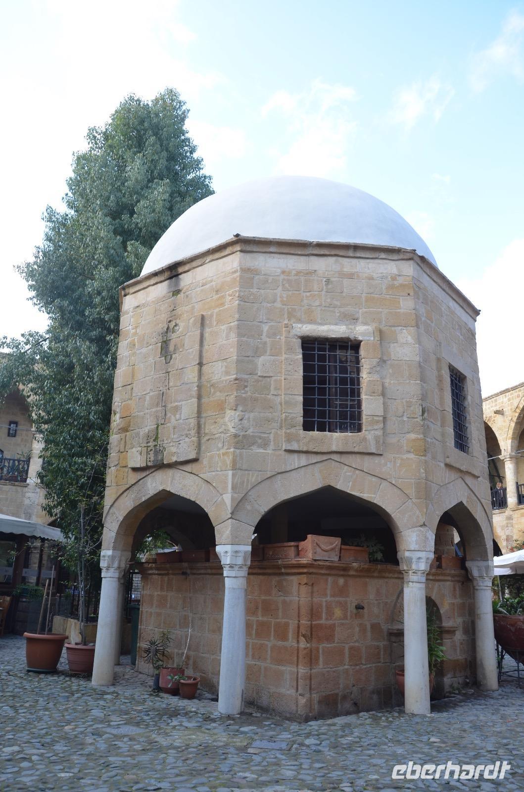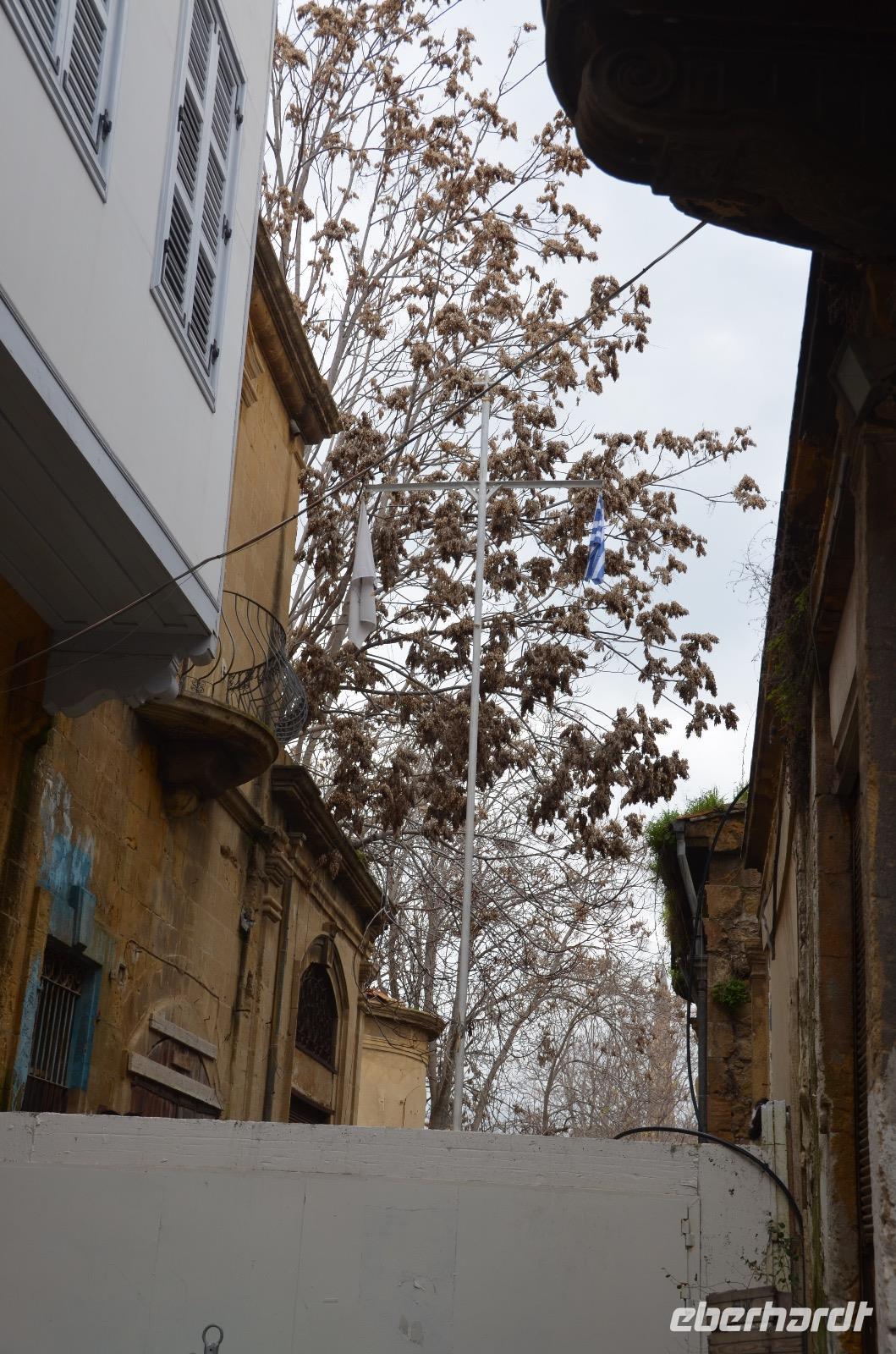 Bedächtigt starteten wir unseren Spaziergang durch Nikosia. Wir bummelten entlang der Ausgrabungen eines französischen Palastes aus dem 12. Jahrhundert, dem neuen Rathaus, welches ein Glasgestell über dem alten Gebäude darstellt und kommen schließlich zur ehemaligen Geschäftsstraße. Sehr verlassen und bedrückend wirken die Gassen. Nur noch ein paar alte Gewerke, wie Tischler haben sich hier niedergelassen. Immer näher kommen wir dem Grenzgebiet und einige fühlen sich an das ehemals geteilte Berlin erinnert. Mittlerweile ist Nikosia die letzte geteilte Hauptstadt Europas. Wir überquerten die Demarkationslinie und befanden uns schließlich im türkischen Teil der Stadt. Hier stieß Cecile zu uns dazu, die uns vorschriftsgemäß in Nordzypern begleiten musste. Auf der Einkaufsstraße entdeckten wir einen Kleidungsladen am nächsten. Das komplette Gegenteil von den grenznahen Straßen im Süden der Stadt. Am Ende der Fußgängerzone imponiert die ehemalige Sophienkathedrale. Wir ließen es uns natürlich nicht nehmen, das beeindruckende Bauwerk auch von innen zu besichtigen. Also zogen wir die Schuhe aus, um die jetzige Moschee zu betreten. Die gotische Kathedrale wurde von 1209 - 1326 erbaut. Als wir den Gebetsraum betraten fiel uns sofort die Einfachheit auf. Als Nikosia 1571 von den Osmanen besetzt wurde, ließen sie die Sophienkathedrale zu einer Moschee umbauen. Dabei wurden die bunten Glasfenster sowie alle Statuen entfernt. Der Fliesenboden wurde mit Teppichboden beklebt und somit zerstört. Die Musterlinie auf dem Stoffbelag weist einem die Richtung nach Mekka. Direkt neben der Moschee befindet sich der ehemalige Gemüsemarkt, der auch heute noch als Verkaufshalle dient. Wir schlenderten entlang der Geschäfte und waren beeindruckt von der Farbvielfalt der Obst- und Gemüsesorten. Von hier aus gingen wir weiter zur Karawanserei. Im Innenhof der ehemaligen Herberge, kamen wir zum ersten Mal in den Genuss von Antonis Schnaps und einer süßen Leckerei. Hier hatten wir Zeit, um ein paar Mitbringsel zu besorgen oder durch die angrenzenden Gassen zu spazieren.