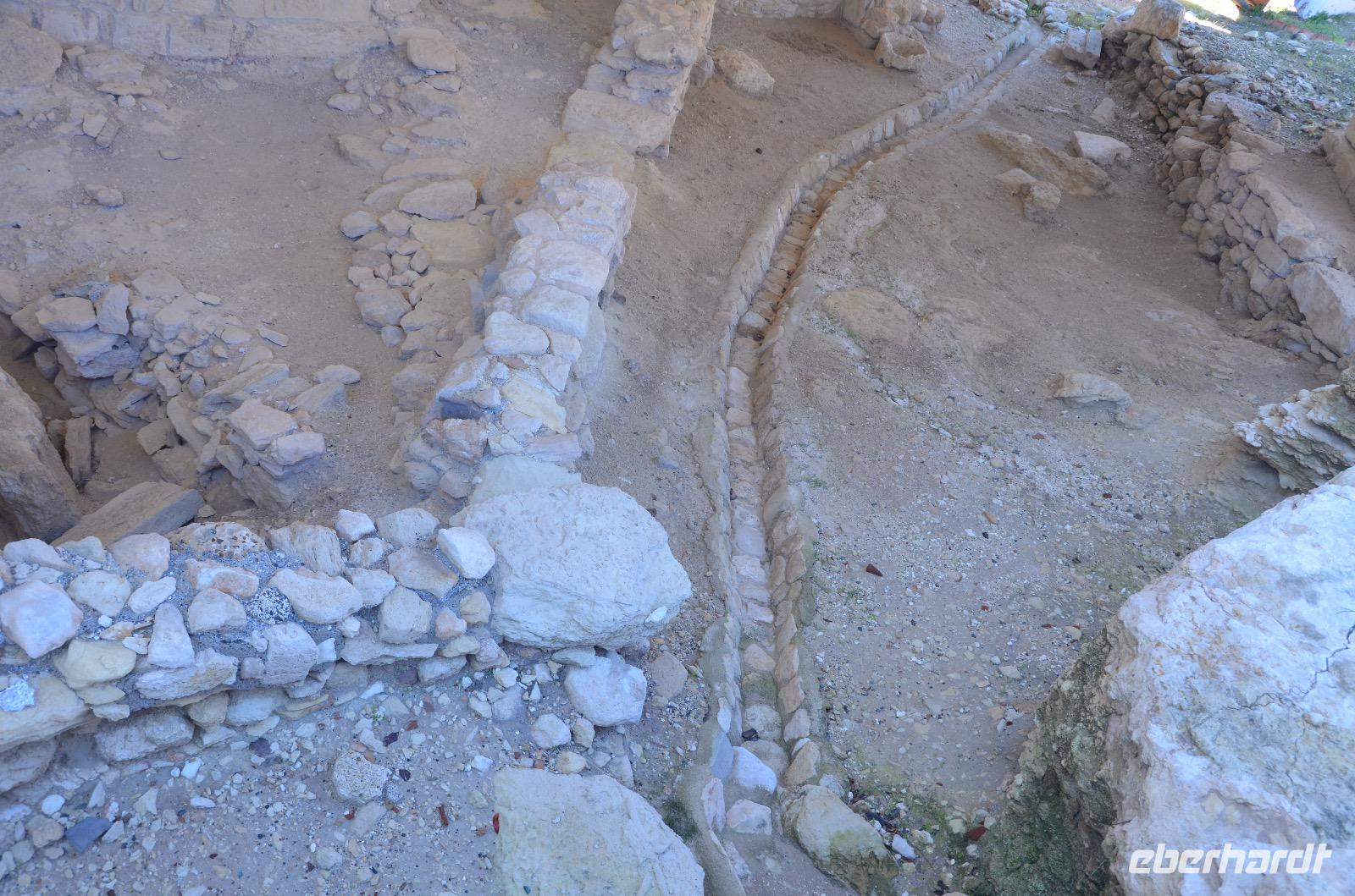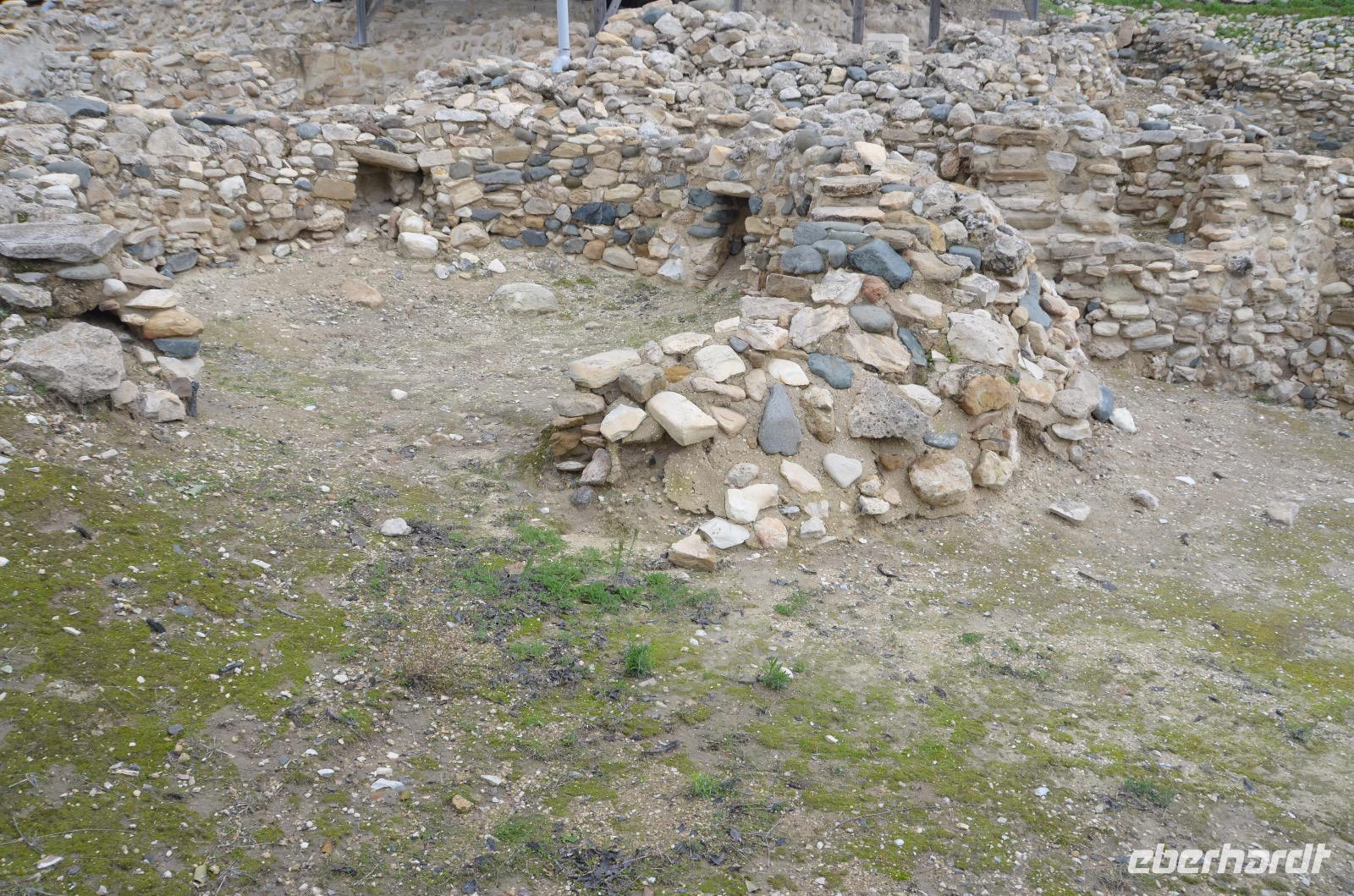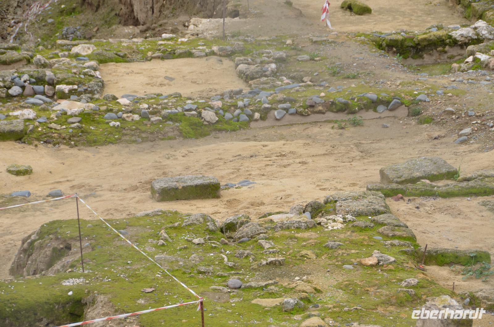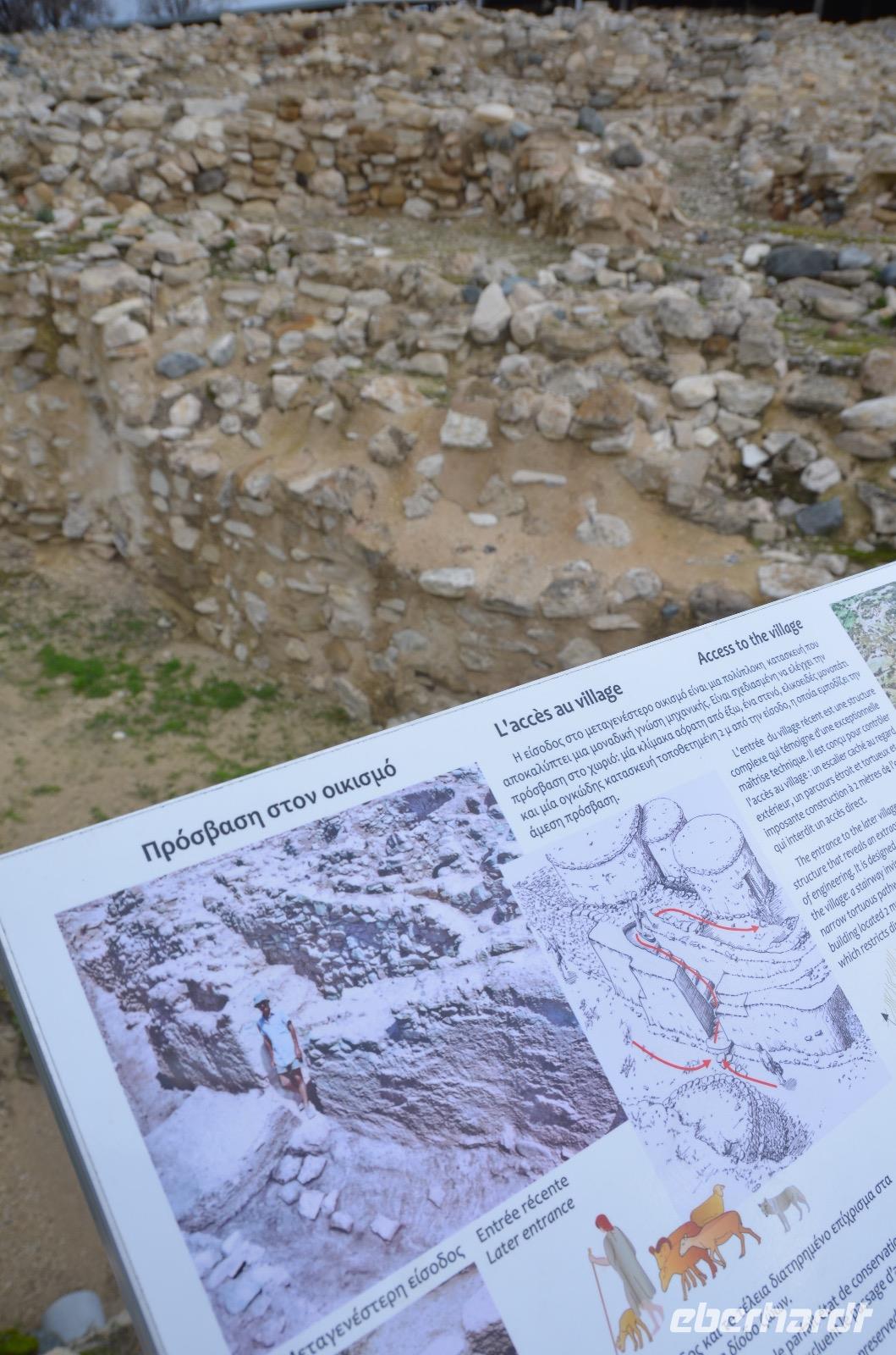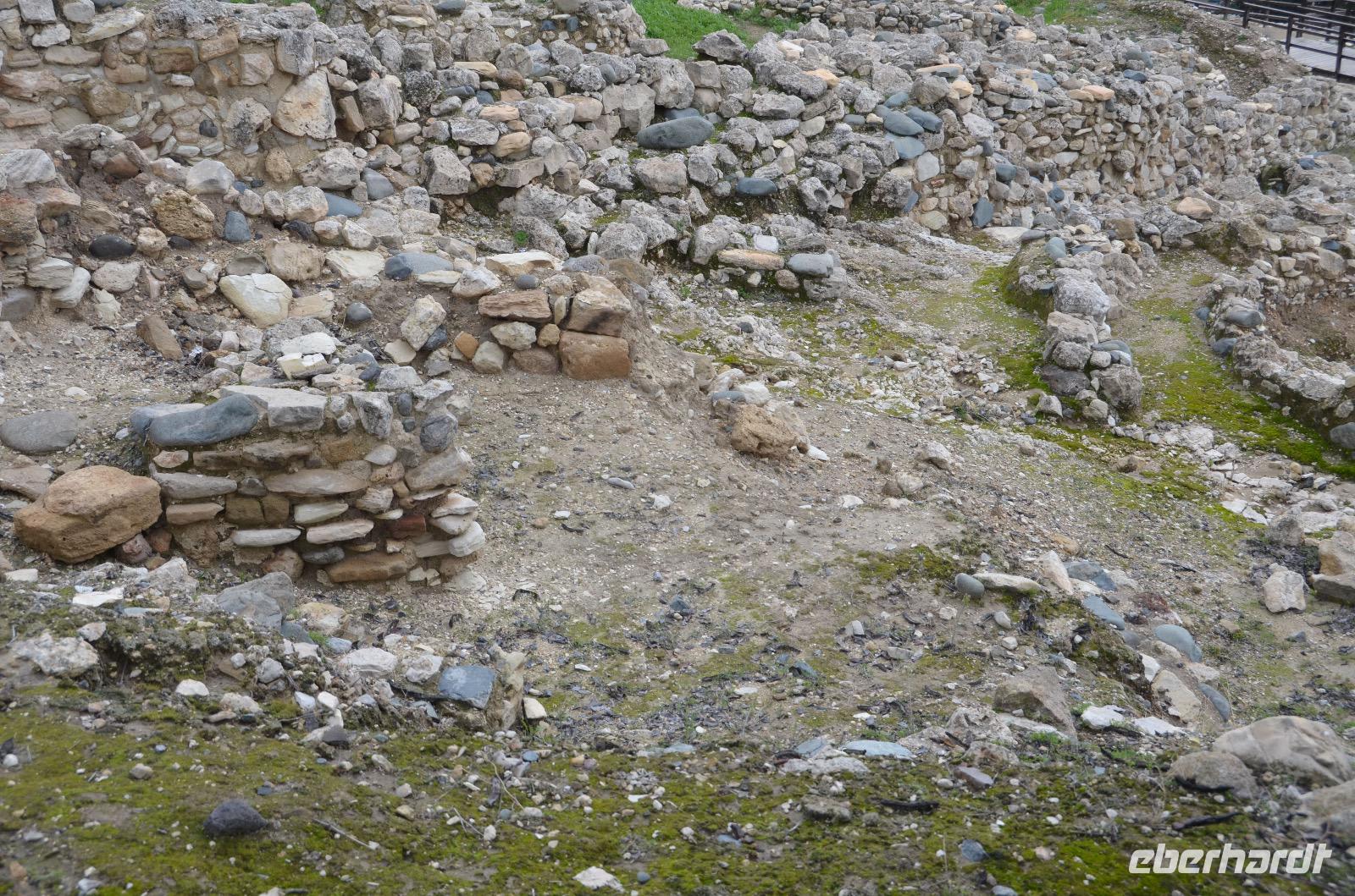 Um das Dorf herum war eine Mauer errichtet. Man vermutet, dass die Siedler aus dem Osten, entlang des ehemaligen Flusses durch den Wald kamen. Sie entschieden sich aus drei Gründen für diesen Standort: Wasser, Platz für die Landwirtschaft und eine gute Sicht zur Verteidigung und zum Schutz. Anschließend stiegen wir die Treppen nach oben, um die Reste der originalen Siedlung zu bestaunen. Wir waren überrascht von der Größe der Siedlung und den Kenntnissen bzw. dem Können der Menschen zu dieser Zeit.