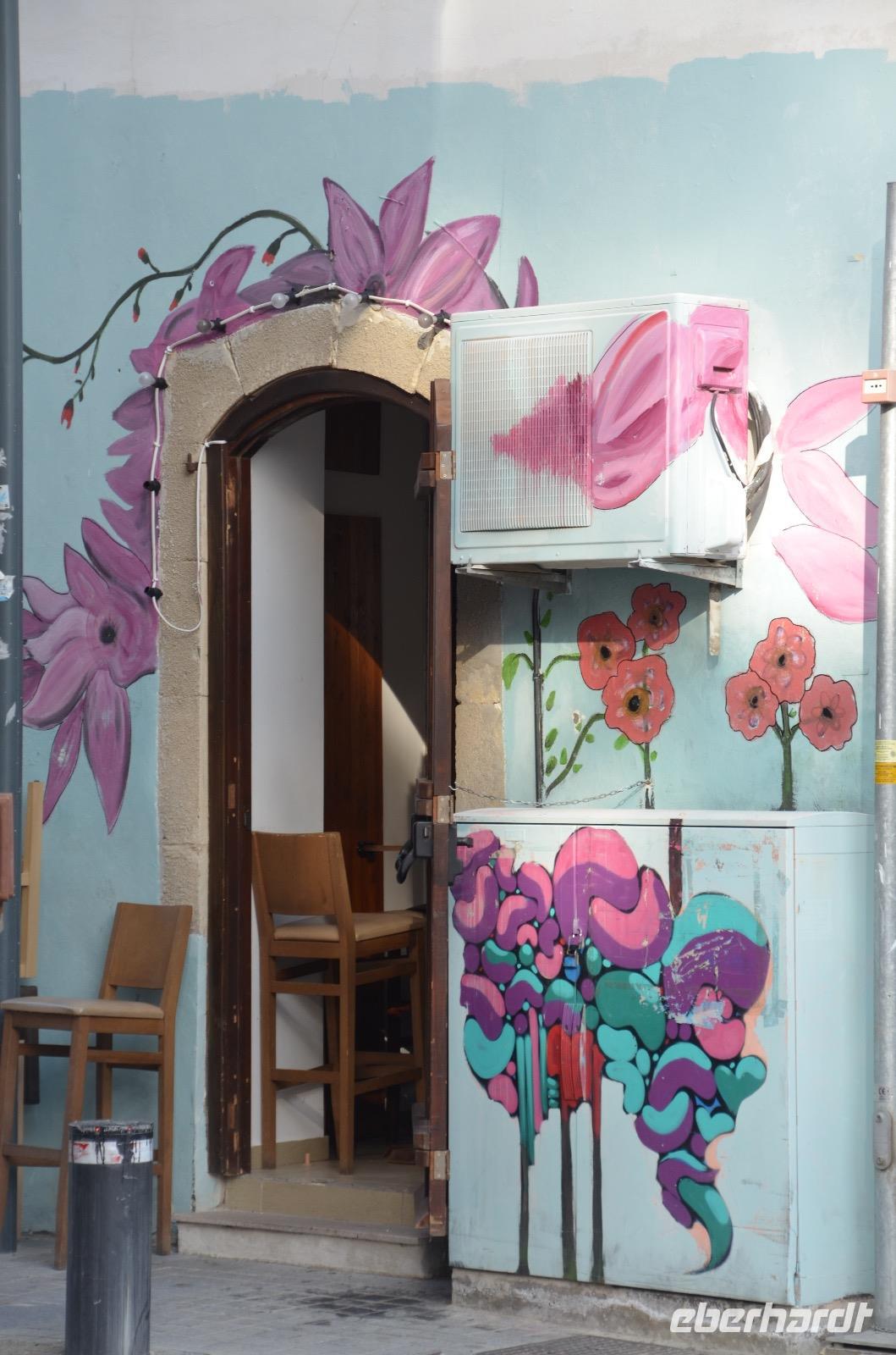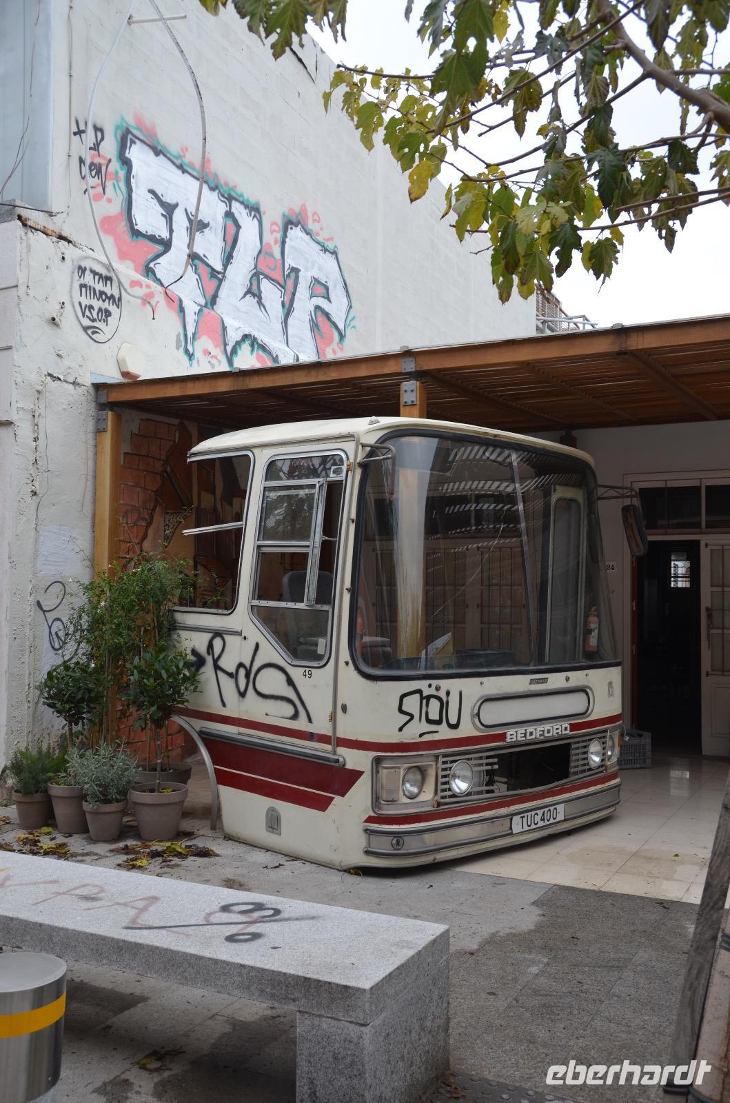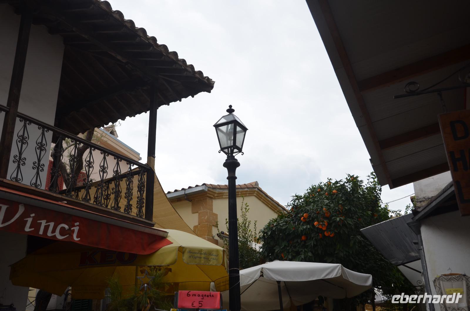 Anschließend kehrten wir in den südlichen Teil der Hauptstadt zurück und entschieden uns für ein kleines, zypriotisches Restaurant in einer Nebenstraße. Die meisten aßen eines der griechischen Tagesgerichte, wie Moussaka, gefüllte Weinblätter, Schweine- oder Rinderfleisch. Natürlich gab es zum Nachtisch einen Schnaps oder Commandaria aufs Haus. Da es in der Zwischenzeit stark zu regnen begonnen hatte, holte Antonis auch die restlichen Gäste zu uns, die sich für einen Bummel durch die Stadt entschieden hatten. So tranken wir hier noch einen Kaffee und genossen das fröhliche Beisammensein, bei dem der Regen schnell vergessen war.