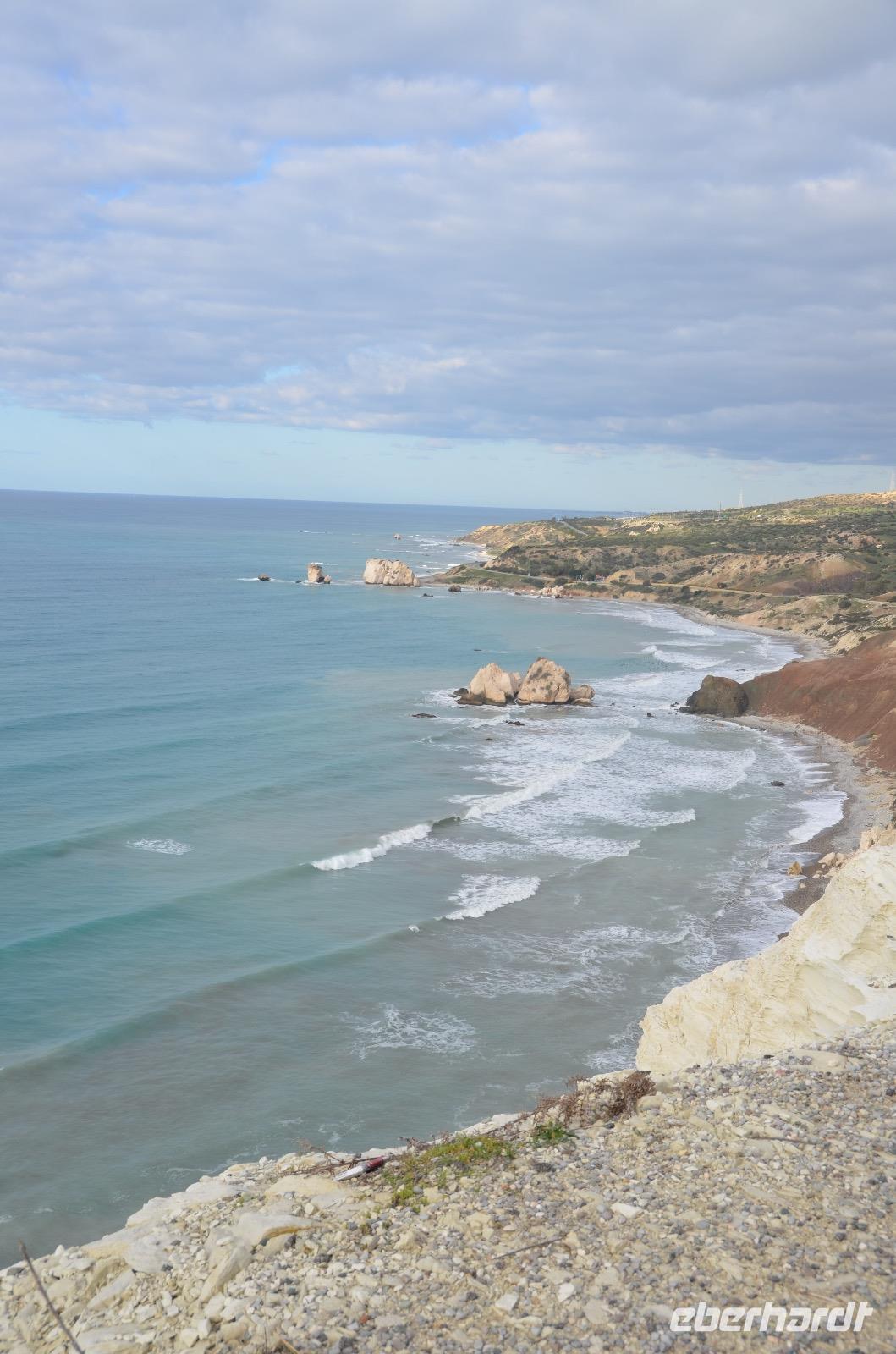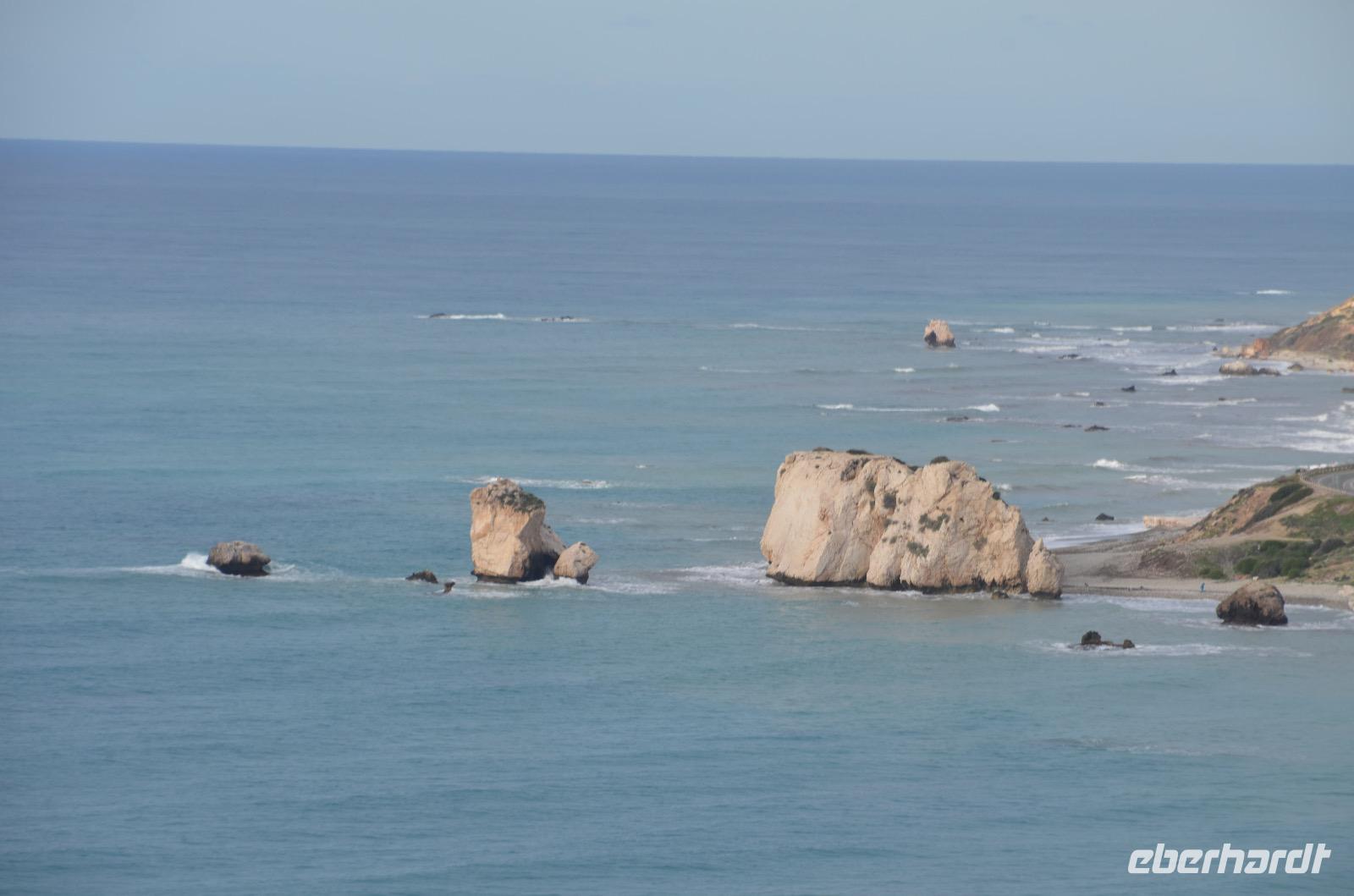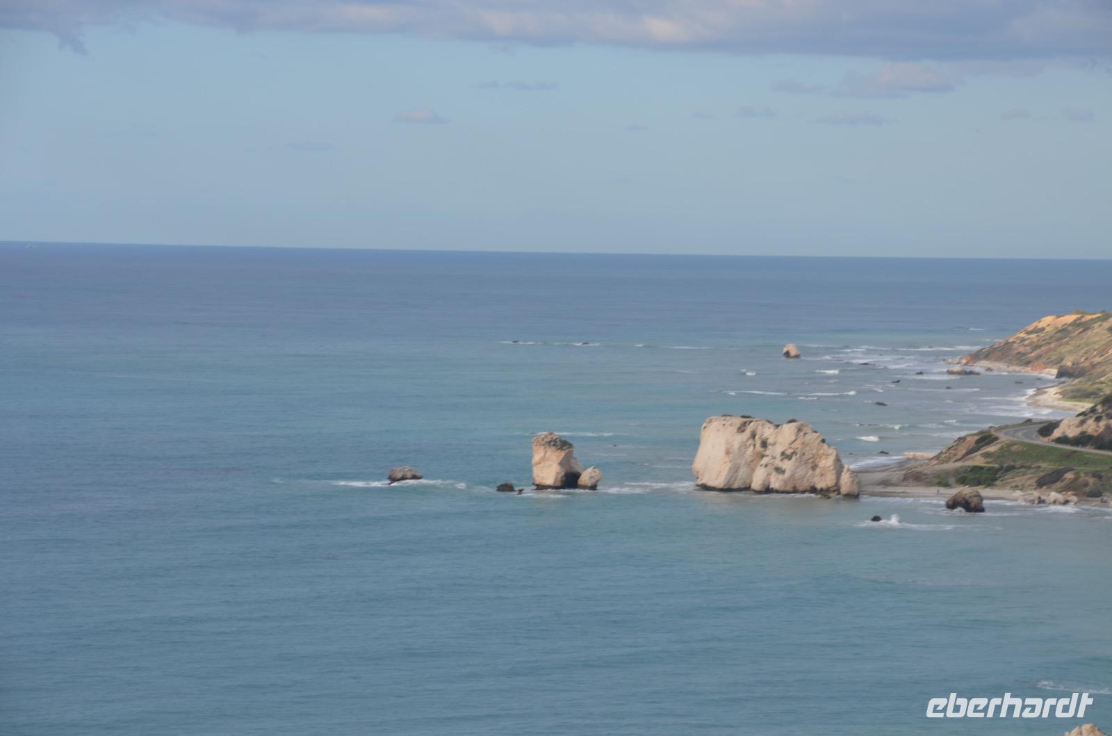 Unser erster Fotostopp heute war der Fels der Aphrodite. Bei strahlendem Sonnenschein hatten wir einen tollen Blick auf den Geburtsort der Göttin der Liebe, Fruchtbarkeit und Schönheit. Die Tochter des Uranus bekam den Namen der Schaumgeborenen, da sie genau an dieser Stelle 8000 v. Chr. aus dem Wasser empor gestiegen sein soll. Der Berühmte Stein stammt ursprünglich aus Afrika, da sich hier vor Zypern die afrikanische Platte immer weiter unter die Insel schiebt.