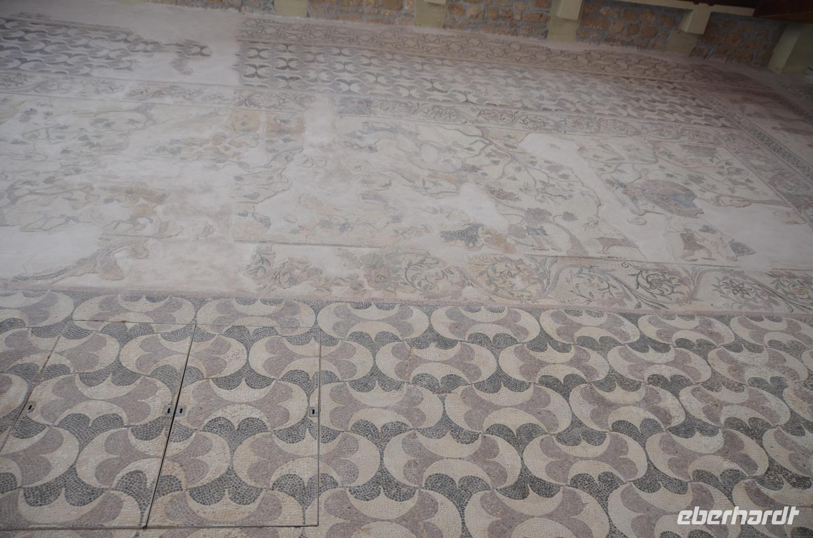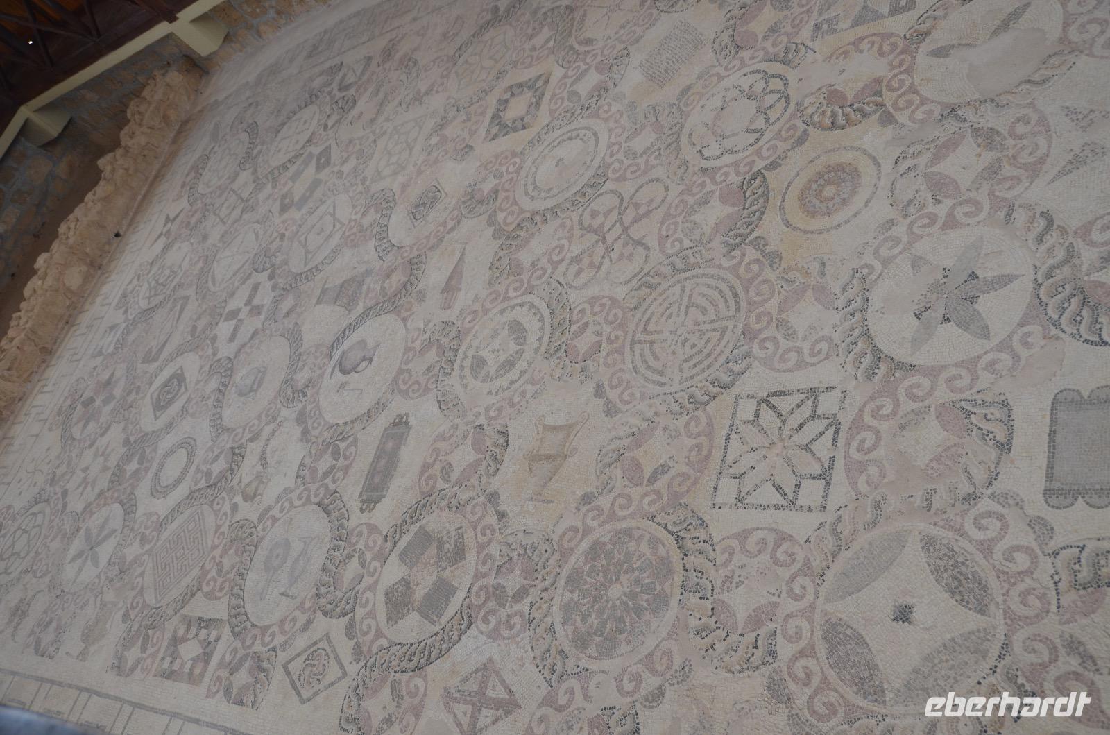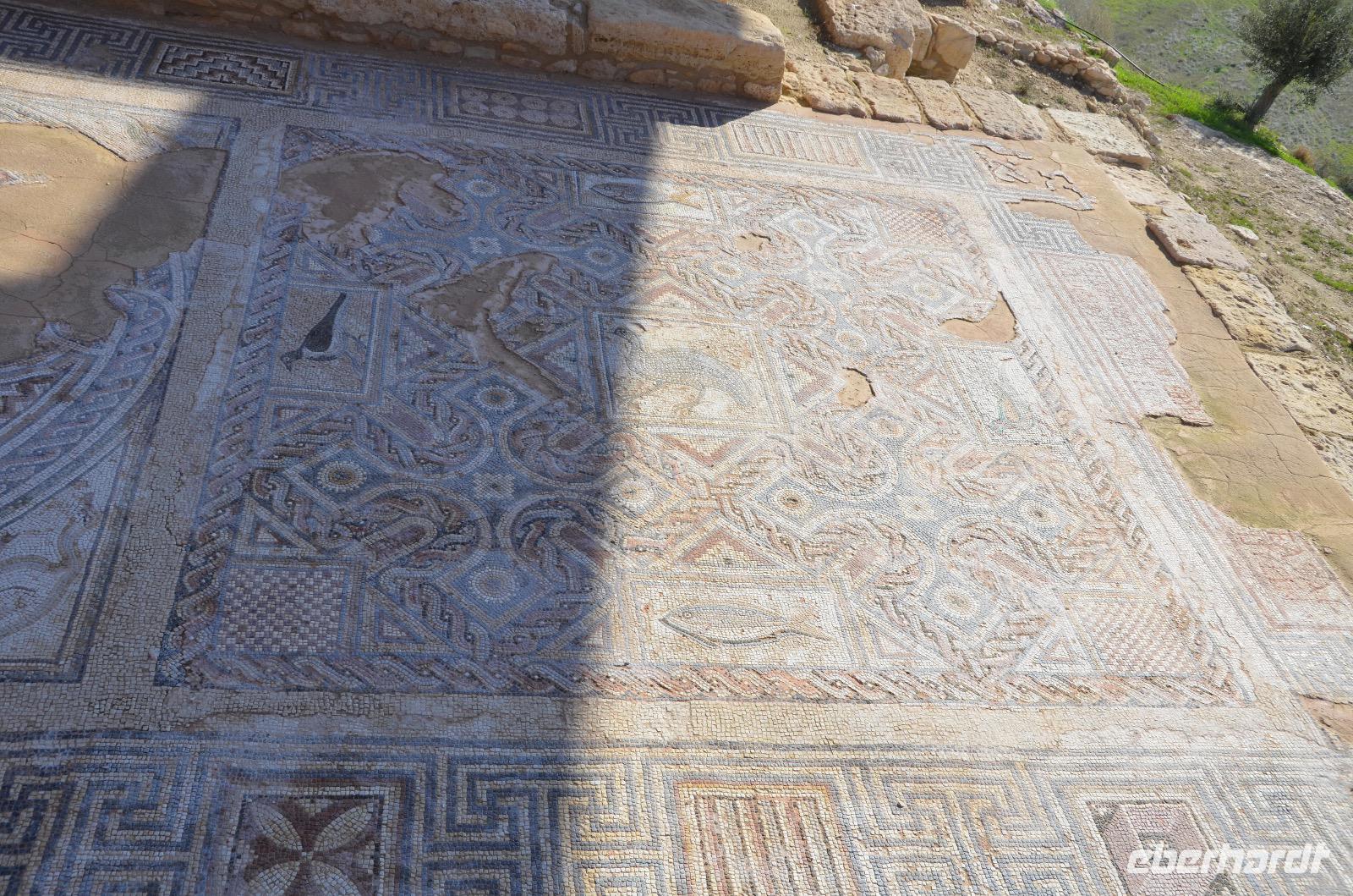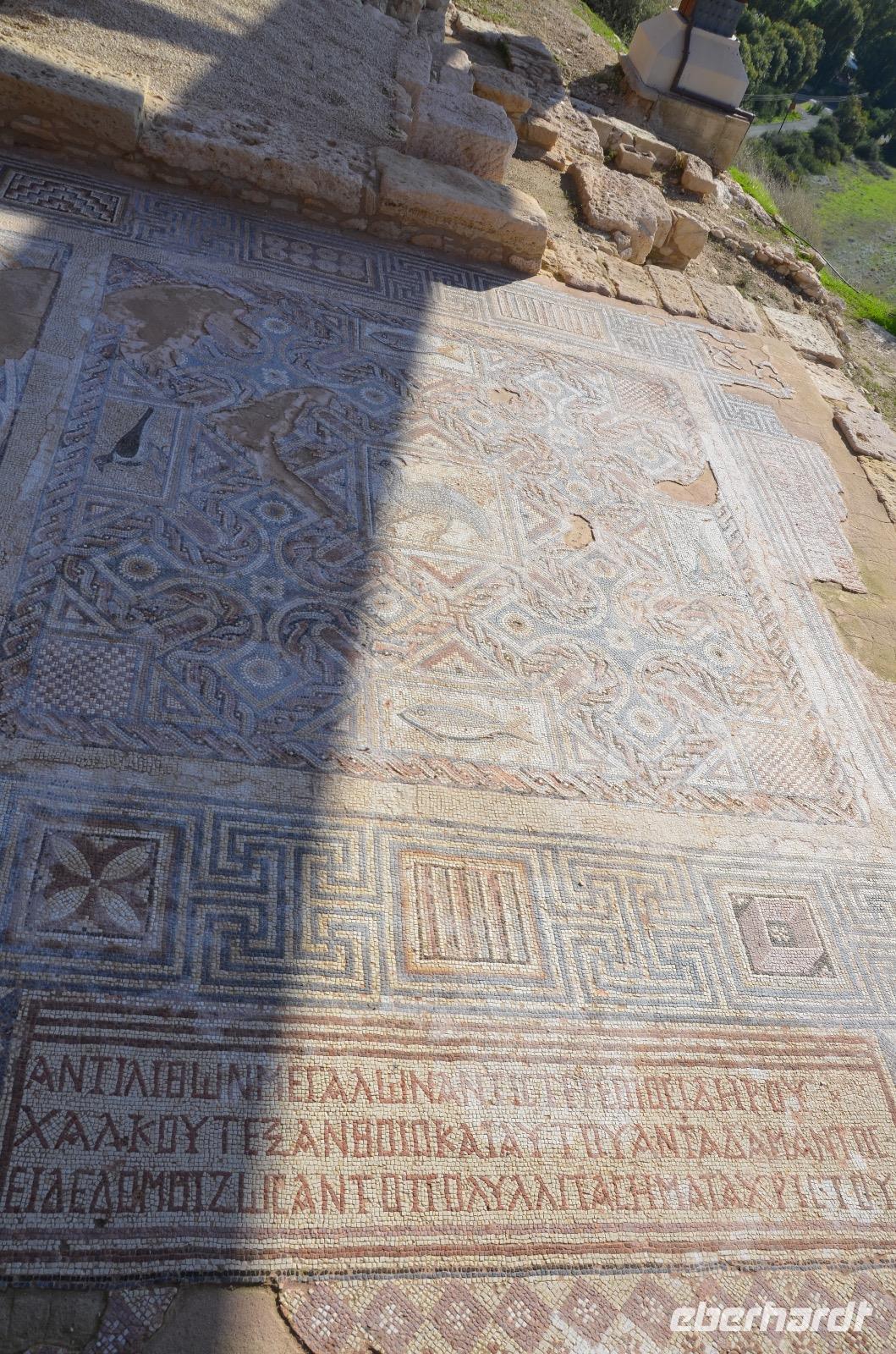 Zum Schluss schauten wir uns die Überreste einer riesigen Villa mit Badekomplex an. Einige der Bodenmosaike waren noch zu erkennen. Eines der Mosaike stammt aus dem 4. Jahrhundert nach Christus und man sagt, dass hier das erste Mal das Wort Christus schriftlich festgehalten wurde.
