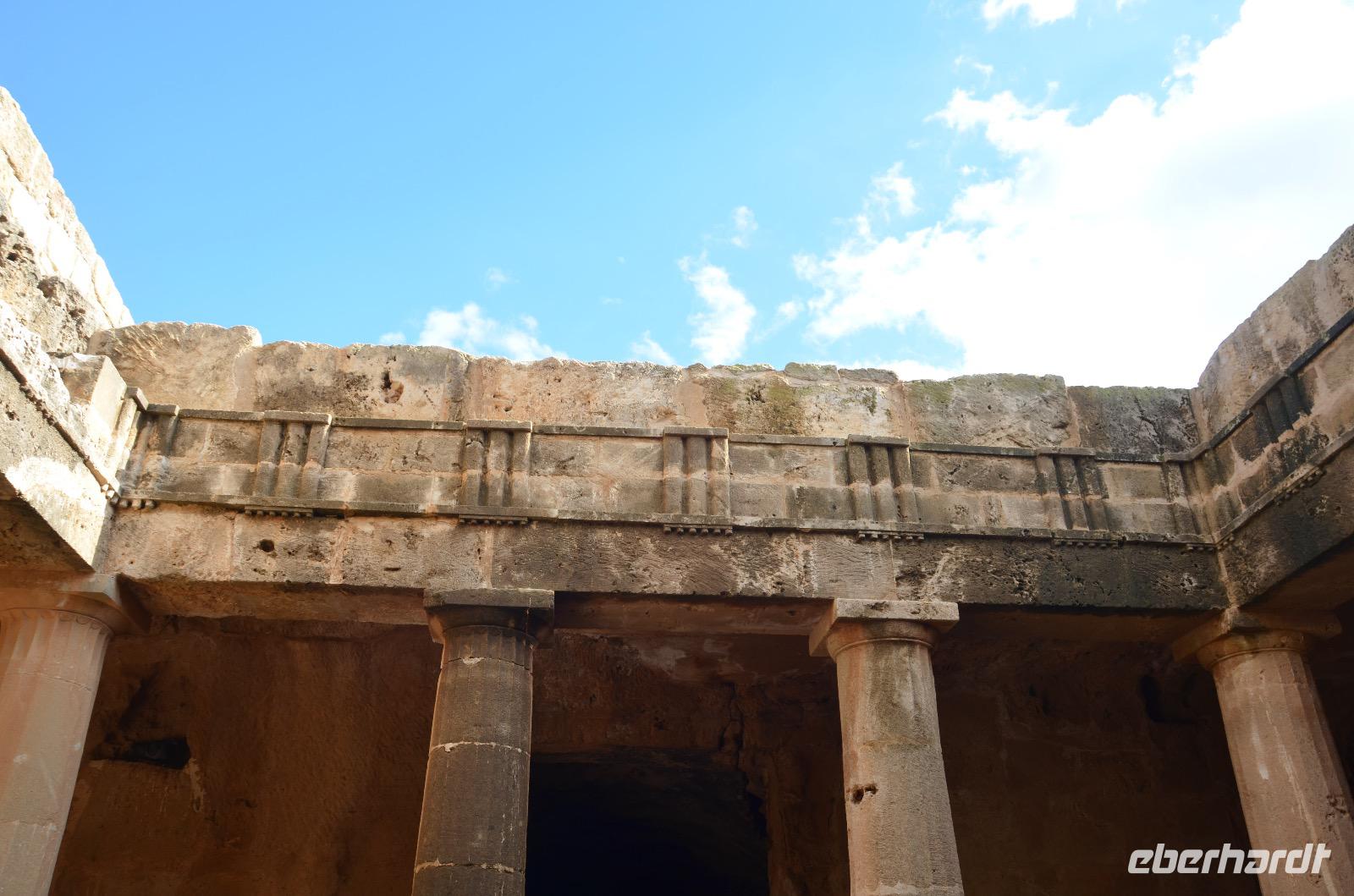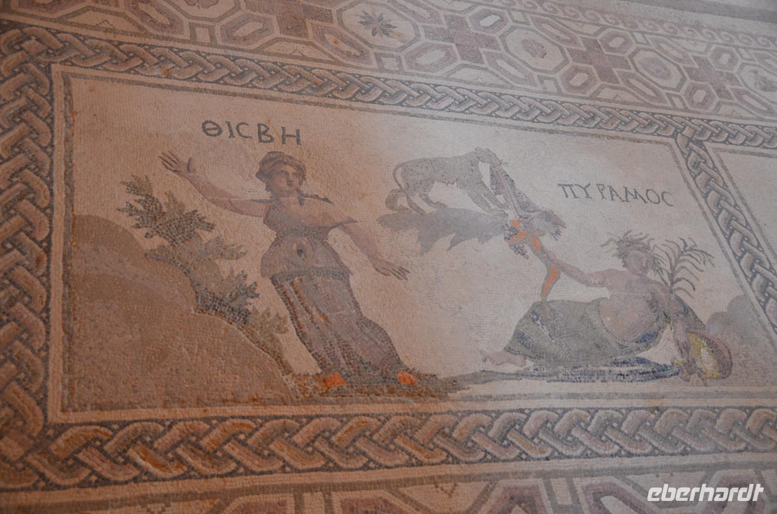 Auf Zypern leben 820.000 Menschen, davon 17.000 in Paphos. In der früheren Hauptstadt besuchten wir zuerst das Haus des Dionysos mit seinen beeindruckenden Bodenmosaiken. Die Größe von 2000 m² sowie die Dekorationen lassen auf großen Reichtum schließen. Das erste Mosaik wurde nicht an seiner jetzigen Stelle ausgegraben, sondern hier hin verlegt. Es ist das einzige aus dem 3. Jahrhundert v. Chr. wie die Kieselsteine verraten. Alle anderen Bildnisse auf dem Boden stammen aus dem 3. Jahrhundert nach Christus und befinden sich auch heute noch an ihrem originalen Platz. Auf dem ersten Mosaik erkennt man die Scylla mit Hundeköpfen und Drachenschwanz. Der Mythos besagt, dass das junge Mädchen nicht heiraten wollte. Sie wurde aber begehrt, darauf war die Hexe so neidisch, dass sie sie in ein Ungeheuer verwandelte. Das zweite Mosaik zeigt den Narziss. Auch er hielt nicht viel vom heiraten. Eines Tages sah er sein Spiegelbild in einem Fluss und verliebte sich in sich selbst, daher stammt auch der Begriff Narzissmus. Da dies bei den Göttern untersagt war, verwandelte ihn Zeus in eine Pflanze. Auch hier findet man wieder den Bezug zur Realität, die Narzissen. Wir waren begeistert von der Farbvielfalt der Steine und welche Emotionen in den Gesichtern der Figuren zu erkennen waren. Über die Holzbrücken ging es weiter zum nächsten Bild. Hier wurden die 4 Jahreszeiten dargestellt und in der Mitte der Gott des Weines, Dionysos. Man vermutet das dies der ehemalige Eingang des Hauses war, welcher der Ausgrabungsstelle ihren Namen gab. Das größte Mosaik zierte den Boden des ehemaligen Speiseraumes. Besonders interessant ist die rechte Seite der Darstellung. Man erkennt den Wagen des Dionysos mit den ersten Sklaven aus Indien. Das nächste Bildnis erinnerte uns an die Geschichte von Romeo & Julia. Gezeigt werden Thisbe und Pyramus. In der Sage erlaubten die Familien der beiden Verliebten keine Hochzeit, so mussten sie sich heimlich treffen. Hier lauerte ein Löwe und verjagte die junge Frau. Dabei verlor sie ihren Schleier, mit welchem das Tier spielte, als Pyramus zum Treffpunkt kam. Er glaubte, der Löwe habe seine Geliebte getötet. Mit diesem Schmerz wollte er nicht leben, sodass er sich erstach. Als Thisbe ihren Liebsten so am Boden liegen sah, brachte auch sie sich um. Daneben lässt sich der Mythos des Ikarios erkennen. Eines Tages besuchte Dionysos in Menschengestalt die Erde, wodurch er nicht erkannt wurde. Nur ein Hirte nahm ihn bei sich auf. Als Dank dafür lehrte ihm Dionysos die Weinherstellung und Ikarios wurde zum ersten Winzer der Welt. Jedoch sollte er den Wein für sich behalten. Dieses Versprechen hielt er nicht und teilte den Traubensaft. Man sah ihn betrunken unter einem Baum schlafen. Das Dorf dachte, dass er sie mit dem Wein vergiften wollte und steinigten ihn. Auf den nächsten Mosaiken werden zahlreiche Götter, wie Poseidon, Athen, Apollo und Zeus, wie er als Adler den Ganymede mit seiner Kralle in den Olymp zieht, dargestellt. Das letzte Bild im Haus des Dionysos zeigt die Jagd auf die Mufflons, die auch heute noch die größten Säugetiere auf Zypern sind.