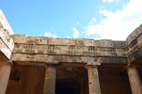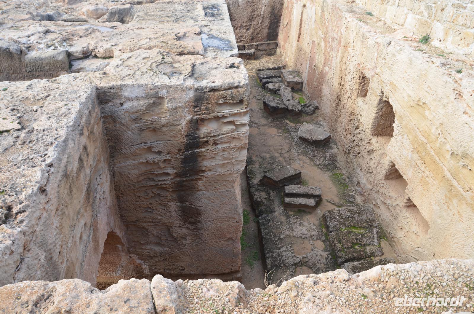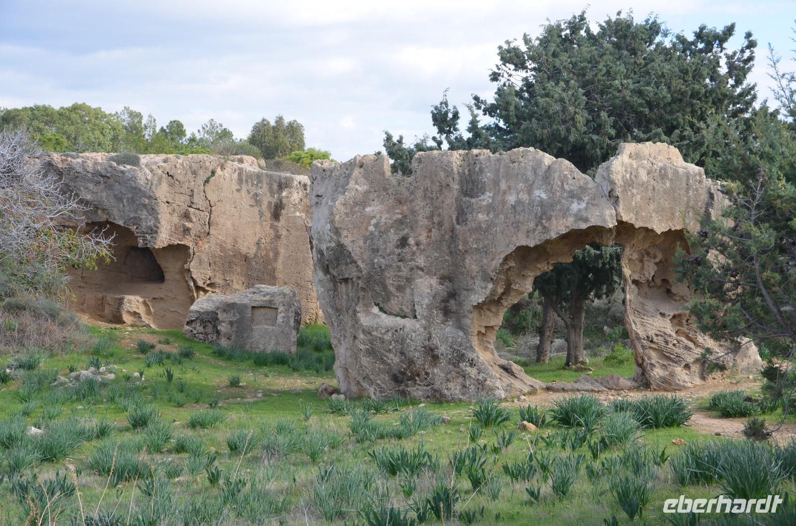 Nach einem kurzen Spaziergang zurück zum Bus, fuhren wir weiter zu den Königsgräbern. Unter den Johannisbrotbäumen probierten wir den süßen Weihnachtskuchen Melo Macaroni von Antonis. Frisch gestärkt liefen wir zu den Grabstätten. Sie wurden 400 v. Chr. erbaut. Auf der Insel gab es keine Könige. Der Name entstand fälschlicher Weise, da man glaubte, dass so prächtige Gräber nur für den Adel bestimmt gewesen sein können. Hier wurden aber bis 300 n. Chr. Beamte bestattet. Im 4. Jahrhundert nach Christus wurden die Gräber als Katakomben der Mönche genutzt. Später, ab dem 14. Jahrhundert nutzen die Menschen die in Stein geschlagenen Räume als Wohnraum und Ställe.