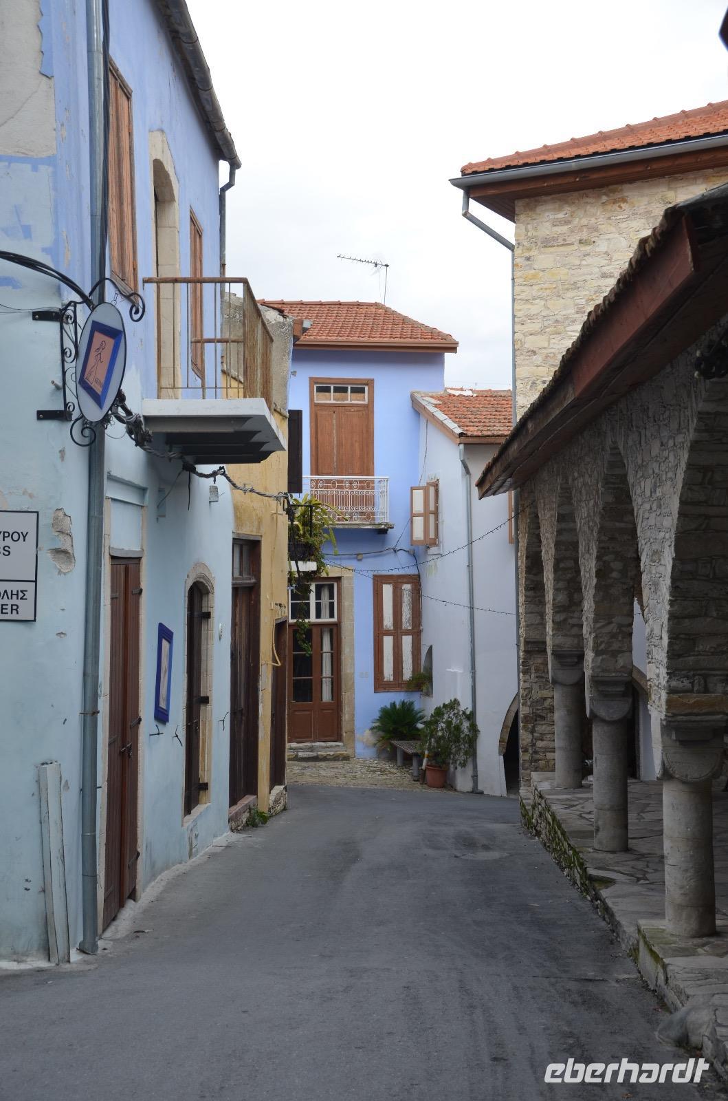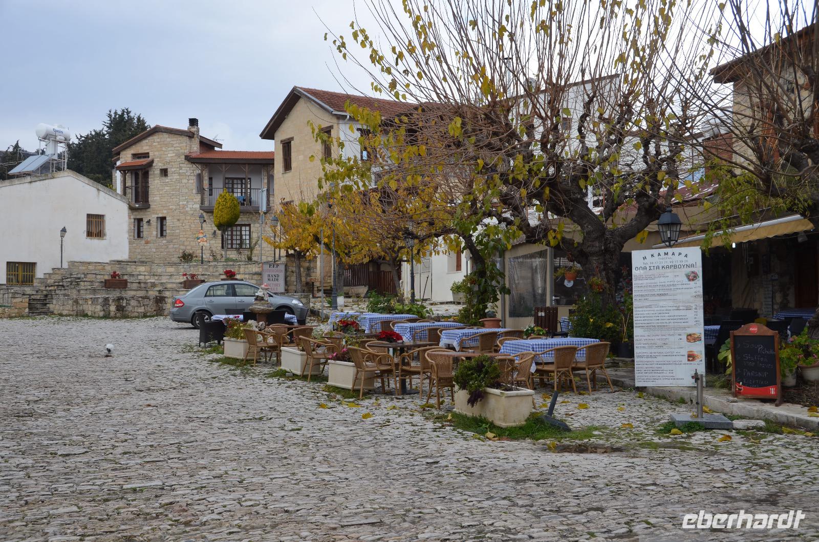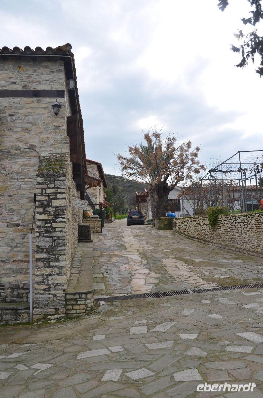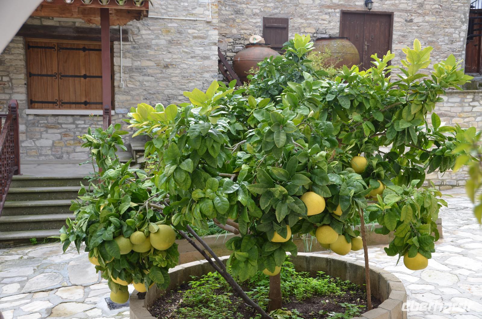 Das erste Weindorf, welches wir besichtigten, war Arsos. Es erhielt seinen Namen von dem ehemaligen Waldgebiet hier in der Gegend. Schon bei der Ankunft fiel auf, dass es sehr ruhig und verlassen wirkt. Einige Häuser werden hier für Individualtouristen vermietet, die jetzt im Dezember nicht anzutreffen sind. Wir kamen an Bäumen vorbei, die teilweise eingesponnen waren. Wie uns Antonis erklärte, stammen diese Fäden von der Prozessionsraupe. Auf dem Hauptplatz des niedlichen Dorfes kehrten wir in ein Café ein, um einen Mokka zu trinken und die Mandarinen von hier zu probieren. Auffallend war, dass hier nur ältere Männer saßen. Die einzigen Frauen, die wir antrafen, war die Besitzerin. Die Wände hingen voller gerahmter Fotos von Bischöfen und Freiheitskämpfern. Das gab den Räumlichkeiten einen ganz besonderen Charme. In der benachbarten Kirche bekamen wir eine Führung vom Priester persönlich. Mittlerweile kannten wir uns in den orthodoxen Gotteshäusern ganz gut aus. Doch das besondere in der Kirche des Heiligen Philippos war der Gesang des altgriechischen Psalms von dem Priester. Während das Licht durch die oberen Fenster in den Raum fiel, war eine sehr bedächtige Stimmung in der Kirche aus dem 13. Jahrhundert. Das ruhige Dorf, in dem mittlerweile nur noch 200 Menschen leben, wo es 1915 noch 1.600 Einwohner waren, versprühte einen ganz eigenen Flair.