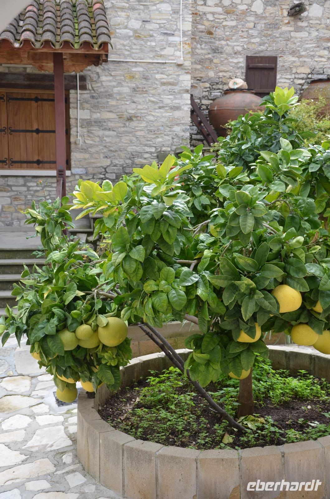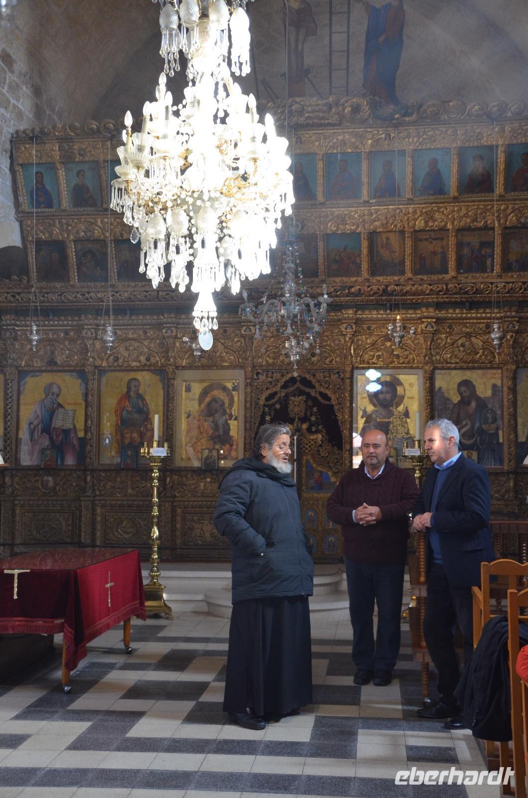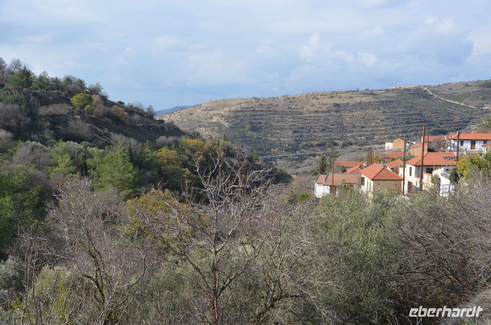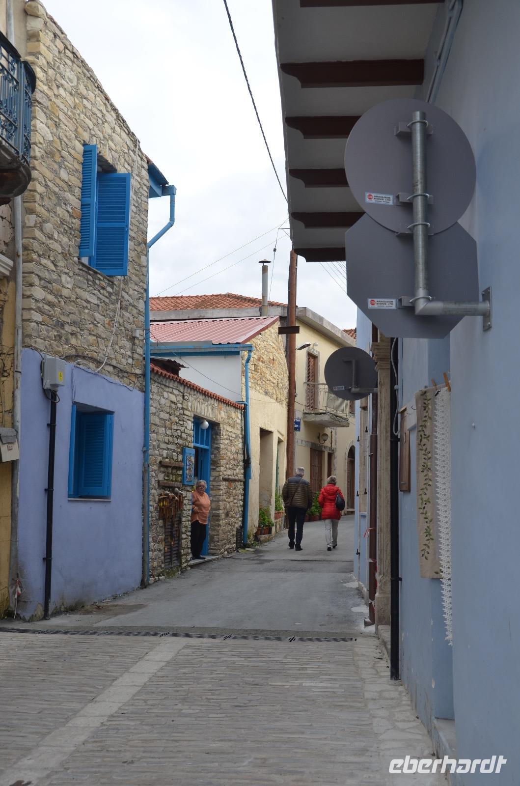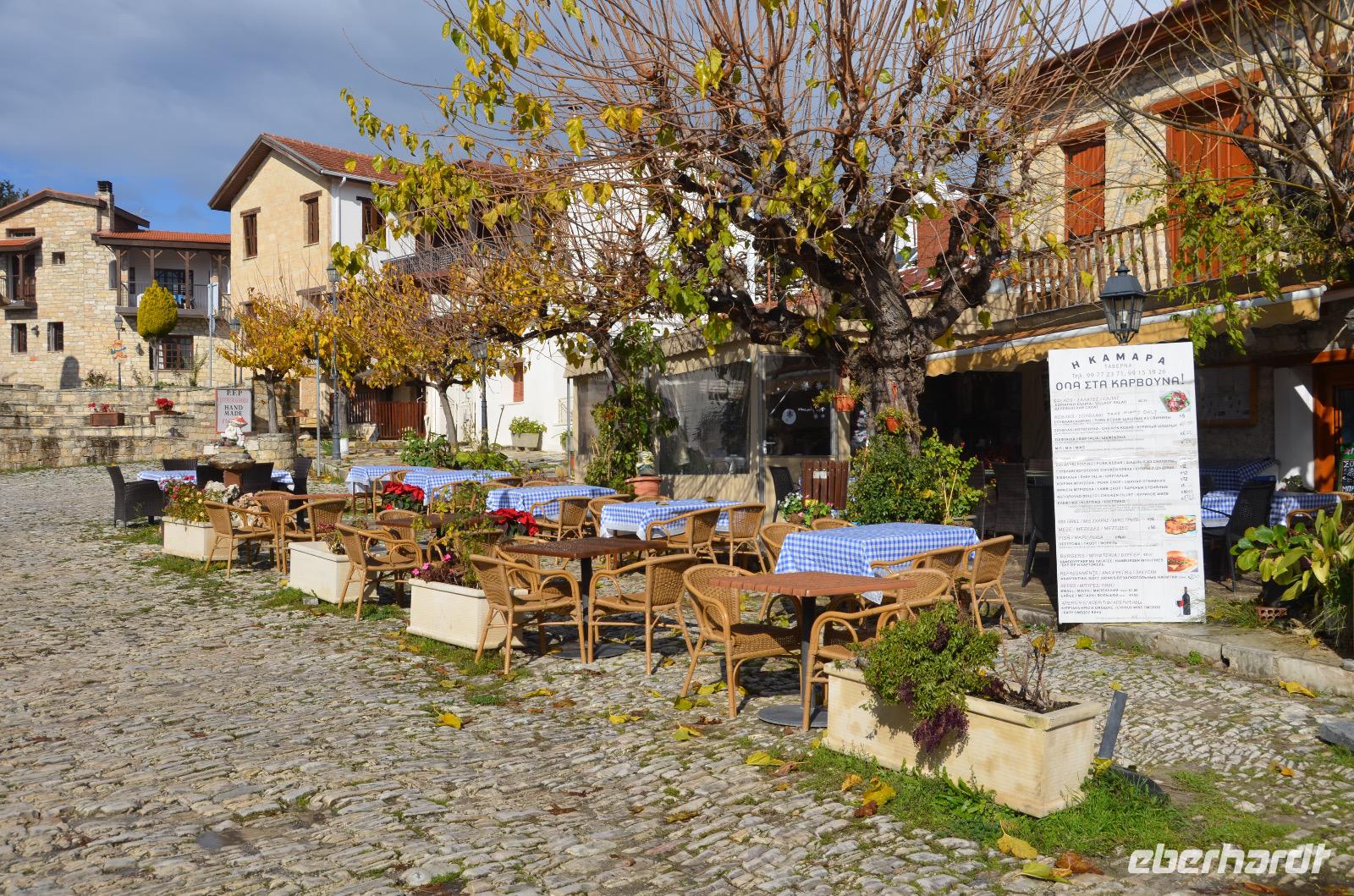 Das erste Weindorf, welches wir besichtigten, war Arsos. Es erhielt seinen Namen von dem ehemaligen Waldgebiet hier in der Gegend. Schon bei der Ankunft fiel auf, dass es sehr ruhig und verlassen wirkt. Einige Häuser werden hier für Individualtouristen vermietet, die jetzt im Dezember nicht anzutreffen sind. Wir kamen an Bäumen vorbei, die teilweise eingesponnen waren. Wie uns Antonis erklärte, stammen diese Fäden von der Prozessionsraupe. Auf dem Hauptplatz des niedlichen Dorfes kehrten wir in ein Café ein, um einen Mokka zu trinken und die Mandarinen von hier zu probieren. Auffallend war, dass hier nur ältere Männer saßen. Die einzigen Frauen, die wir antrafen, war die Besitzerin. Die Wände hingen voller gerahmter Fotos von Bischöfen und Freiheitskämpfern. Das gab den Räumlichkeiten einen ganz besonderen Charme. In der benachbarten Kirche bekamen wir eine Führung vom Priester persönlich. Mittlerweile kannten wir uns in den orthodoxen Gotteshäusern ganz gut aus. Doch das besondere in der Kirche des Heiligen Philippos war der Gesang des altgriechischen Psalms von dem Priester. Während das Licht durch die oberen Fenster in den Raum fiel, war eine sehr bedächtige Stimmung in der Kirche aus dem 13. Jahrhundert. Das ruhige Dorf, in dem mittlerweile nur noch 200 Menschen leben, wo es 1915 noch 1.600 Einwohner waren, versprühte einen ganz eigenen Flair.