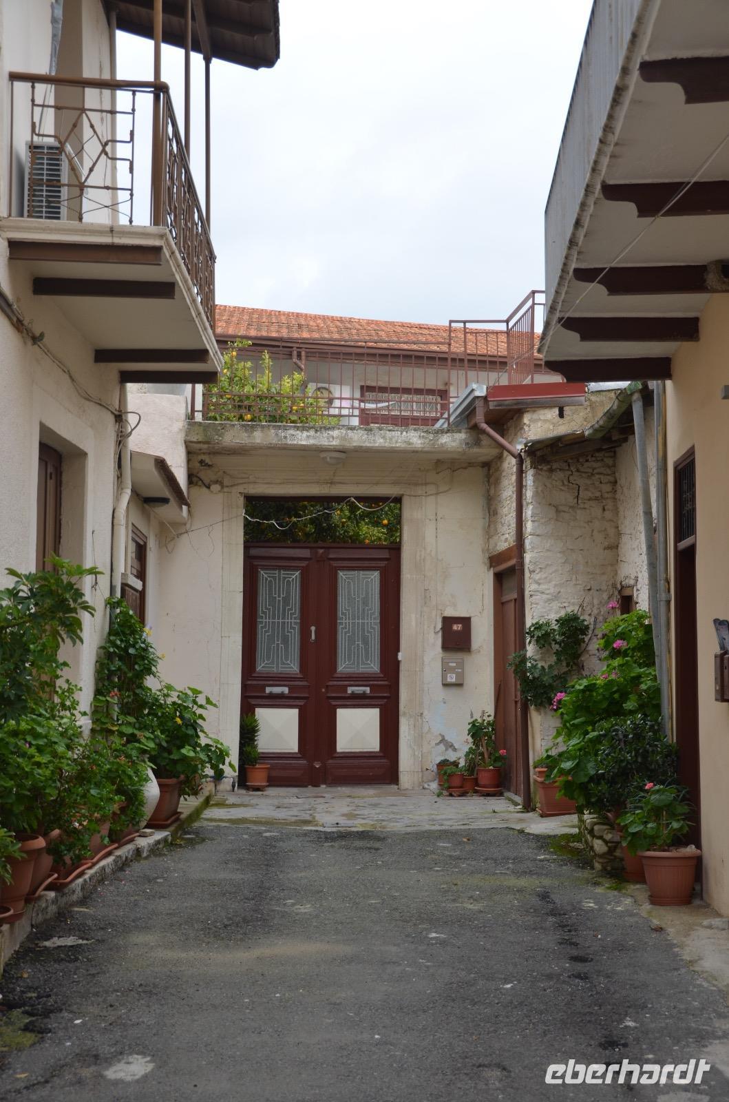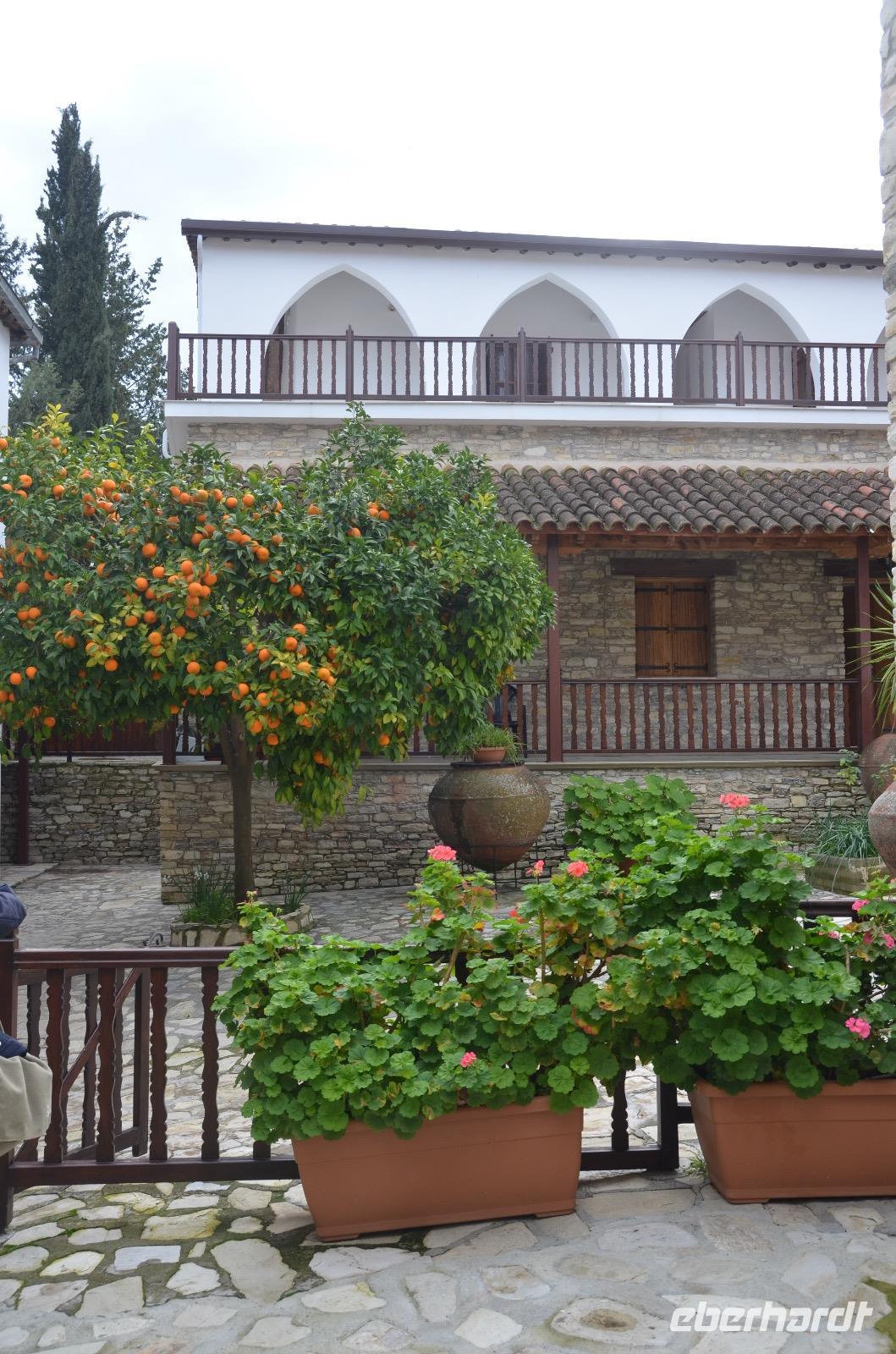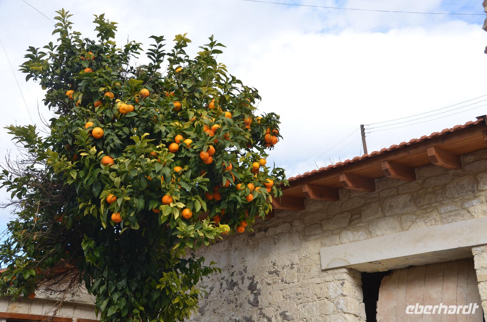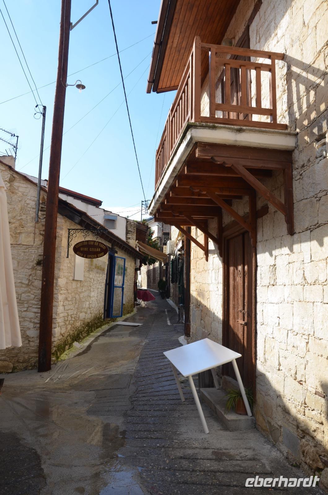 Das erste Weindorf, welches wir besichtigten, war Arsos. Es erhielt seinen Namen von dem ehemaligen Waldgebiet hier in der Gegend. Schon bei der Ankunft fiel auf, dass es sehr ruhig und verlassen wirkt. Einige Häuser werden hier für Individualtouristen vermietet, die jetzt im Dezember nicht anzutreffen sind. Wir kamen an Bäumen vorbei, die teilweise eingesponnen waren. Wie uns Antonis erklärte, stammen diese Fäden von der Prozessionsraupe. Auf dem Hauptplatz des niedlichen Dorfes kehrten wir in ein Café ein, um einen Mokka zu trinken und die Mandarinen von hier zu probieren. Auffallend war, dass hier nur ältere Männer saßen. Die einzigen Frauen, die wir antrafen, war die Besitzerin. Die Wände hingen voller gerahmter Fotos von Bischöfen und Freiheitskämpfern. Das gab den Räumlichkeiten einen ganz besonderen Charme. In der benachbarten Kirche bekamen wir eine Führung vom Priester persönlich. Mittlerweile kannten wir uns in den orthodoxen Gotteshäusern ganz gut aus. Doch das besondere in der Kirche des Heiligen Philippos war der Gesang des altgriechischen Psalms von dem Priester. Während das Licht durch die oberen Fenster in den Raum fiel, war eine sehr bedächtige Stimmung in der Kirche aus dem 13. Jahrhundert. Das ruhige Dorf, in dem mittlerweile nur noch 200 Menschen leben, wo es 1915 noch 1.600 Einwohner waren, versprühte einen ganz eigenen Flair.
