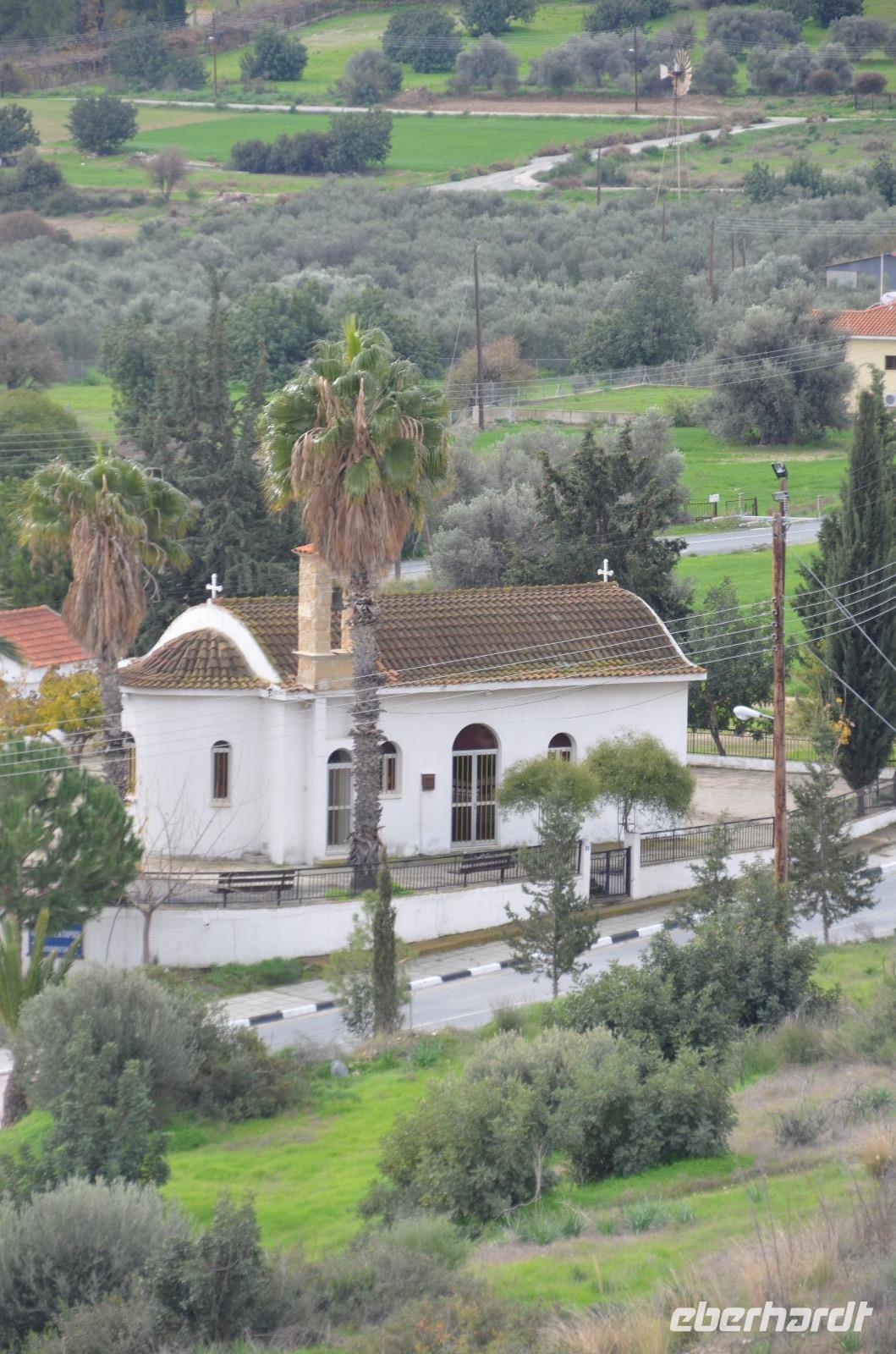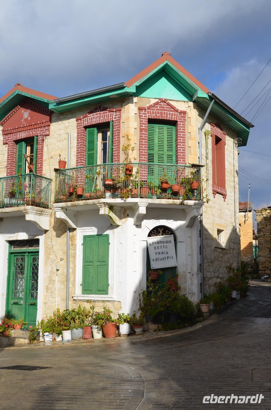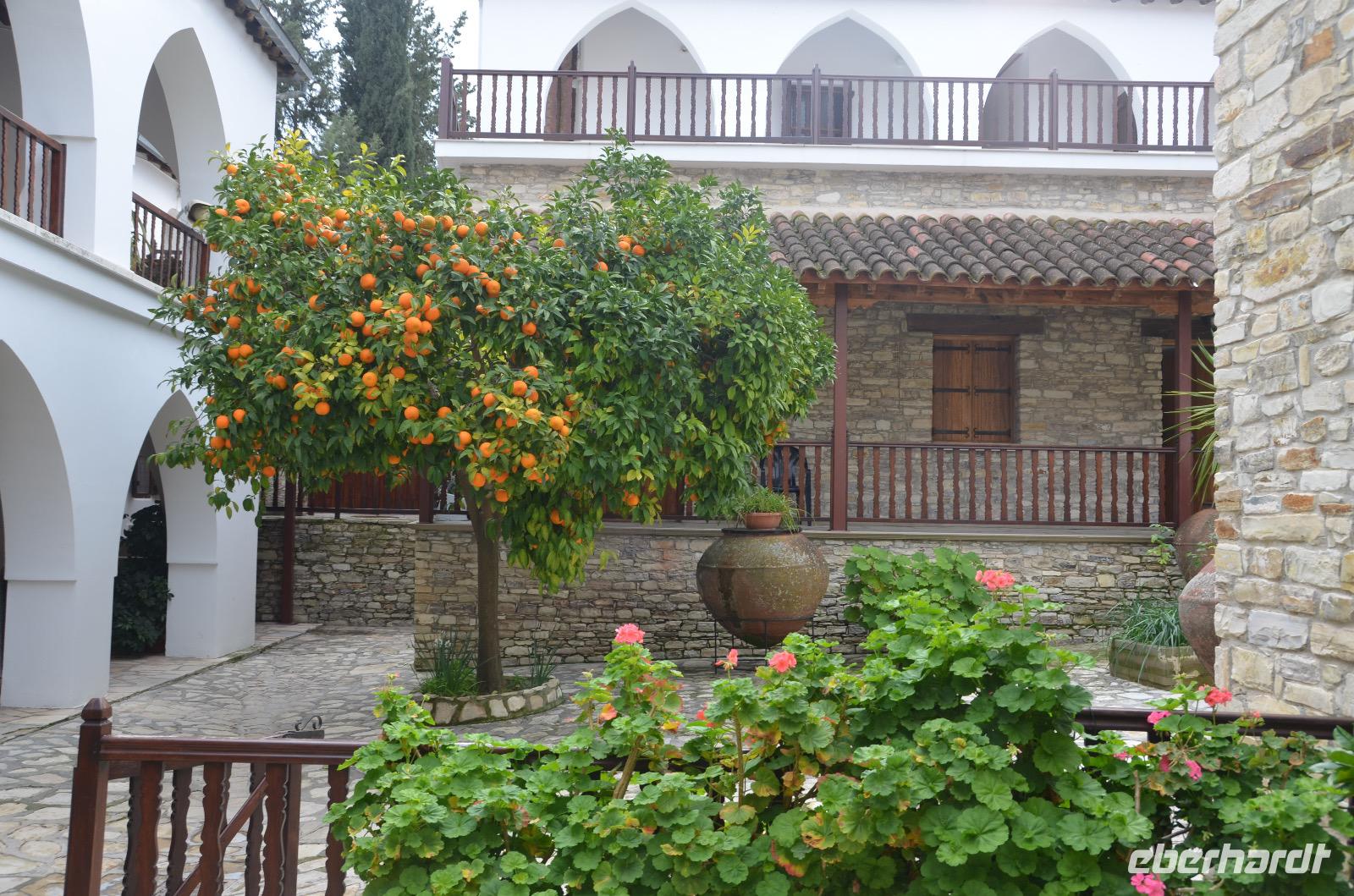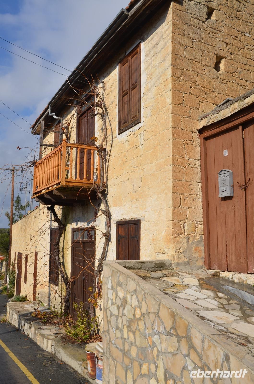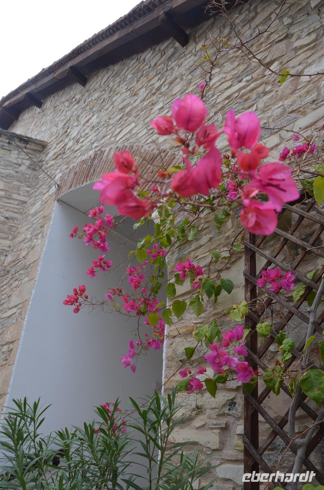 Das erste Weindorf, welches wir besichtigten, war Arsos. Es erhielt seinen Namen von dem ehemaligen Waldgebiet hier in der Gegend. Schon bei der Ankunft fiel auf, dass es sehr ruhig und verlassen wirkt. Einige Häuser werden hier für Individualtouristen vermietet, die jetzt im Dezember nicht anzutreffen sind. Wir kamen an Bäumen vorbei, die teilweise eingesponnen waren. Wie uns Antonis erklärte, stammen diese Fäden von der Prozessionsraupe. Auf dem Hauptplatz des niedlichen Dorfes kehrten wir in ein Café ein, um einen Mokka zu trinken und die Mandarinen von hier zu probieren. Auffallend war, dass hier nur ältere Männer saßen. Die einzigen Frauen, die wir antrafen, war die Besitzerin. Die Wände hingen voller gerahmter Fotos von Bischöfen und Freiheitskämpfern. Das gab den Räumlichkeiten einen ganz besonderen Charme. In der benachbarten Kirche bekamen wir eine Führung vom Priester persönlich. Mittlerweile kannten wir uns in den orthodoxen Gotteshäusern ganz gut aus. Doch das besondere in der Kirche des Heiligen Philippos war der Gesang des altgriechischen Psalms von dem Priester. Während das Licht durch die oberen Fenster in den Raum fiel, war eine sehr bedächtige Stimmung in der Kirche aus dem 13. Jahrhundert. Das ruhige Dorf, in dem mittlerweile nur noch 200 Menschen leben, wo es 1915 noch 1.600 Einwohner waren, versprühte einen ganz eigenen Flair.