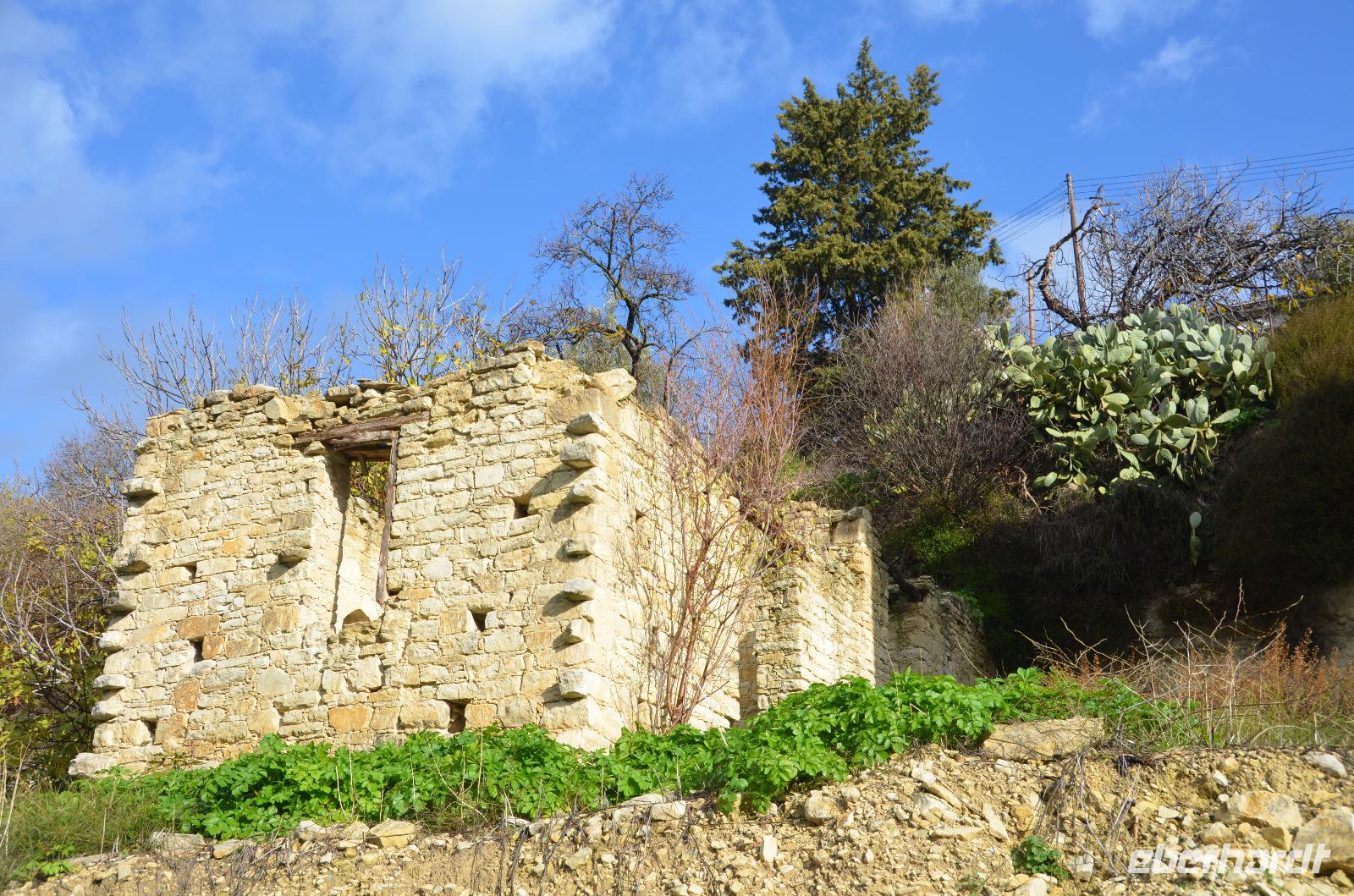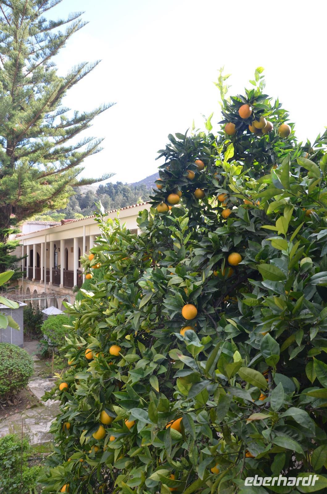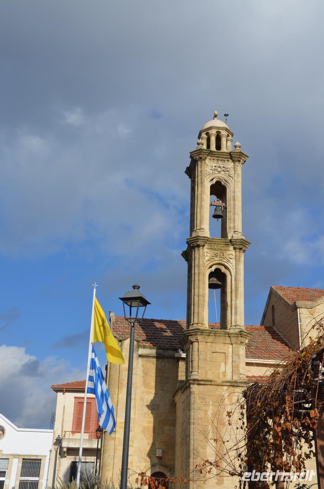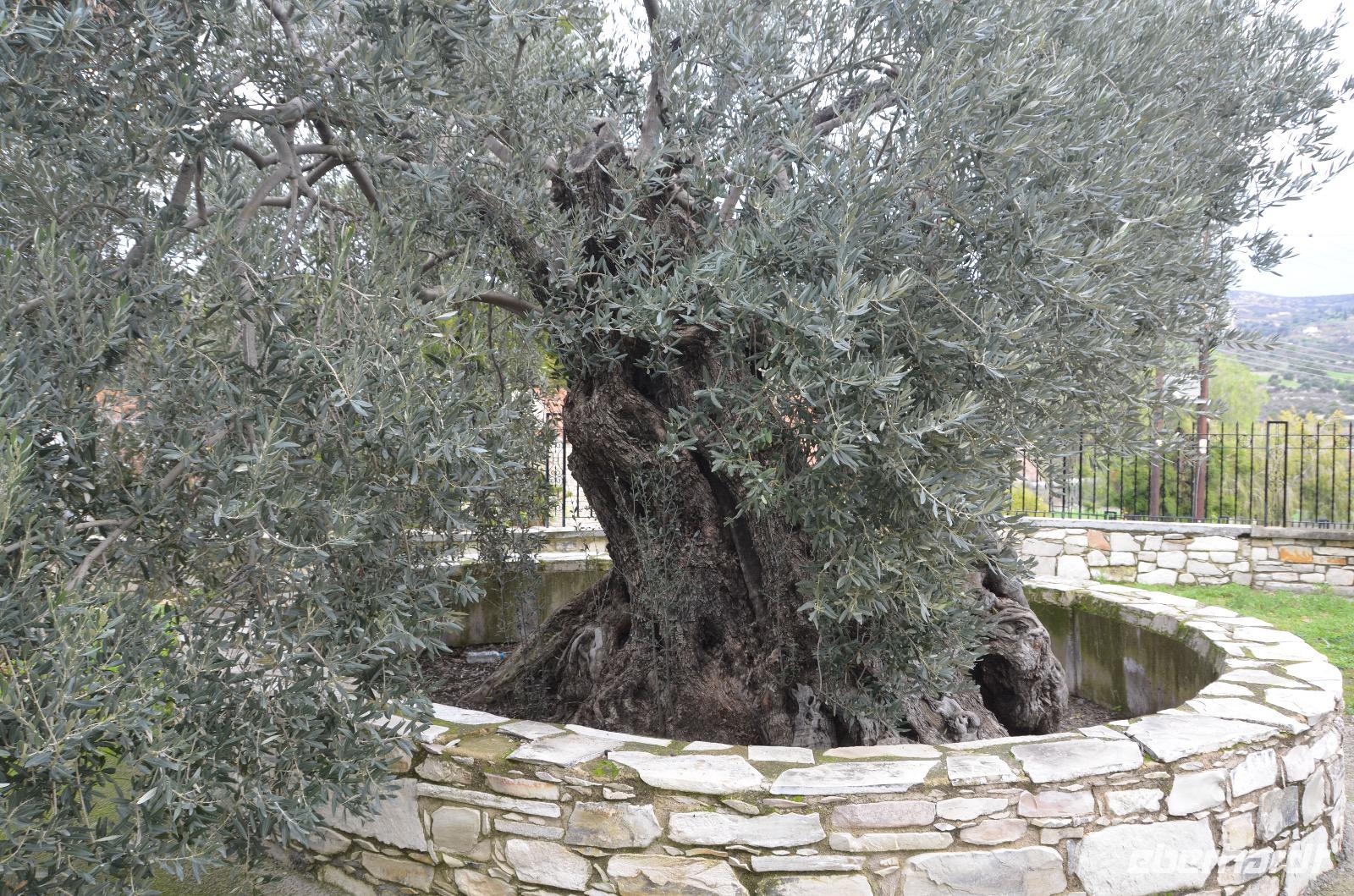Das erste Weindorf, welches wir besichtigten, war Arsos. Es erhielt seinen Namen von dem ehemaligen Waldgebiet hier in der Gegend. Schon bei der Ankunft fiel auf, dass es sehr ruhig und verlassen wirkt. Einige Häuser werden hier für Individualtouristen vermietet, die jetzt im Dezember nicht anzutreffen sind. Wir kamen an Bäumen vorbei, die teilweise eingesponnen waren. Wie uns Antonis erklärte, stammen diese Fäden von der Prozessionsraupe. Auf dem Hauptplatz des niedlichen Dorfes kehrten wir in ein Café ein, um einen Mokka zu trinken und die Mandarinen von hier zu probieren. Auffallend war, dass hier nur ältere Männer saßen. Die einzigen Frauen, die wir antrafen, war die Besitzerin. Die Wände hingen voller gerahmter Fotos von Bischöfen und Freiheitskämpfern. Das gab den Räumlichkeiten einen ganz besonderen Charme. In der benachbarten Kirche bekamen wir eine Führung vom Priester persönlich. Mittlerweile kannten wir uns in den orthodoxen Gotteshäusern ganz gut aus. Doch das besondere in der Kirche des Heiligen Philippos war der Gesang des altgriechischen Psalms von dem Priester. Während das Licht durch die oberen Fenster in den Raum fiel, war eine sehr bedächtige Stimmung in der Kirche aus dem 13. Jahrhundert. Das ruhige Dorf, in dem mittlerweile nur noch 200 Menschen leben, wo es 1915 noch 1.600 Einwohner waren, versprühte einen ganz eigenen Flair.