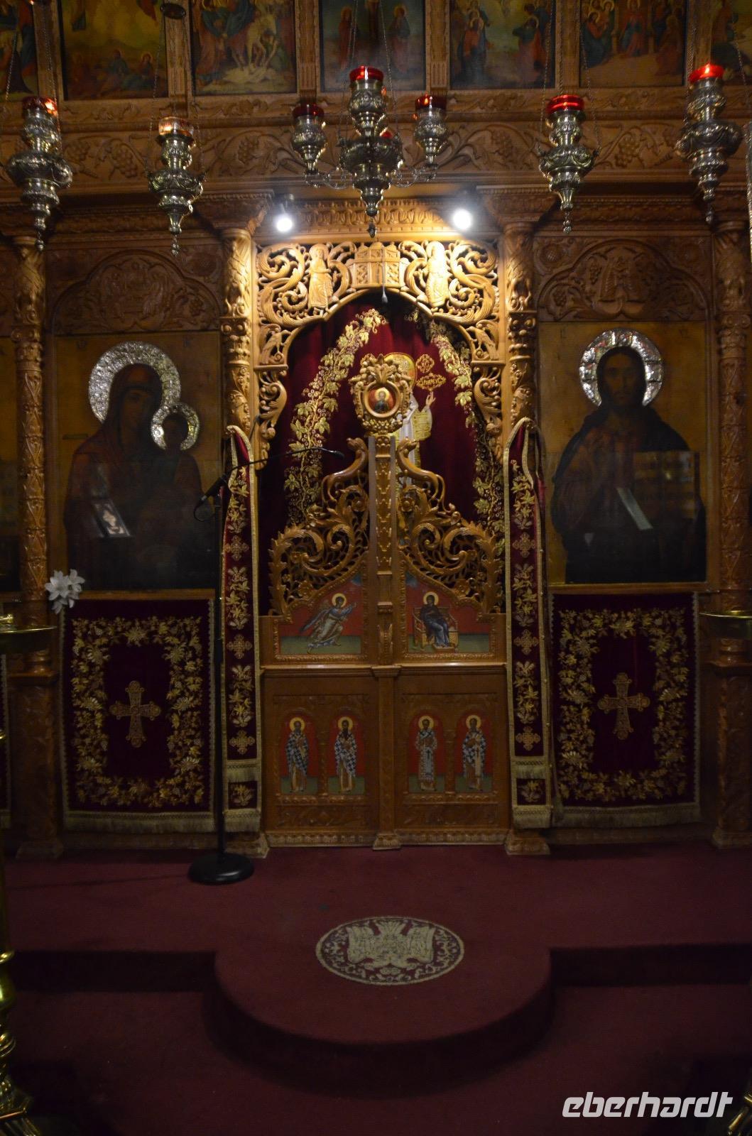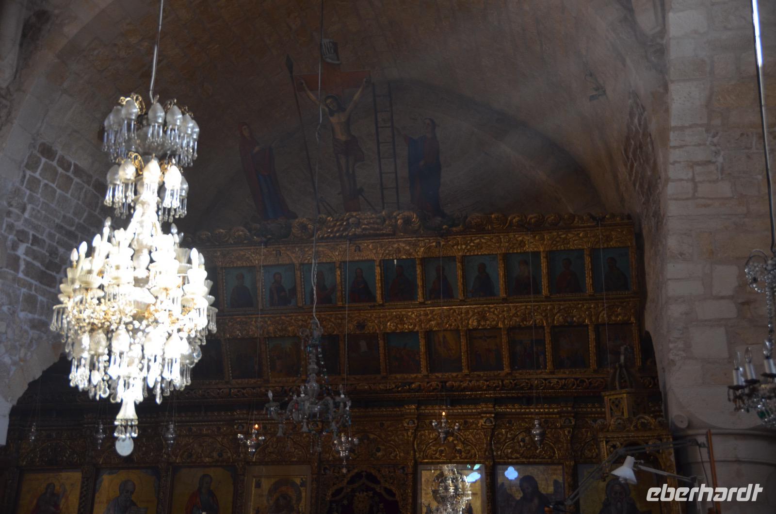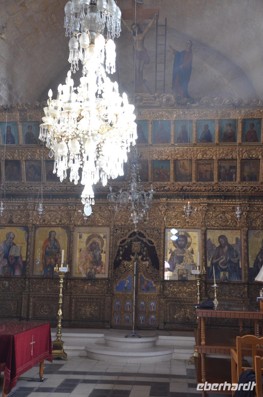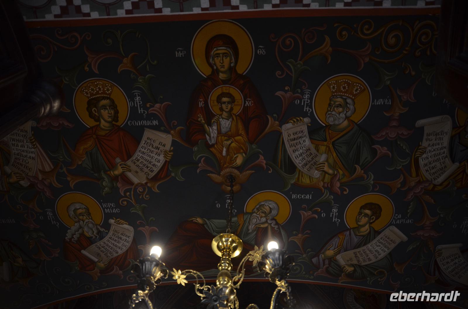 Direkt daneben befindet sich die kleine Kathedrale Agios Ioannis. Ganz vorn befindet sich die sehr prunkvolle Ikonenwand. Mit dem gekreuzigten Jesus ganz oben, links davon die Jungfrau Maria und rechts von ihm der heilige Johannes, nach dem die Kirche benannt ist. Darunter befinden sich die 12 Apostel. Beim Eintreten wird man Erschlagen von den mächtigen Farben und dem vielen Gold, was man der winzigen Kathedrale von außen gar nicht ansieht. Das Symbol des heiligen Johannes lässt sich am anderen Ende der Kirche entdecken, der Adler. Darüber befindet sich eine zweite Etage, die vor allem für die Frauen mit ihren Kindern vorgesehen war. Auf der linken Seite des Raumes befinden sich 16 Plätze für die Bischöfe und rechts ein Platz für den Erzbischof. An den gesamten Wänden kann man beeindruckende Fresken bestaunen. Im vorderen Teil wird das alte Testament und im Hinteren das Neue, also das Leben von Jesus dargestellt. Eine sehr sehr seltene Freske ist die Beschneidung Jesu, welche man hier entdecken kann. Antonis weist uns auf eine weitere Besonderheit hin, denn bei der Kreuzigung Jesu, findet man in der unteren Bildecke türkische Soldaten. Hiermit setzt der Maler bewusst ein politisches Symbol. Neben dem Kircheneingang wird sowohl das Paradies, als auch die Hölle gezeigt. Diese zwei Darstellungen sollen die Menschen zum richtigen Handeln animieren. Besonders beeindruckend ist Freske von Jesus Stammbaum. Aus seinem Bauch entspringt der Stamm und in den Zweigen, die daraus wachsen findet sich seine Familie wieder.