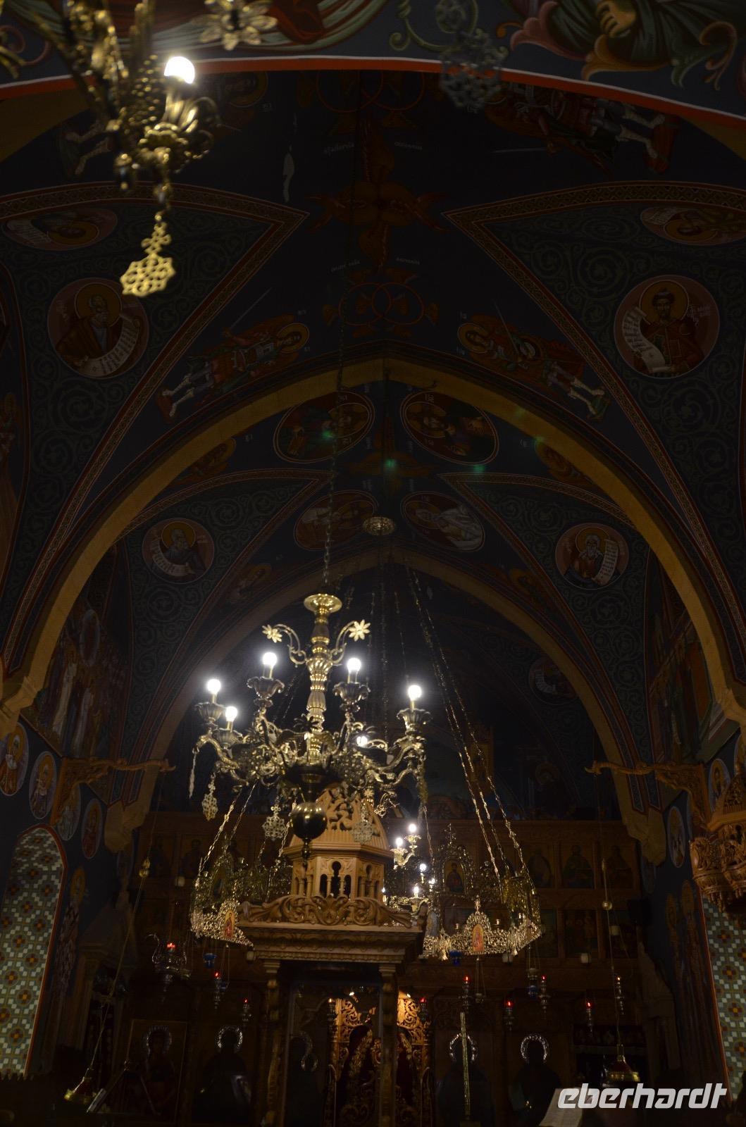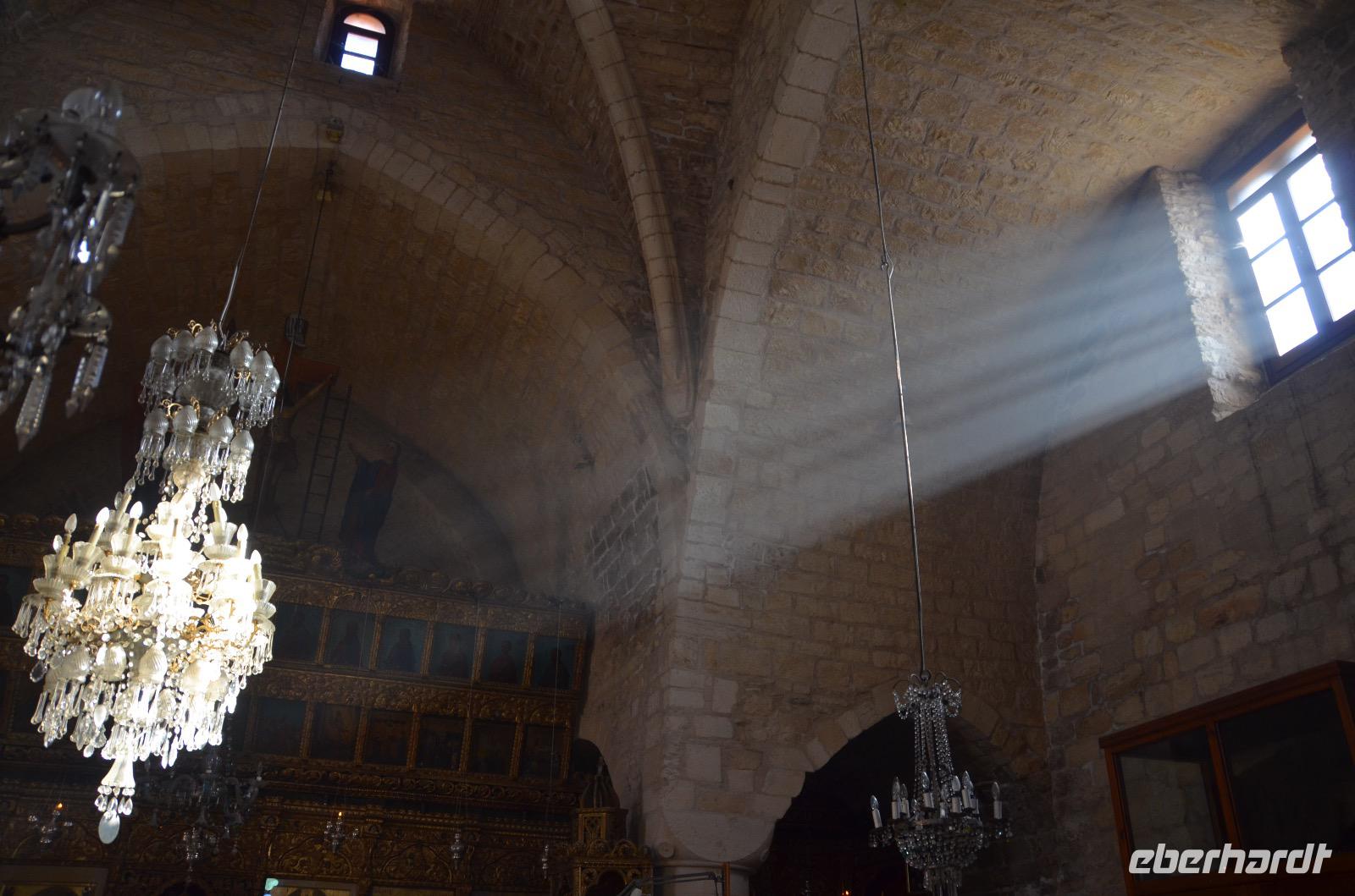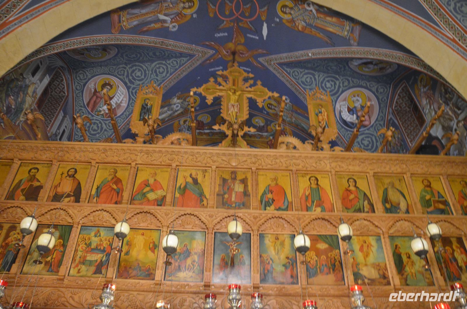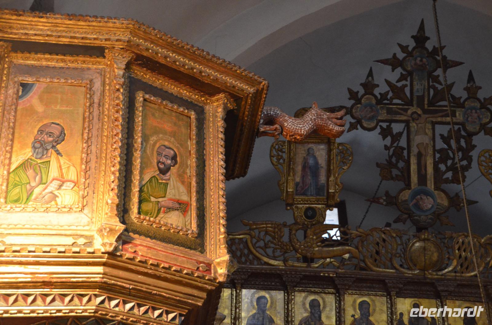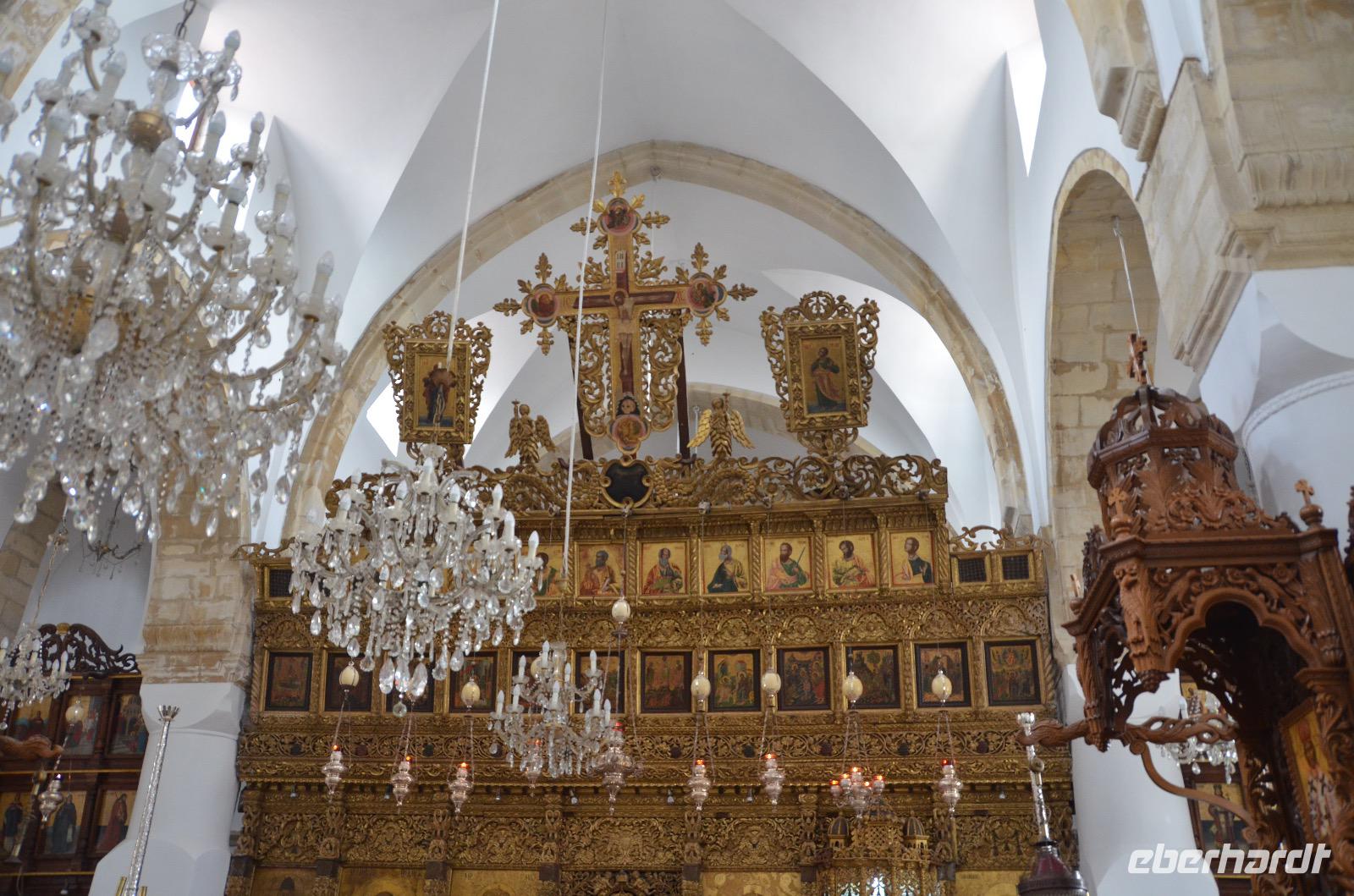 Direkt daneben befindet sich die kleine Kathedrale Agios Ioannis. Ganz vorn befindet sich die sehr prunkvolle Ikonenwand. Mit dem gekreuzigten Jesus ganz oben, links davon die Jungfrau Maria und rechts von ihm der heilige Johannes, nach dem die Kirche benannt ist. Darunter befinden sich die 12 Apostel. Beim Eintreten wird man Erschlagen von den mächtigen Farben und dem vielen Gold, was man der winzigen Kathedrale von außen gar nicht ansieht. Das Symbol des heiligen Johannes lässt sich am anderen Ende der Kirche entdecken, der Adler. Darüber befindet sich eine zweite Etage, die vor allem für die Frauen mit ihren Kindern vorgesehen war. Auf der linken Seite des Raumes befinden sich 16 Plätze für die Bischöfe und rechts ein Platz für den Erzbischof. An den gesamten Wänden kann man beeindruckende Fresken bestaunen. Im vorderen Teil wird das alte Testament und im Hinteren das Neue, also das Leben von Jesus dargestellt. Eine sehr sehr seltene Freske ist die Beschneidung Jesu, welche man hier entdecken kann. Antonis weist uns auf eine weitere Besonderheit hin, denn bei der Kreuzigung Jesu, findet man in der unteren Bildecke türkische Soldaten. Hiermit setzt der Maler bewusst ein politisches Symbol. Neben dem Kircheneingang wird sowohl das Paradies, als auch die Hölle gezeigt. Diese zwei Darstellungen sollen die Menschen zum richtigen Handeln animieren. Besonders beeindruckend ist Freske von Jesus Stammbaum. Aus seinem Bauch entspringt der Stamm und in den Zweigen, die daraus wachsen findet sich seine Familie wieder.