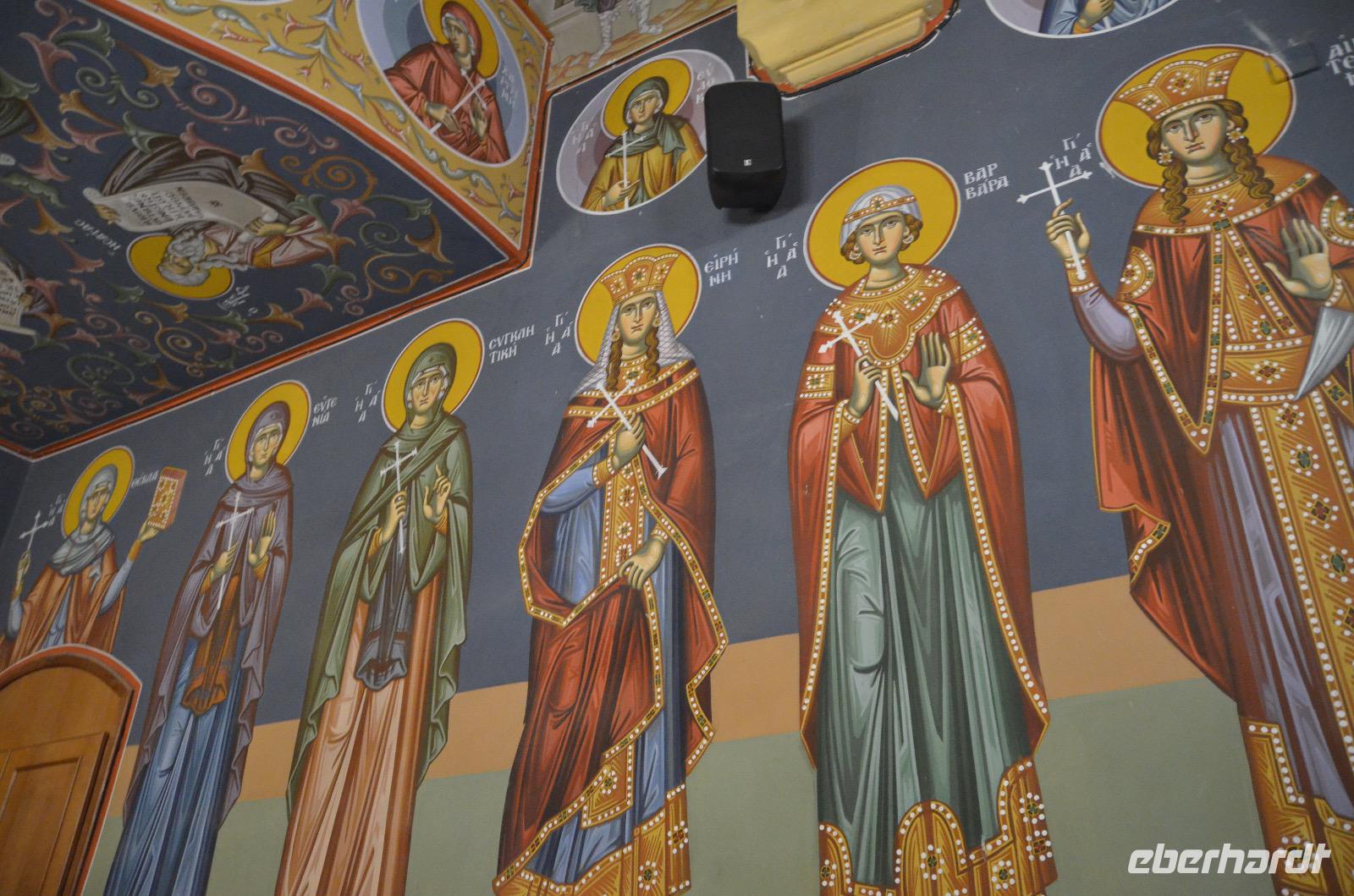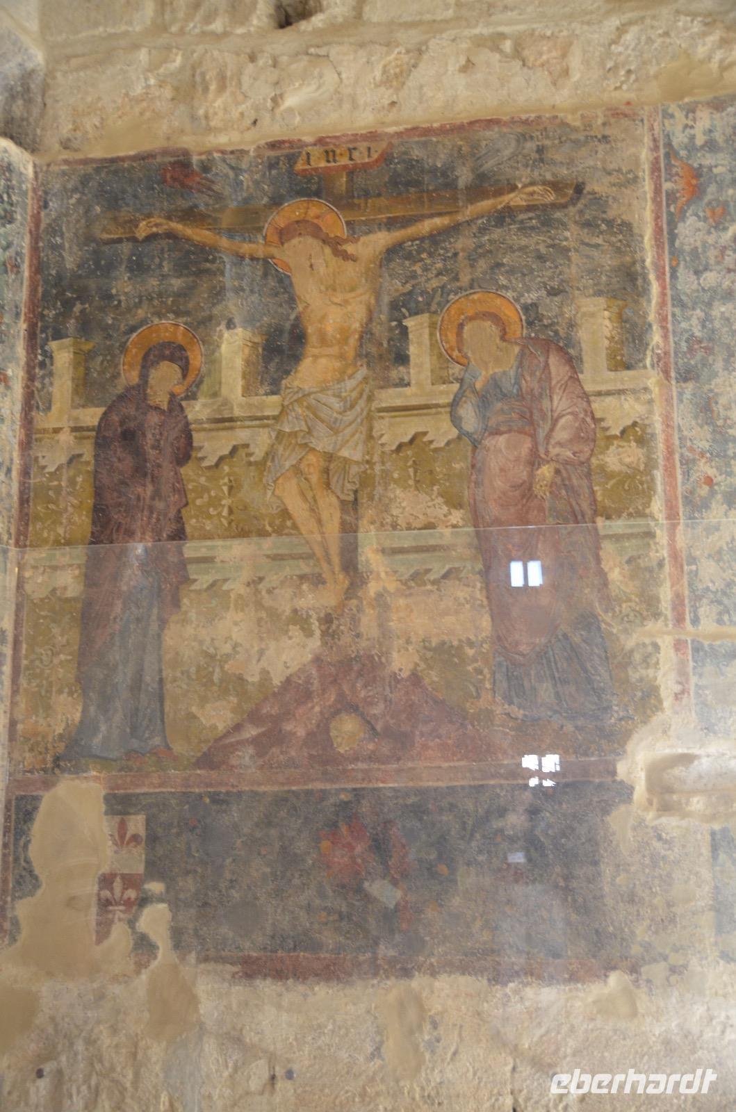 1500 wurde gegenüber der Höhlenkirche ein Kloster errichtet. In der Kirche stammen die Fresken aus der italo-byzantinischen Zeit. Die Mischung aus der italienischen und der byzantinischen Kunst erkennt man an den runden Gesichtern und den weißen Strichen unter den Augen. Somit konnten wir im angrenzenden Museum die Bilder in die richtige Zeit einordnen.