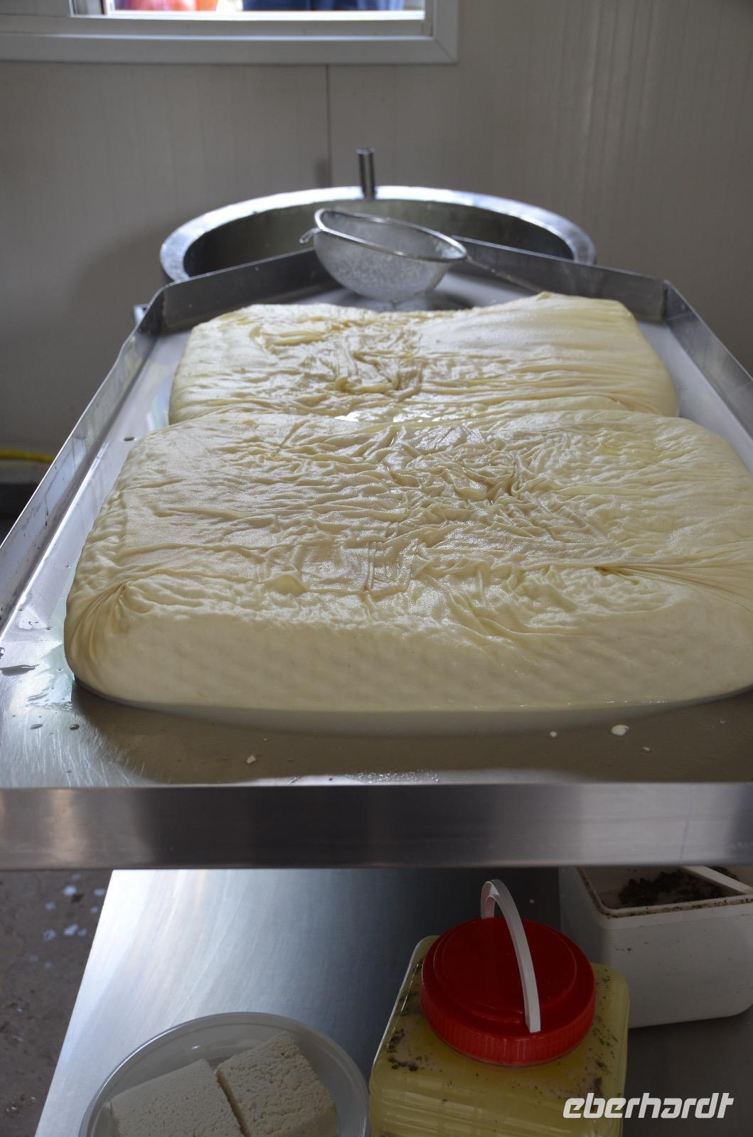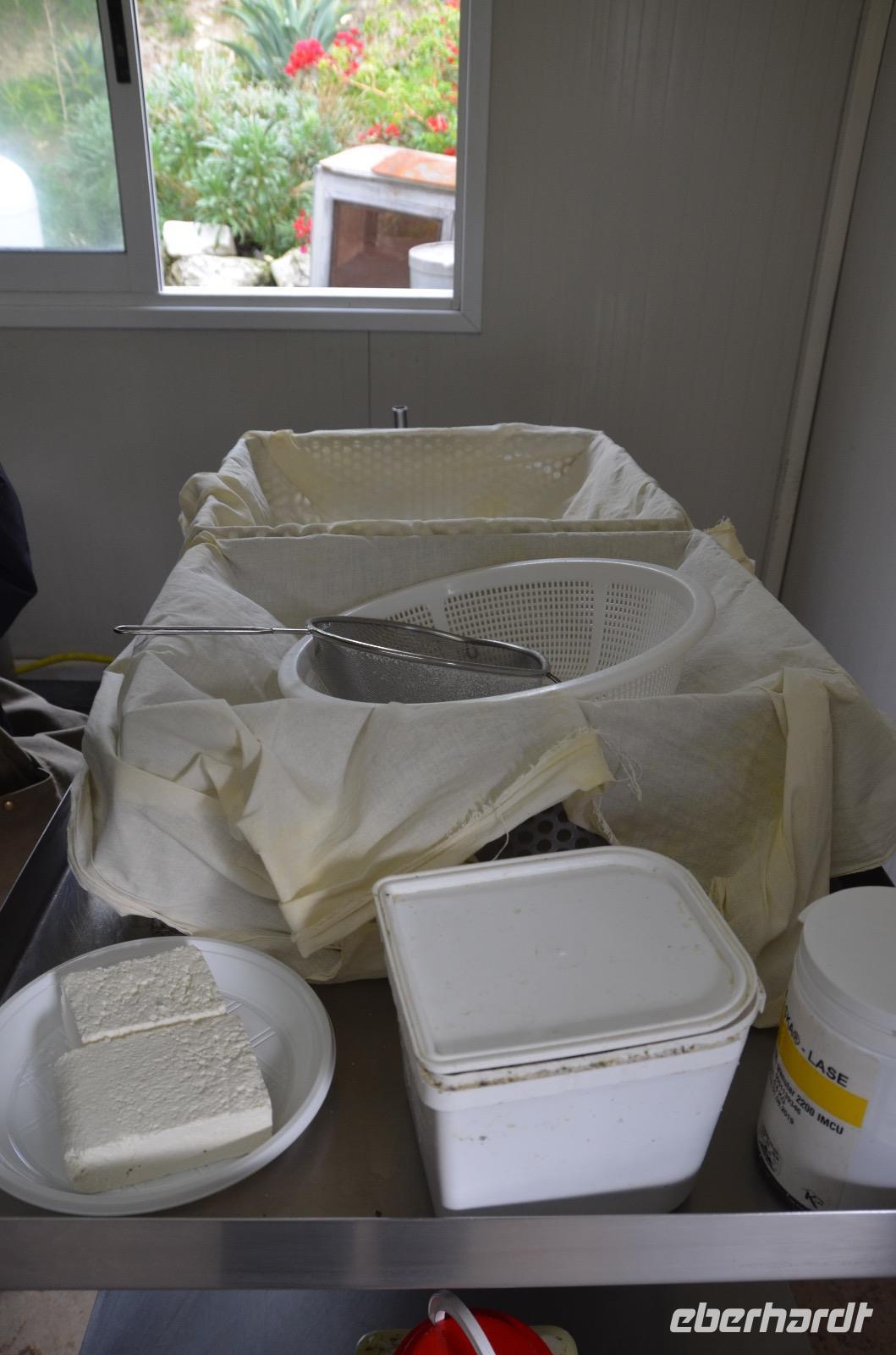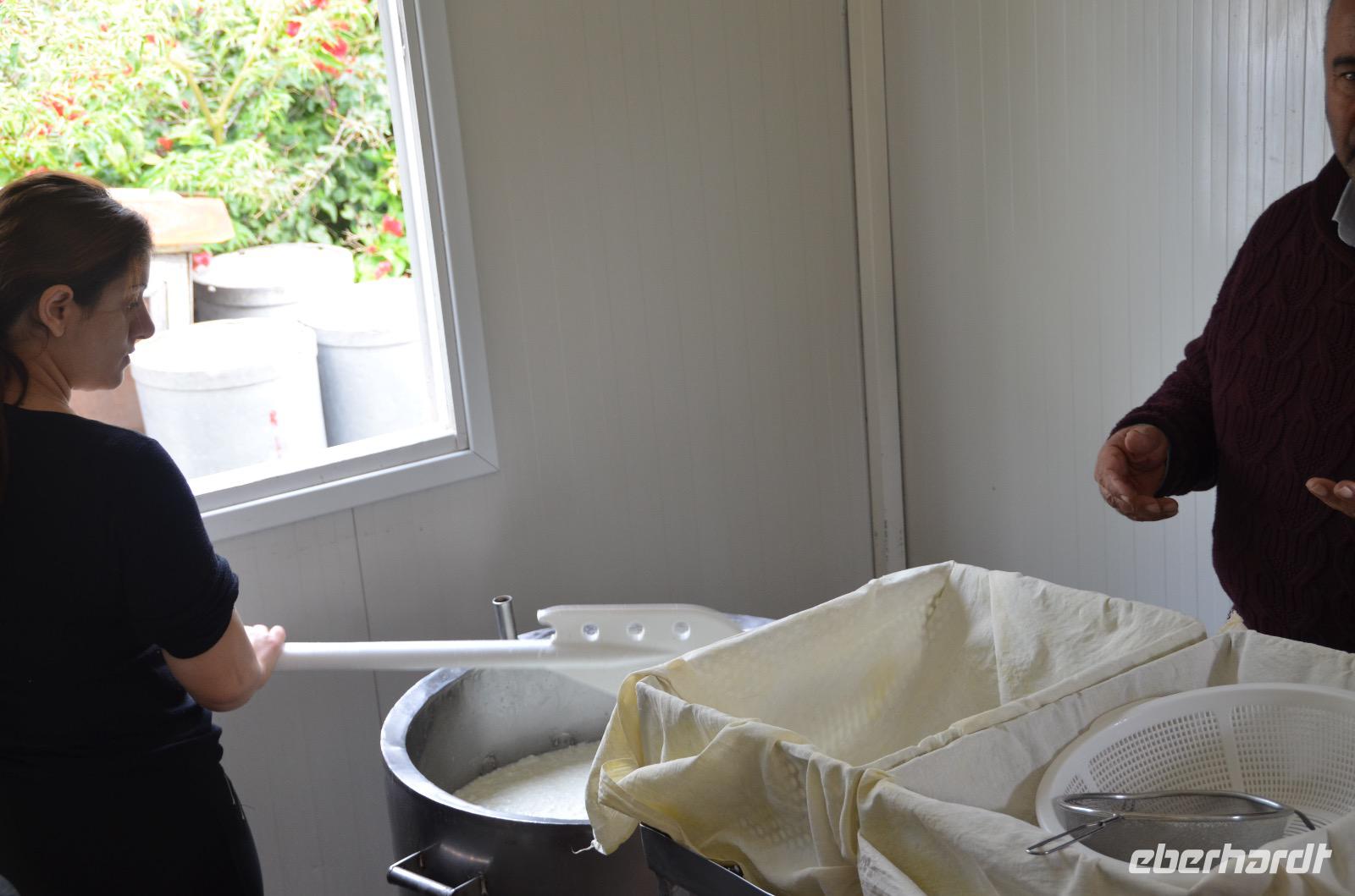 Wir fuhren weiter zu Loulas Farm. Sie besitzt über 200 Ziegen und stellt den leckeren, bekannten Halloumi-Käse her, welcher bei uns zuhause oft liebevoll Quietsche-Käse genannt wird. Die Tiere leben hier auf 100 ha Land verteilt und geben das ganze Jahr über Milch, in den Sommermonaten am meisten. Von den 200 Ziegen werden jeden Tag 150 Liter Milch verarbeitet. Für 6 kg des Halloumi-Käses benötigt man 10 kg Milch. Wir durften in dem kleinen Raum bei der Herstellung zuschauen. Man roch, dass hier Ziegenmilch verarbeitet wird. Als erstes wird die Flüssigkeit bei 30 Grad gekocht. In der Zwischenzeit waren wir in Loulas Haus zu einer Verkostung eingeladen. Es gab Brot, Tomaten, Gurke und selbstverständlich den selbst gemachten Käse. Dazu servierte sie uns Mokka-Kaffee und Wasser. Natürlich durften auch die Mandarinen aus der eigenen Ernte nicht fehlen. Wir fühlten uns sehr wohl und es war interessant zu sehen, wie die Zyprioten leben.