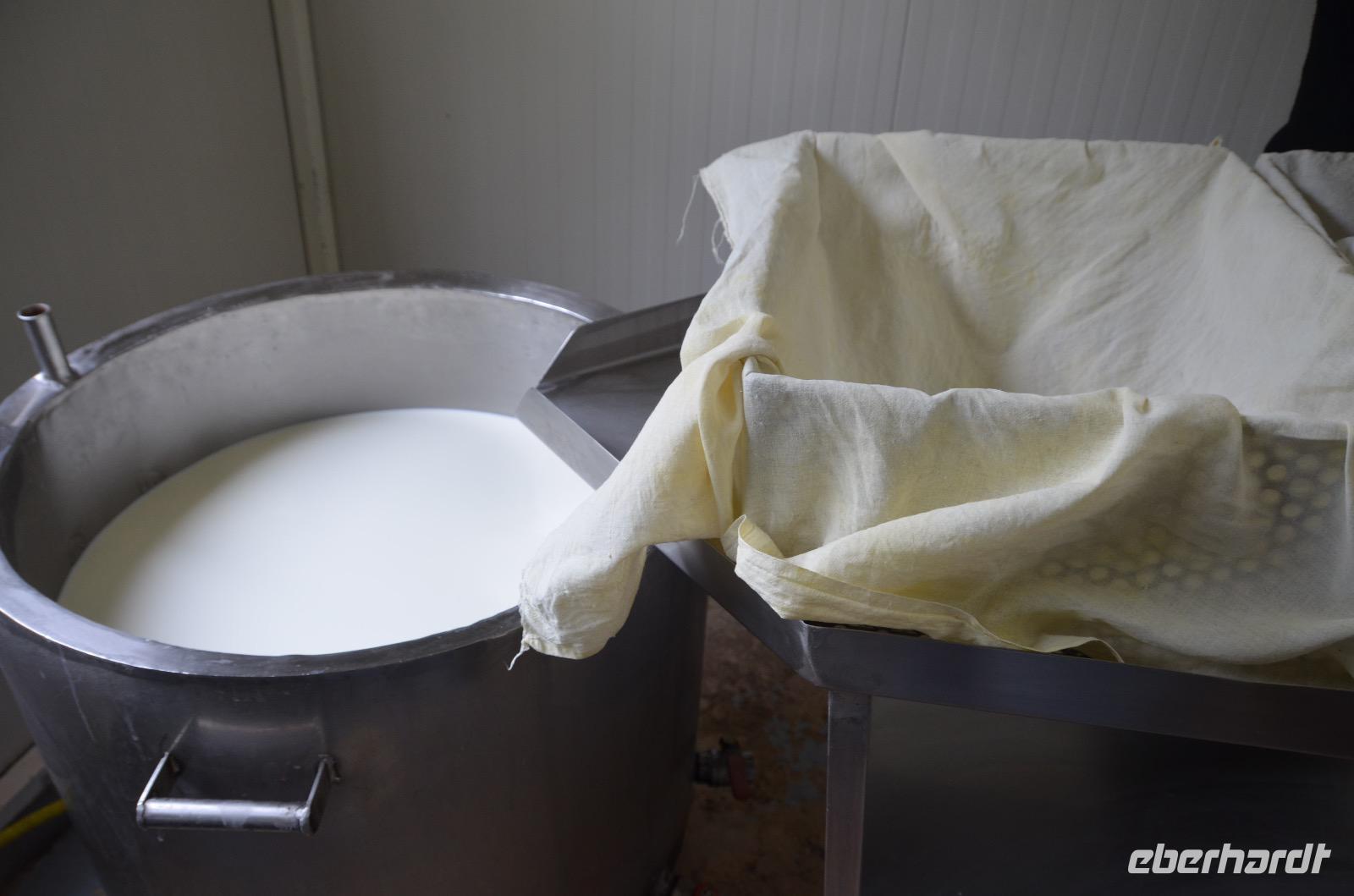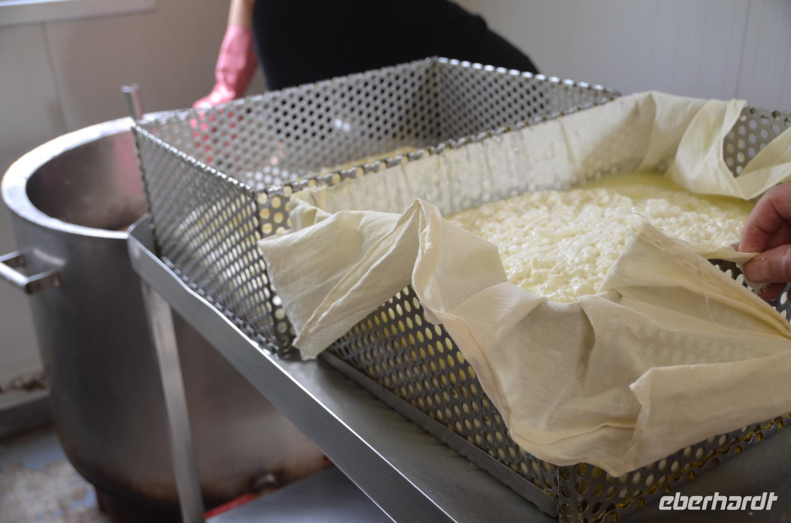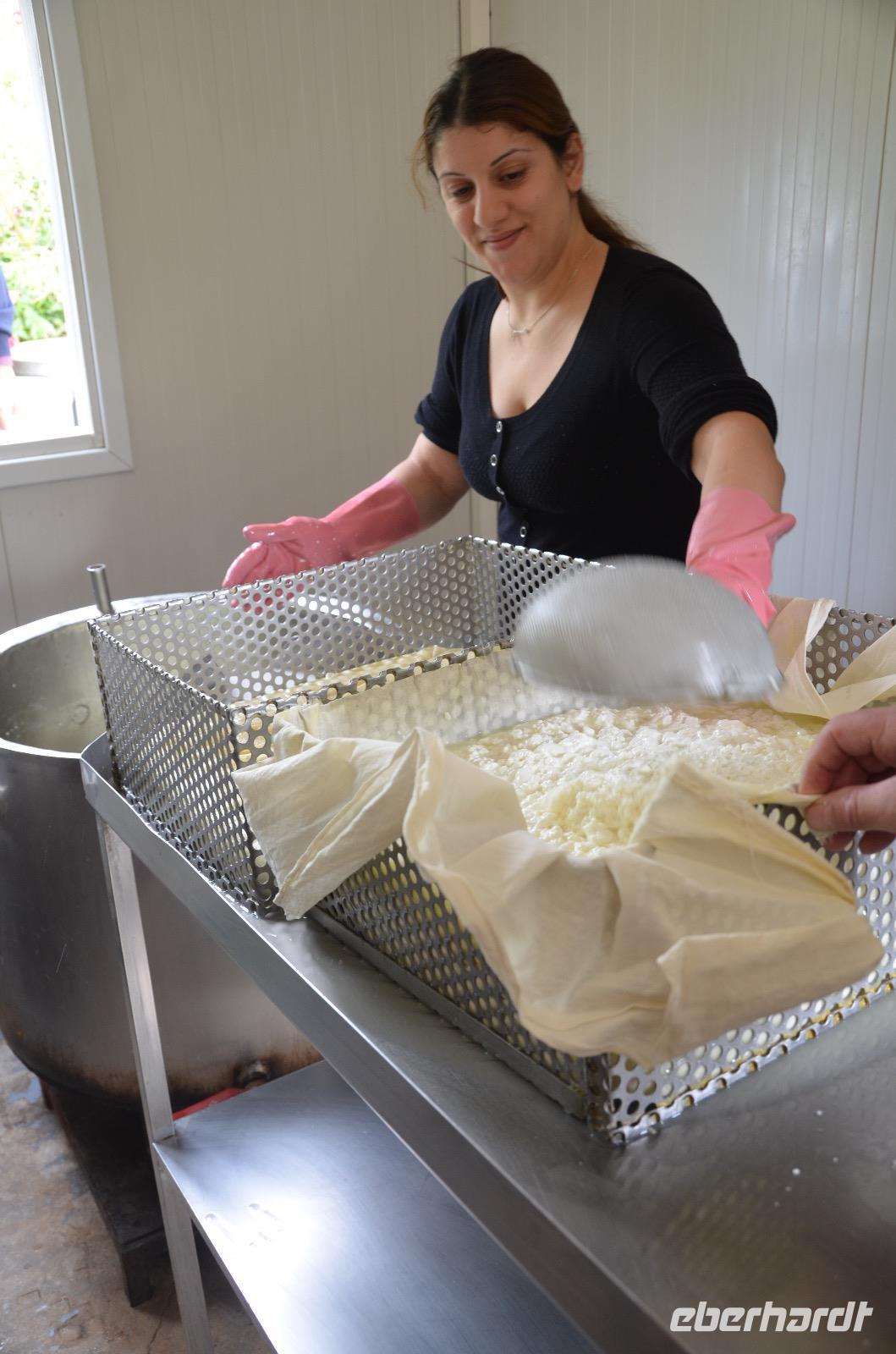 Wir fuhren weiter zu Loulas Farm. Sie besitzt über 200 Ziegen und stellt den leckeren, bekannten Halloumi-Käse her, welcher bei uns zuhause oft liebevoll Quietsche-Käse genannt wird. Die Tiere leben hier auf 100 ha Land verteilt und geben das ganze Jahr über Milch, in den Sommermonaten am meisten. Von den 200 Ziegen werden jeden Tag 150 Liter Milch verarbeitet. Für 6 kg des Halloumi-Käses benötigt man 10 kg Milch. Wir durften in dem kleinen Raum bei der Herstellung zuschauen. Man roch, dass hier Ziegenmilch verarbeitet wird. Als erstes wird die Flüssigkeit bei 30 Grad gekocht. In der Zwischenzeit waren wir in Loulas Haus zu einer Verkostung eingeladen. Es gab Brot, Tomaten, Gurke und selbstverständlich den selbst gemachten Käse. Dazu servierte sie uns Mokka-Kaffee und Wasser. Natürlich durften auch die Mandarinen aus der eigenen Ernte nicht fehlen. Wir fühlten uns sehr wohl und es war interessant zu sehen, wie die Zyprioten leben.