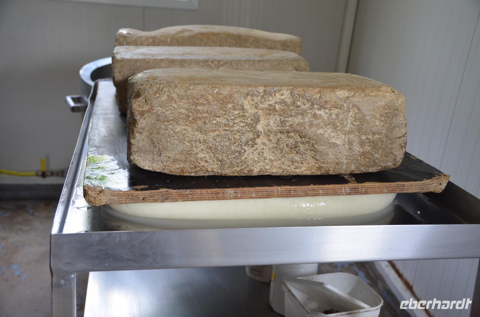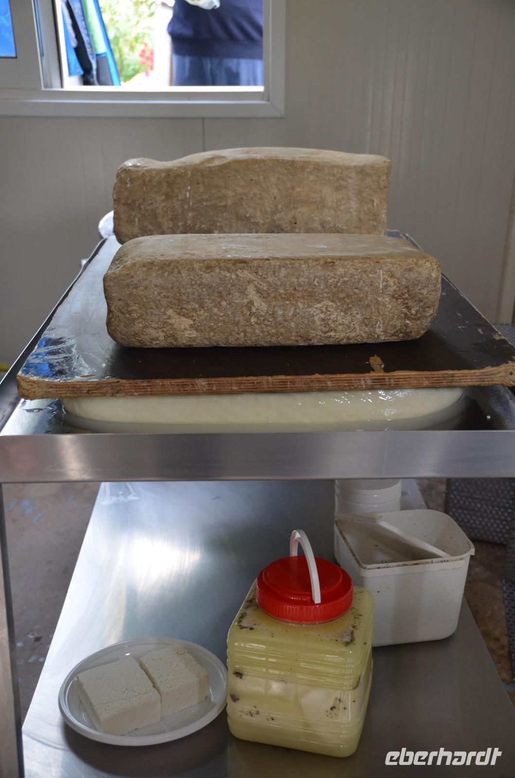 Nach der kleinen Stärkung ging es weiter mit der Käseherstellung. Wir beobachteten, wie der Käse aus der Molke geschöpft wird und in eine löchrige Kiste gegeben wird, die mit einem Leinentuch ausgelegt ist. Die Molke wird hinausgepresst und läuft durch die Löcher wieder in den Behälter. Dieser Vorgang wird mehrmals wiederholt. Danach wird der Käse mit den Tüchern zugedeckt und durch schwere Steine erneut gepresst. Zum Schluss wird der Halloumi wieder in der Molke mit Salz und Minze gekocht. Auch gelagert wird er in der Molke. Dadurch ist der Käse mindestens ein Jahr haltbar. Einige aus der Gruppe ließen es sich nicht nehmen, die Spezialität für zuhause zu kaufen. Zu einem guten Halloumi-Käse darf leckeres Olivenöl nicht fehlen. Also ging es ein paar Meter weiter zur Olivenpresse. Wir waren sehr beeindruckt und dankbar für die Fahrkünste unseres Busfahrers Nicholas auf den schmalen, steilen Bergstraßen.